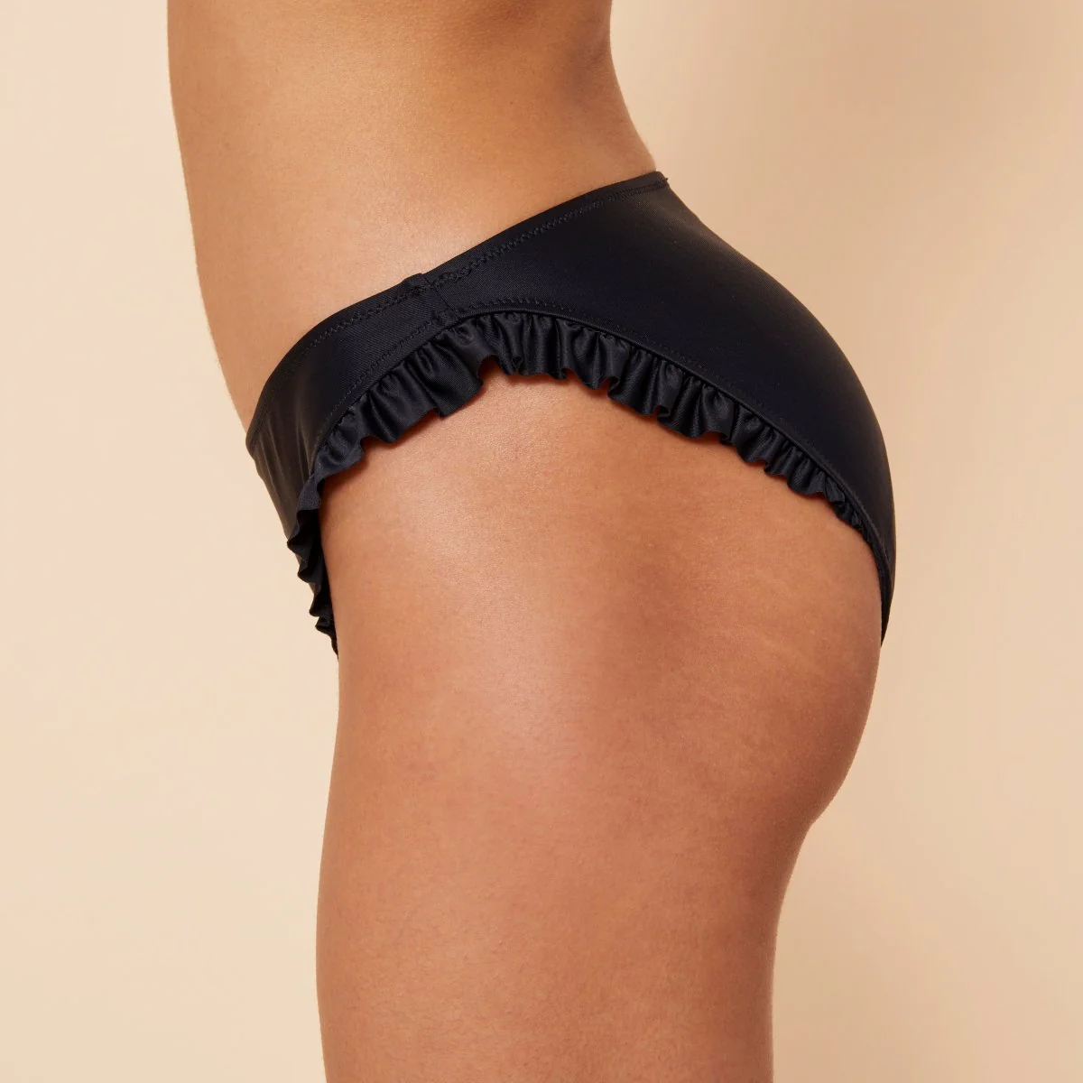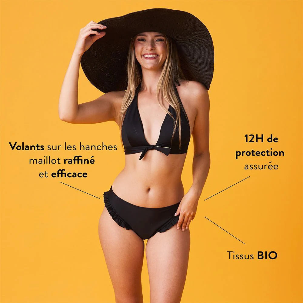 Bas de maillot de bain menstruel avec joli effet volanté sur les hanches. Raffiné et efficace. il va t’éviter le tampon qui dépasse du maillot 😜.