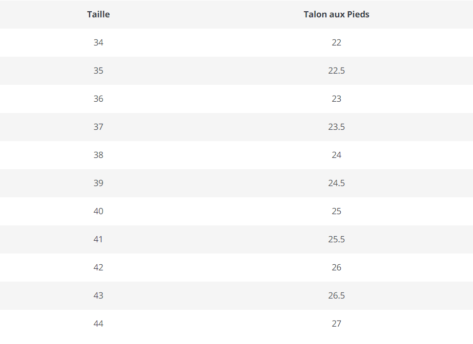 Ces tailles sont plus petites que la taille normale. Veuillez vous baser sur notre tableau des tailles (cm) et votre longueur de pied (Talon au pieds).