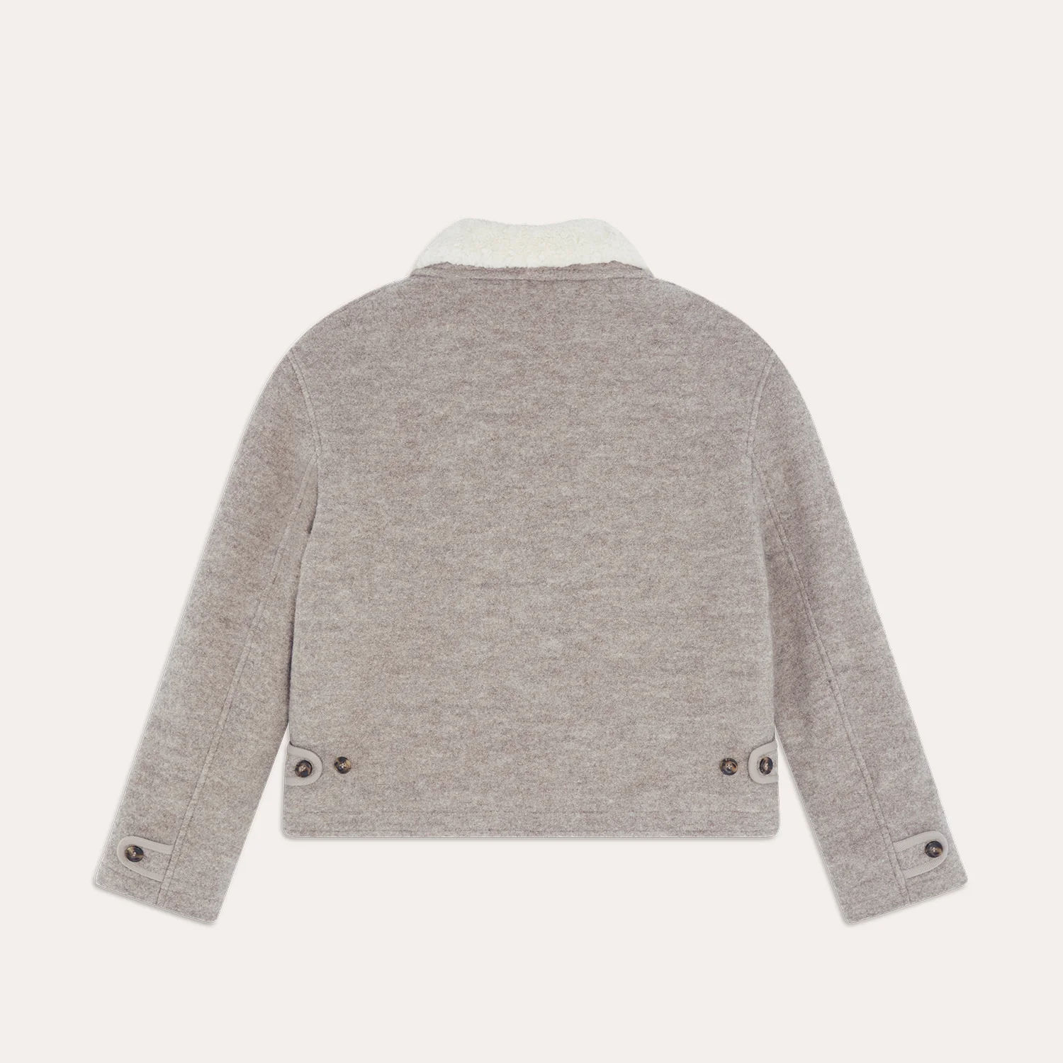 Ce blouson est inspiré par la flight jacket. Avec sa belle teinte beige chinée en laine bouillie italienne, il mettra en valeur vos tenues. Sa coupe confortable à l’épaule souple est pensée pour le layering. Avec son col en 100% laine de mouton amovible et ses bords-côtes aux manches, il est à la fois chaud et très confortable.