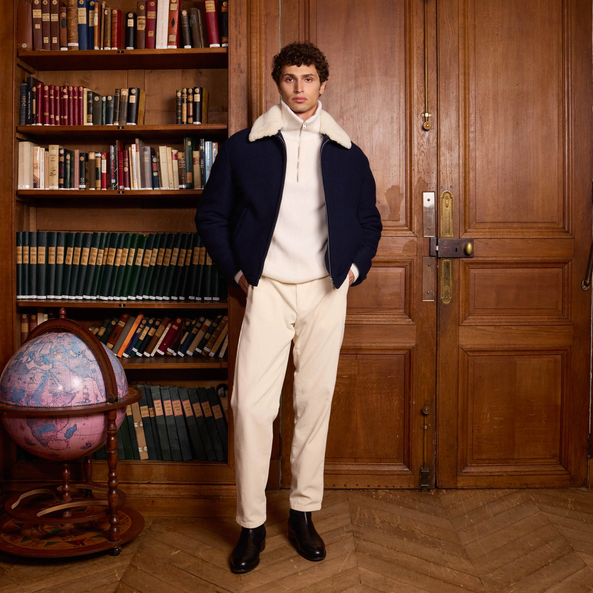 Ce blouson est inspiré par la flight jacket. Avec sa couleur marine en laine bouillie italienne, il mettra en valeur vos tenues. Sa coupe confortable à l’épaule souple est pensée pour le layering. Avec son col en 100% laine de mouton amovible et ses bords-côtes aux manches, il est à la fois chaud et très confortable.