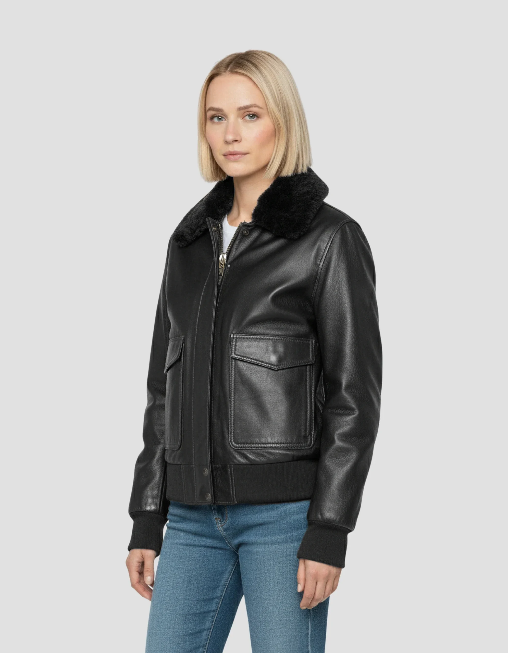 Blouson aviateur avec col en fausse fourrure amovible, cuir d’agneau