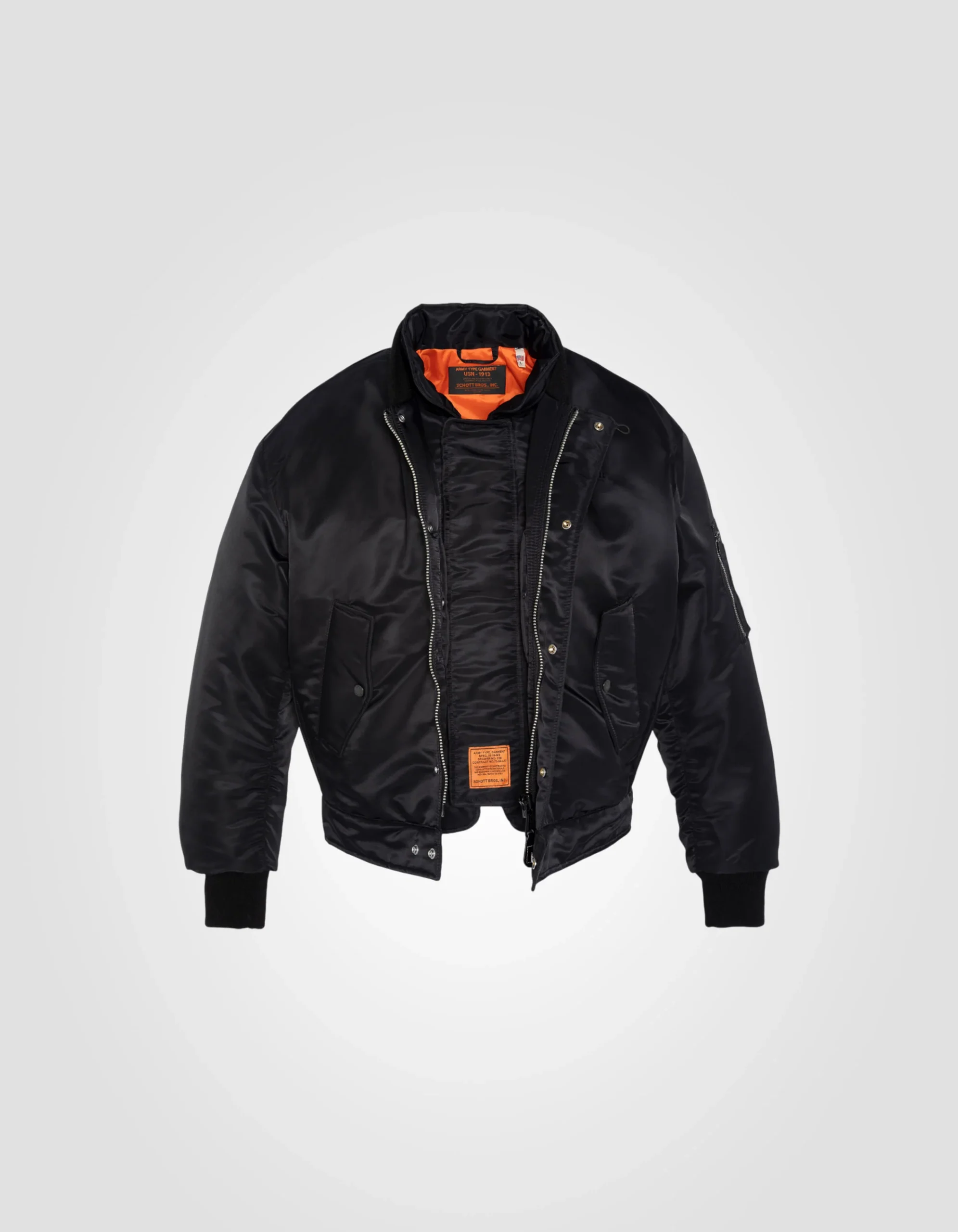 Création originale par Schott NYC® d’un blouson 3 en 1, composé d’un bombers A1 de l’U.S. Navy et d’un gilet de l’U.S. Army des années 60. Depuis, la famille des bombers n’a cessé d’être revisitée. La plus récente de ces adaptations est l’ajout d’un plastron amovible, une coupe inspirée des années 90, ainsi que l’utilisation de nylon recyclé pour le tissu extérieur du bomber.