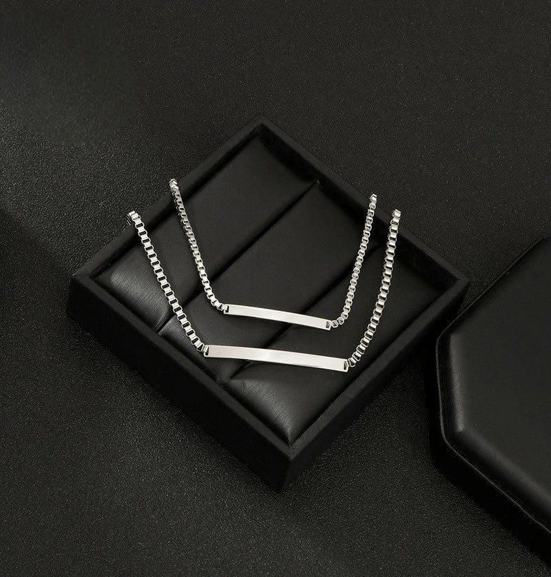 Conçue avec précision, cette pièce ajustée se distingue par sa chaîne épurée et sa gravure sur mesure. En acier finement travaillé, elle accompagne aussi bien les tenues habillées que les instants quotidiens, avec douceur et distinction.