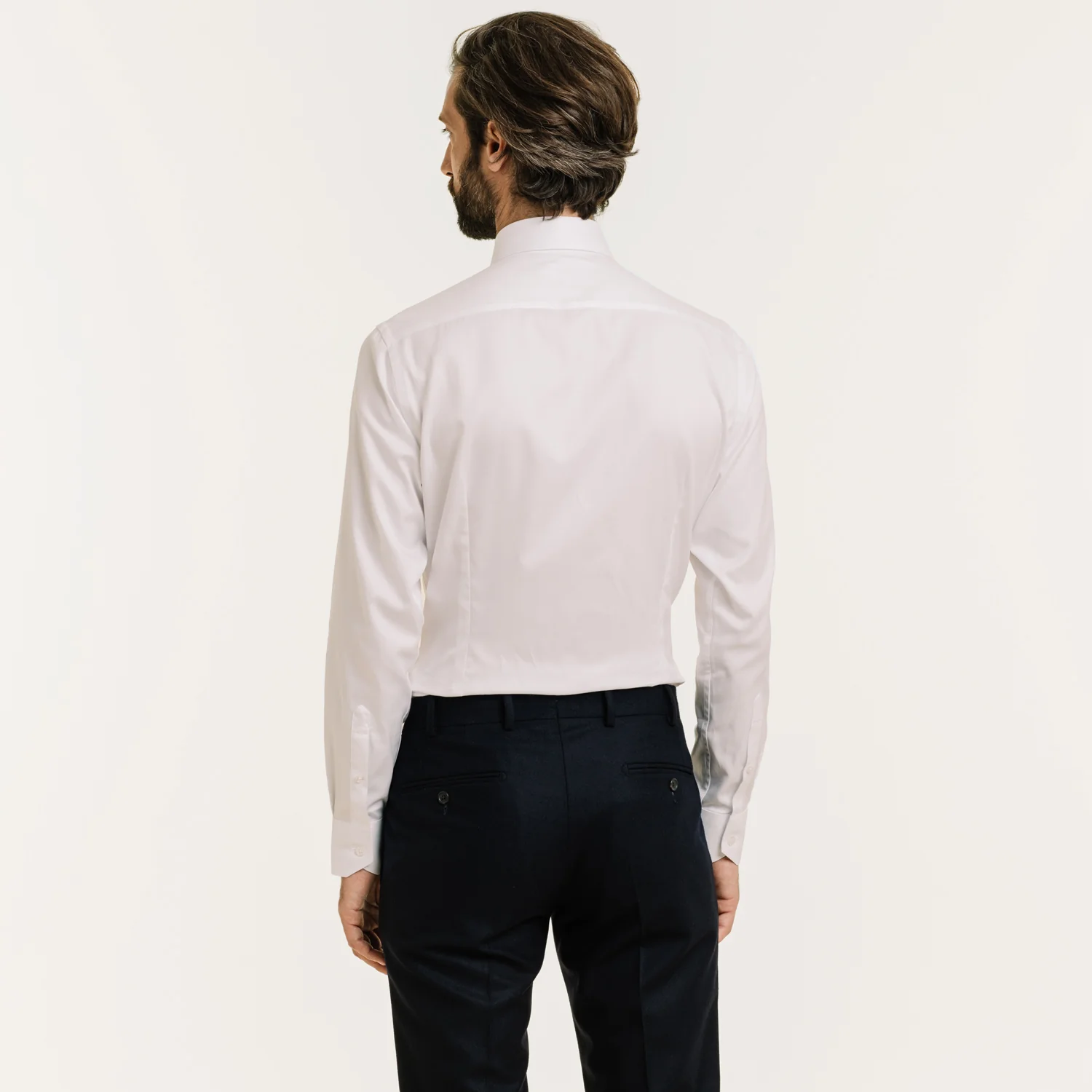 Notre chemise cintrée blanche à chevrons double retors est un grand classique du vestiaire formel. Facile à repasser, le chevron est particulièrement apprécié pour son subtil motif en zigzag qui apporte du relief. L’utilisation du double retors permet d’avoir une chemise plus douce et plus résistante.
