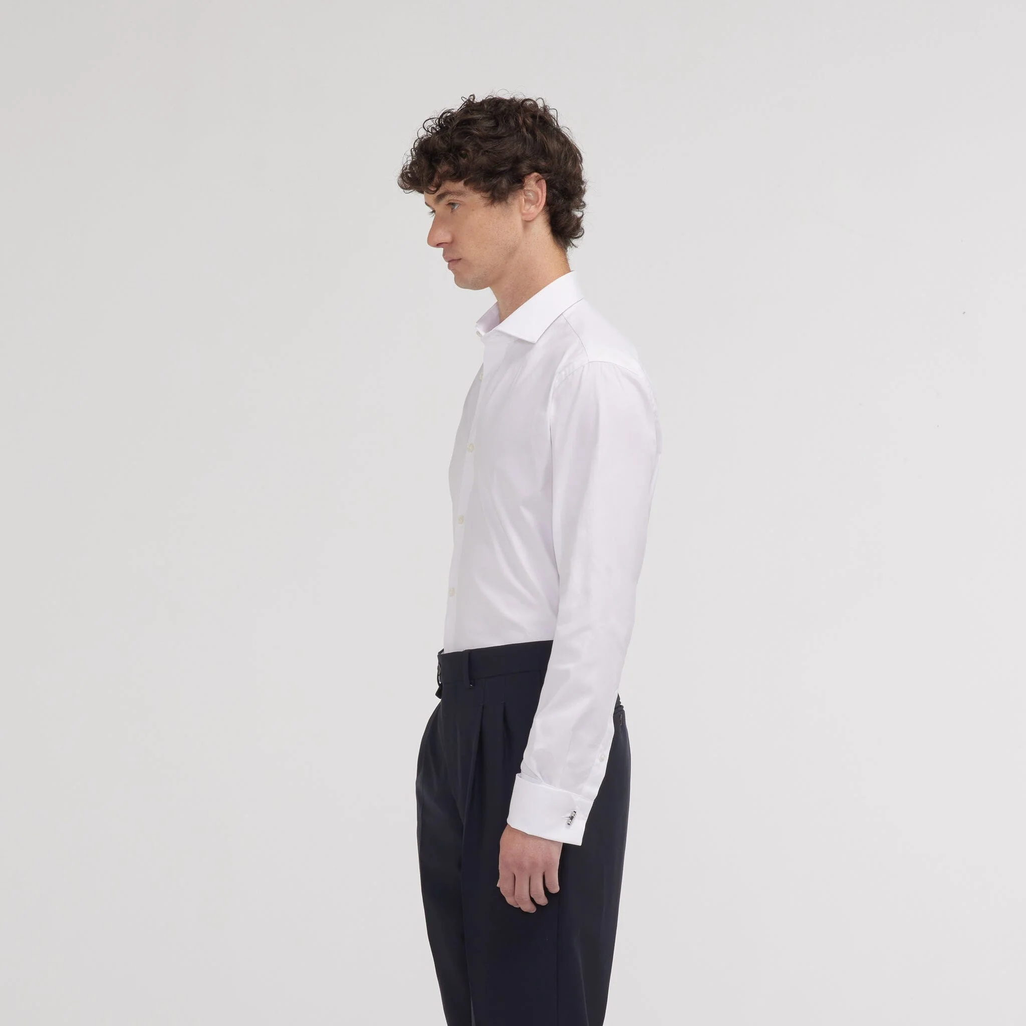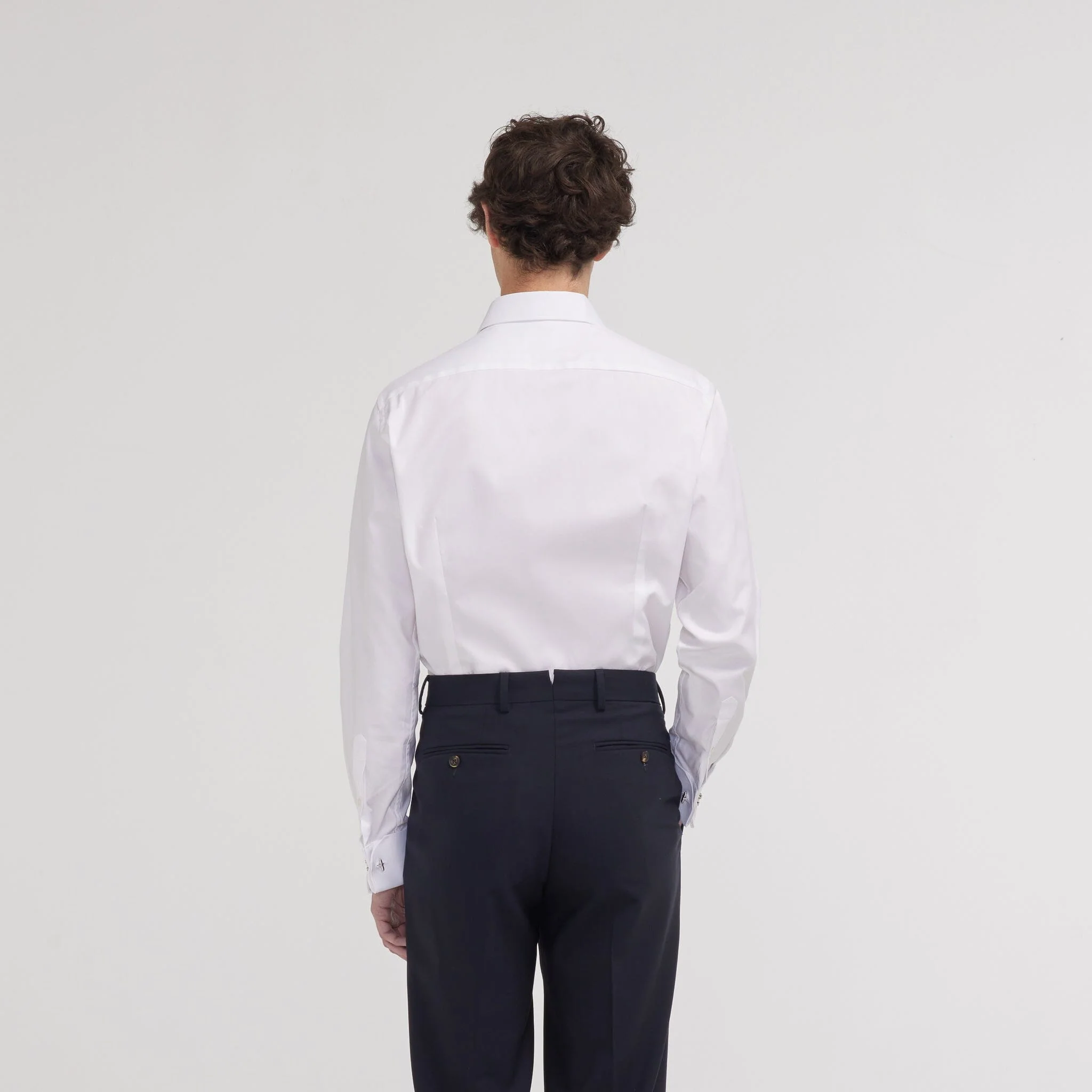 Cette chemise blanche à la coupe cintrée en oxford double retors incarne un équilibre parfait entre raffinement et texture. L’oxford, légèrement plus texturé que la popeline, est une belle alternative pour ceux qui recherchent une chemise habillée avec un subtile relief. Avec ses poignets mousquetaires, conçus pour accueillir des boutons de manchette, elle s’impose naturellement parmi les pièces les plus élégantes du vestiaire masculin.