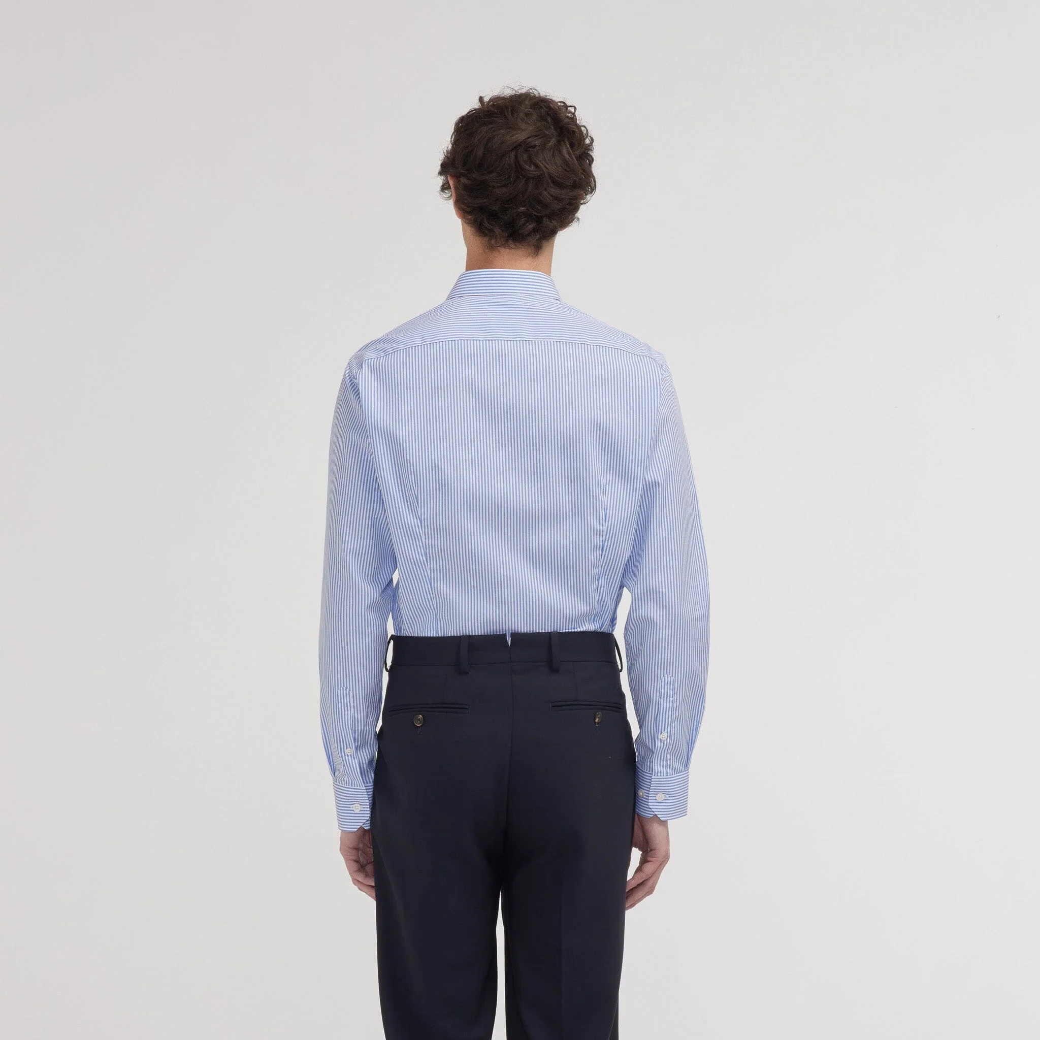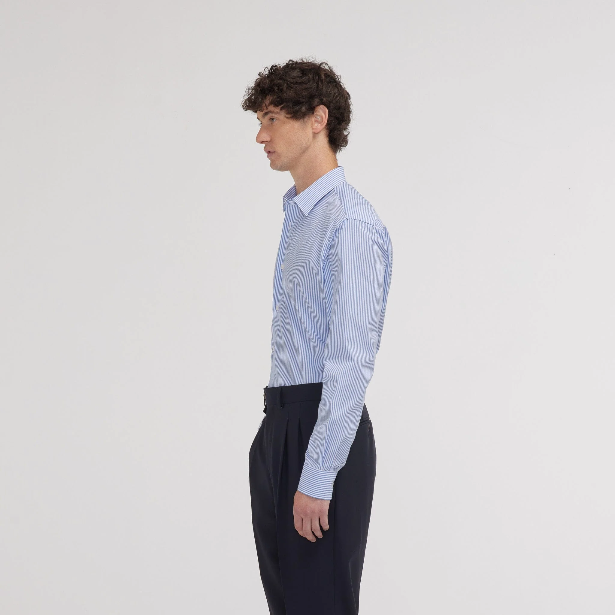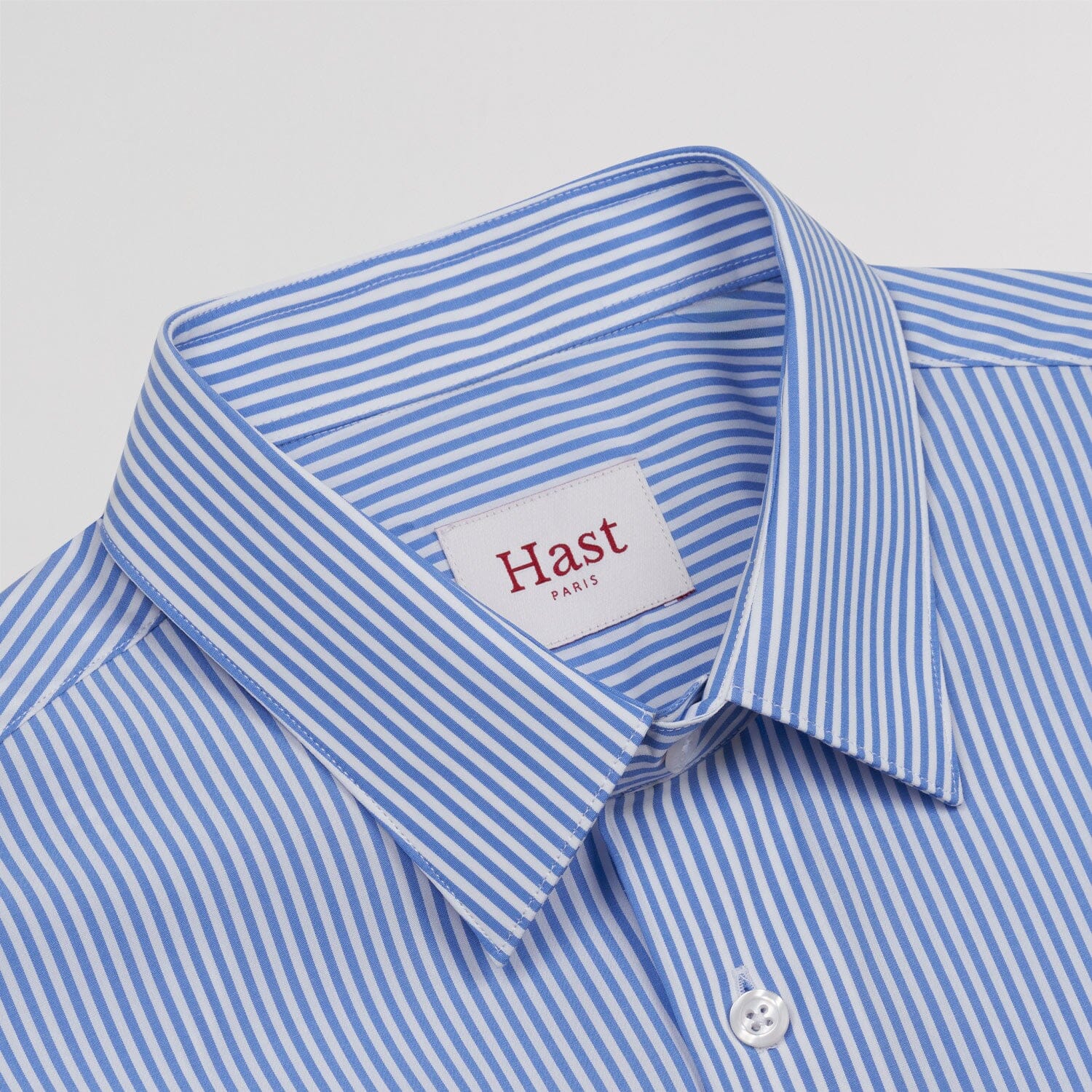 Cette chemise en popeline à rayures bleues et blanches 100% coton se distingue par l’élégance de son col français et la justesse de sa coupe cintrée, qui met en valeur les morphologies fines.
