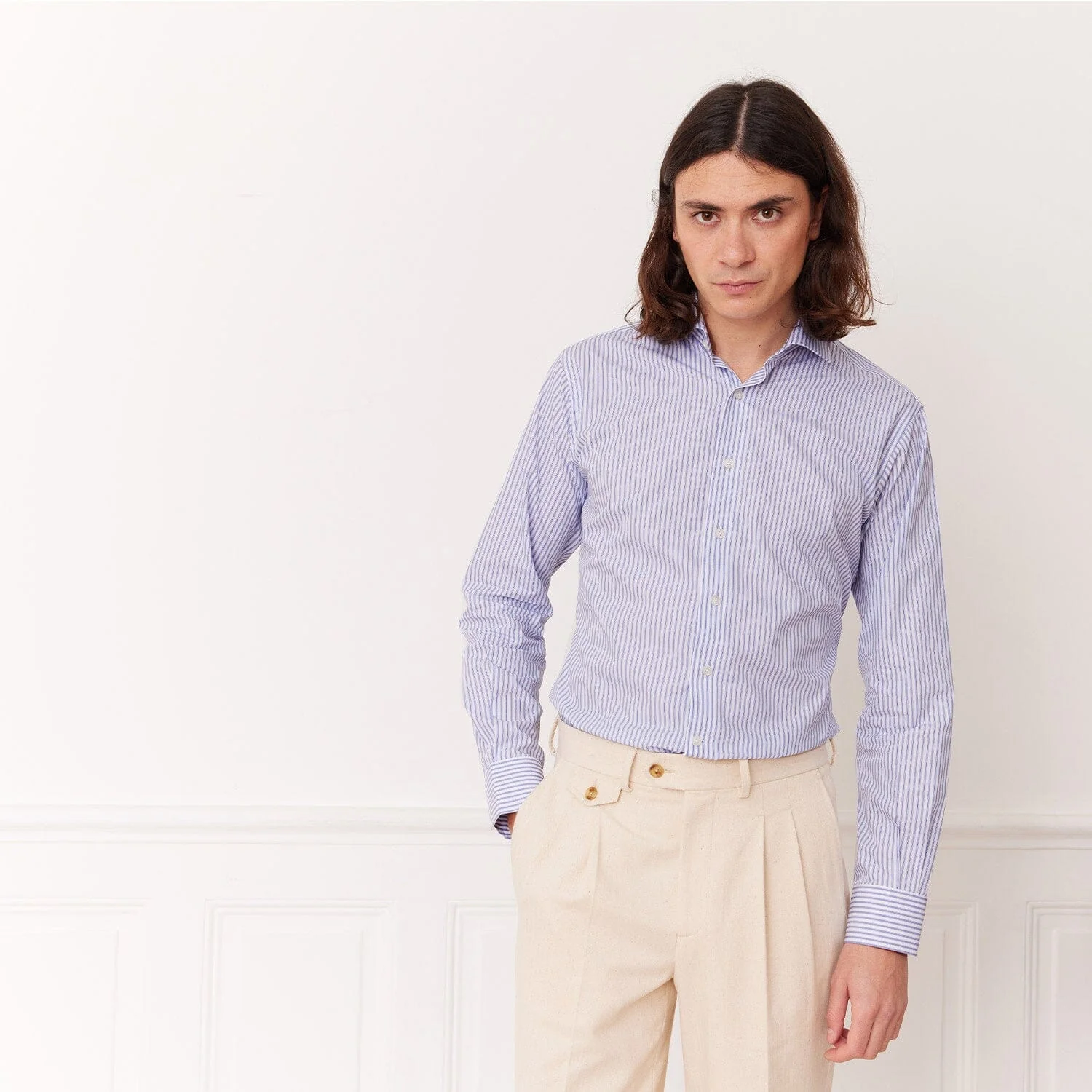 De subtiles rayures bleues qui apportent un dynamisme à la tenue, une popeline 100% coton tout en douceur : cette chemise en coupe cintrée a tout pour plaire.