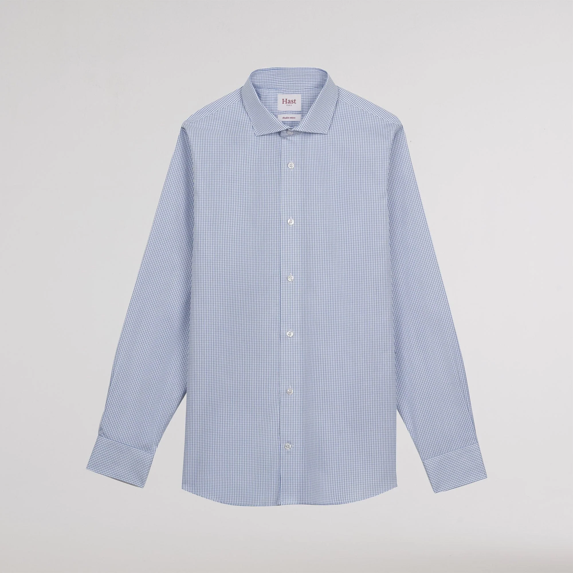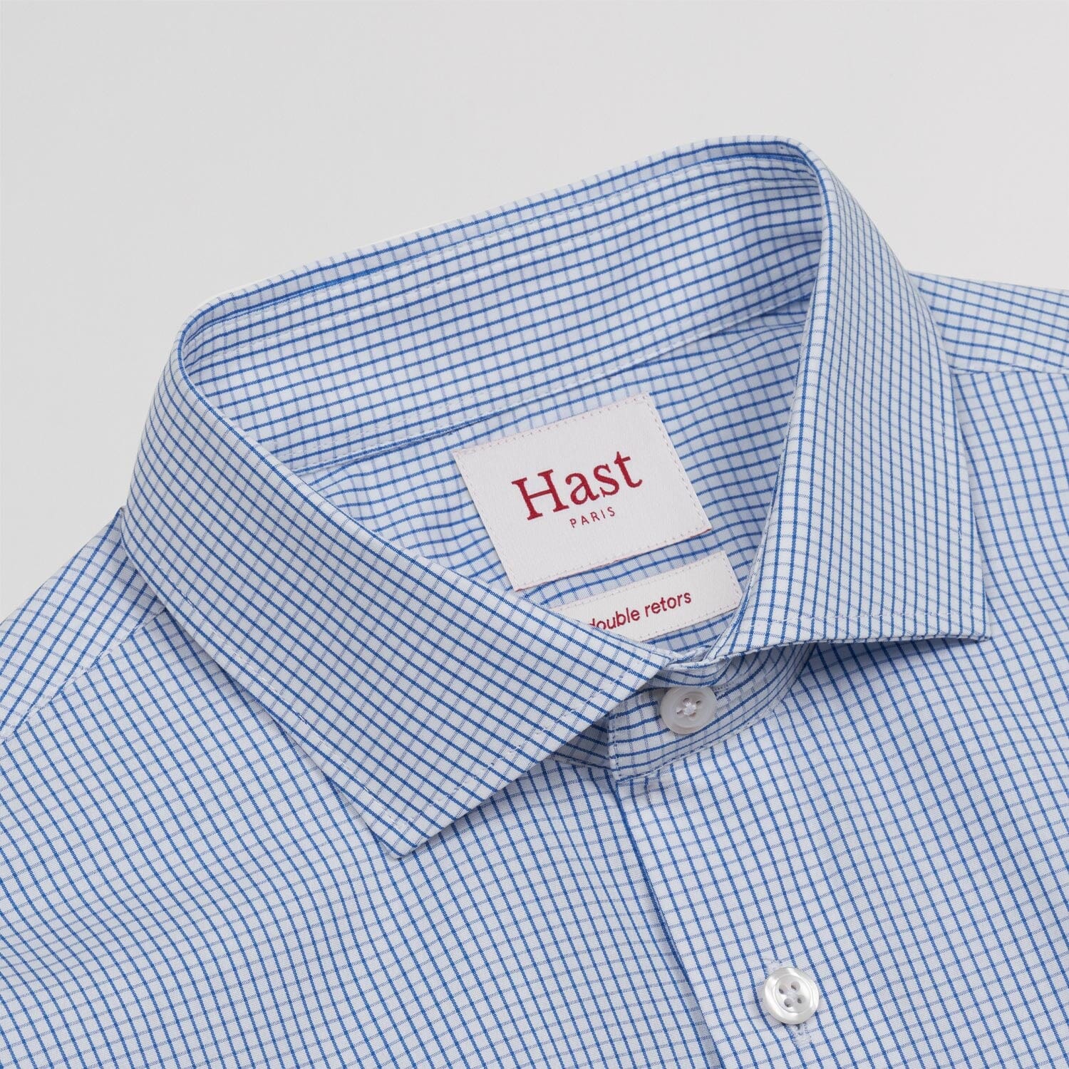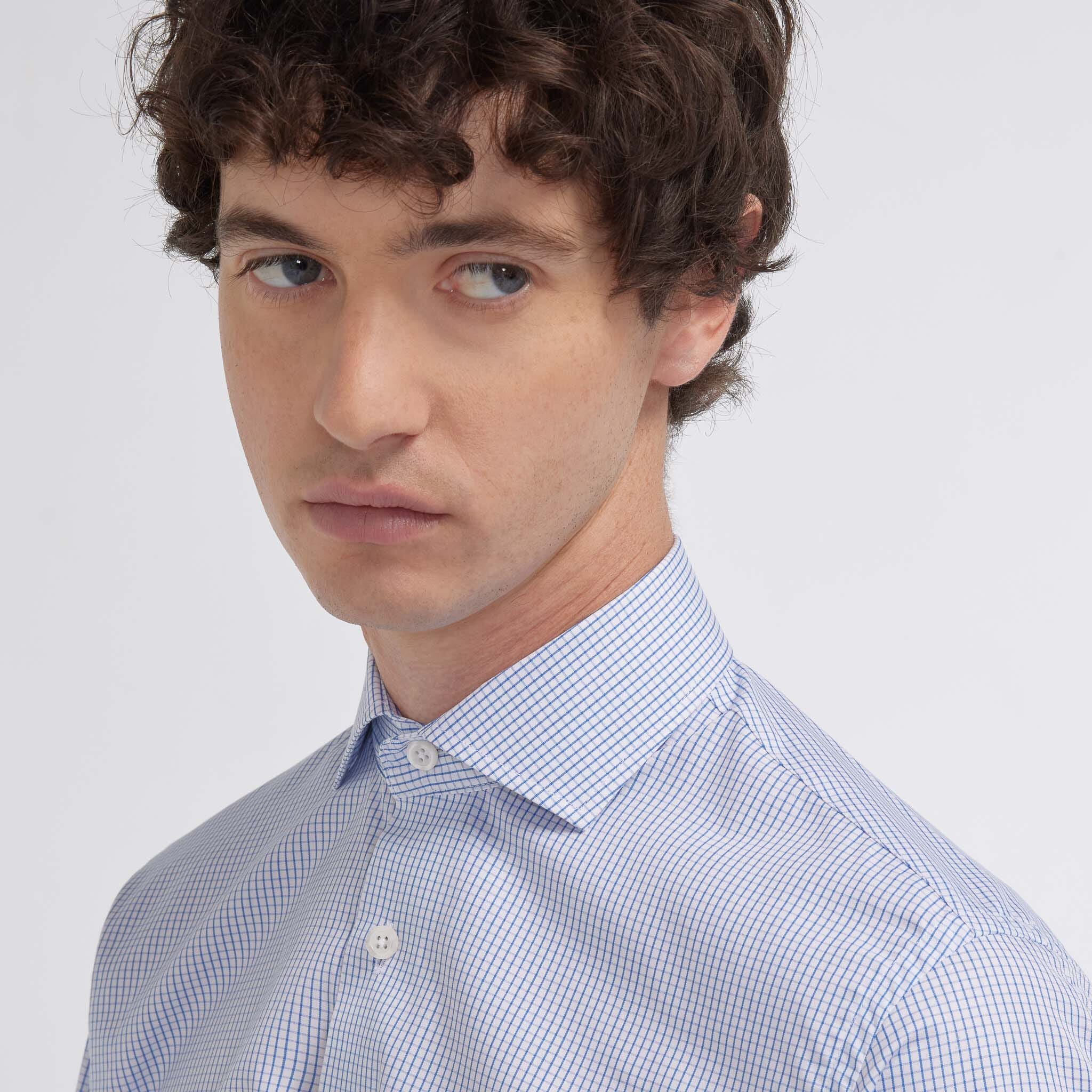 Notre chemise cintrée en popeline double retors à petits carreaux bleus permet de jouer sur les motifs. L’utilisation du double retors permet d’avoir une chemise plus douce et plus résistante.