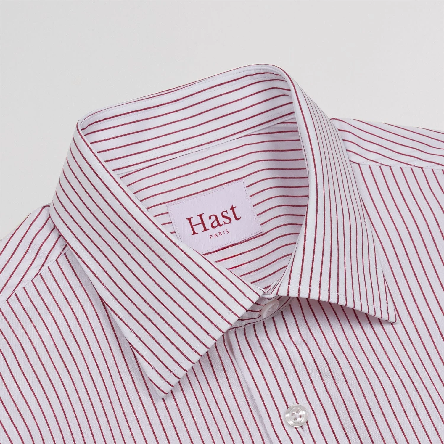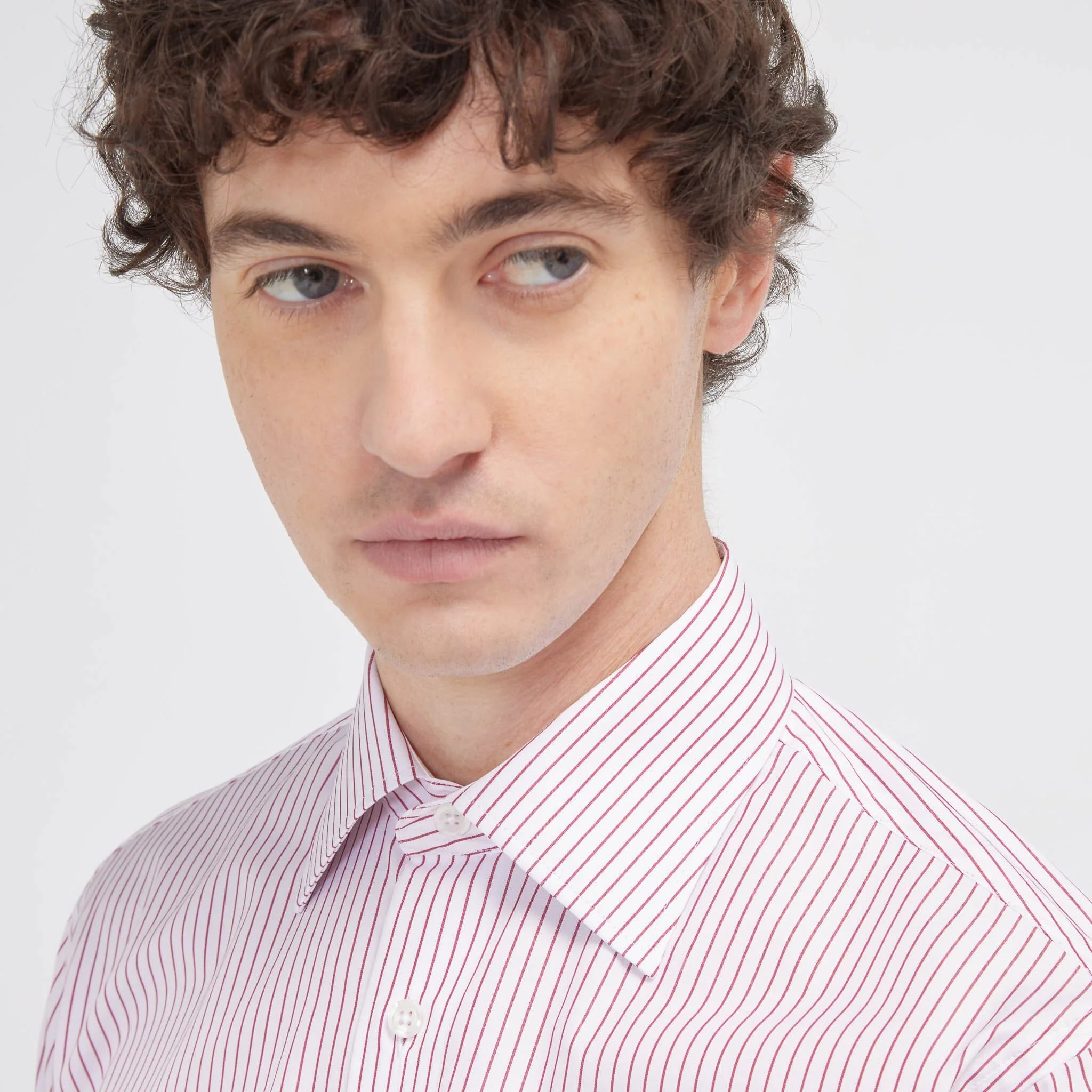 Le retour des grands cols plébiscités ! Chemise à rayures blanches et rouges à la coupe cintrée conçue dans une popeline 100% coton en double retors. Le col mesure 8 centimètres et les boutons sont cousus en croix.