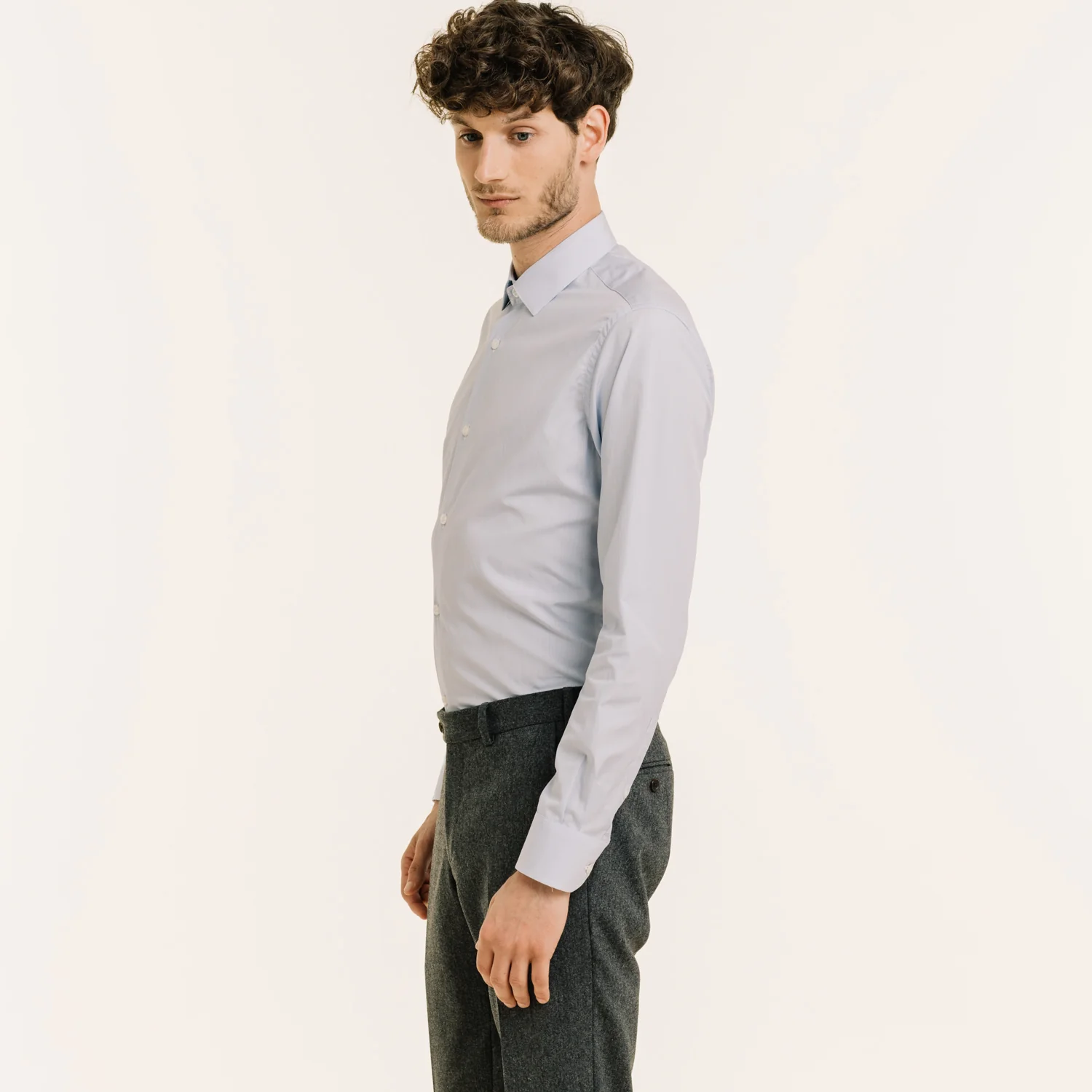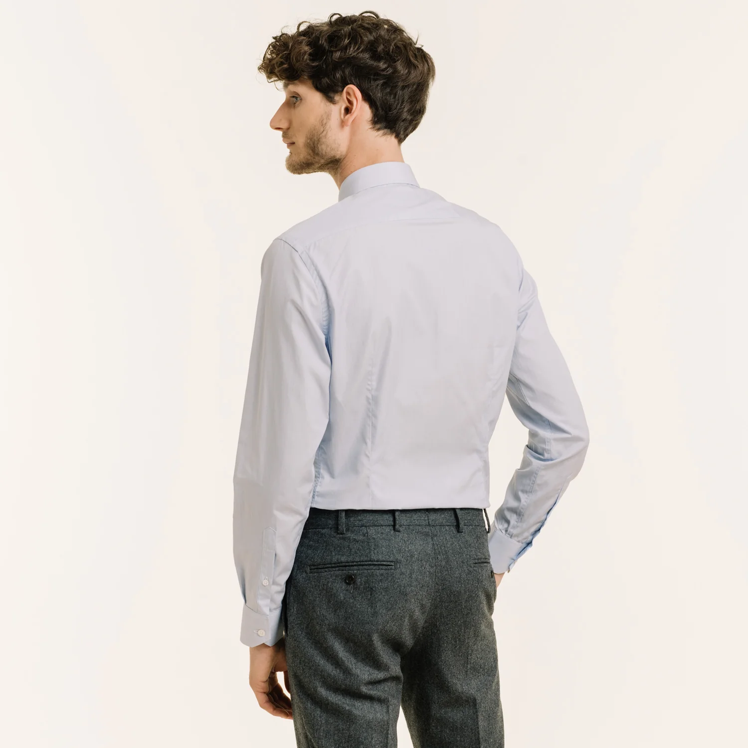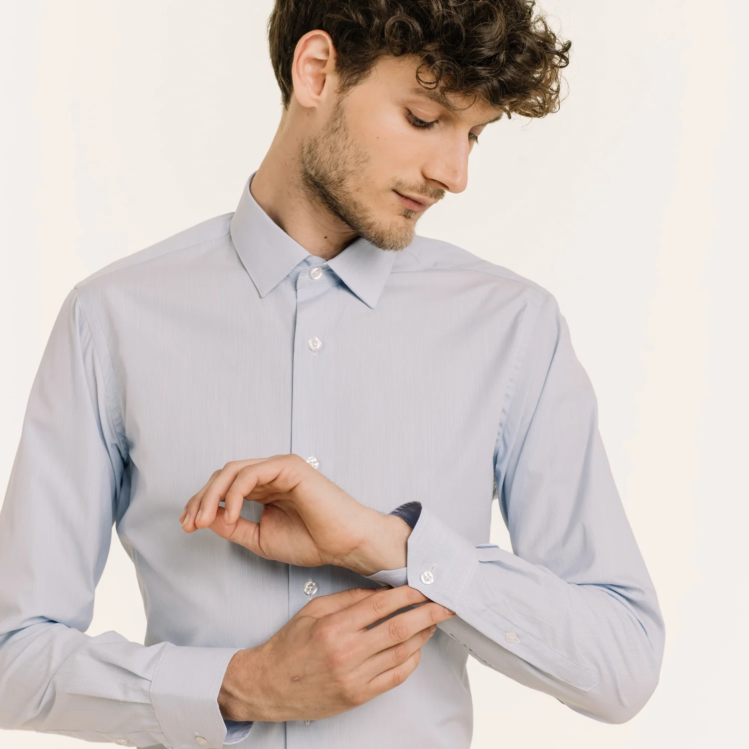 Notre chemise cintrée en popeline double retors faux-uni à rayures bleues est un excellent choix lorsqu’il s’agit d’apporter un peu de relief à sa tenue. L’utilisation du double retors permet d’avoir une chemise plus douce et plus résistante.