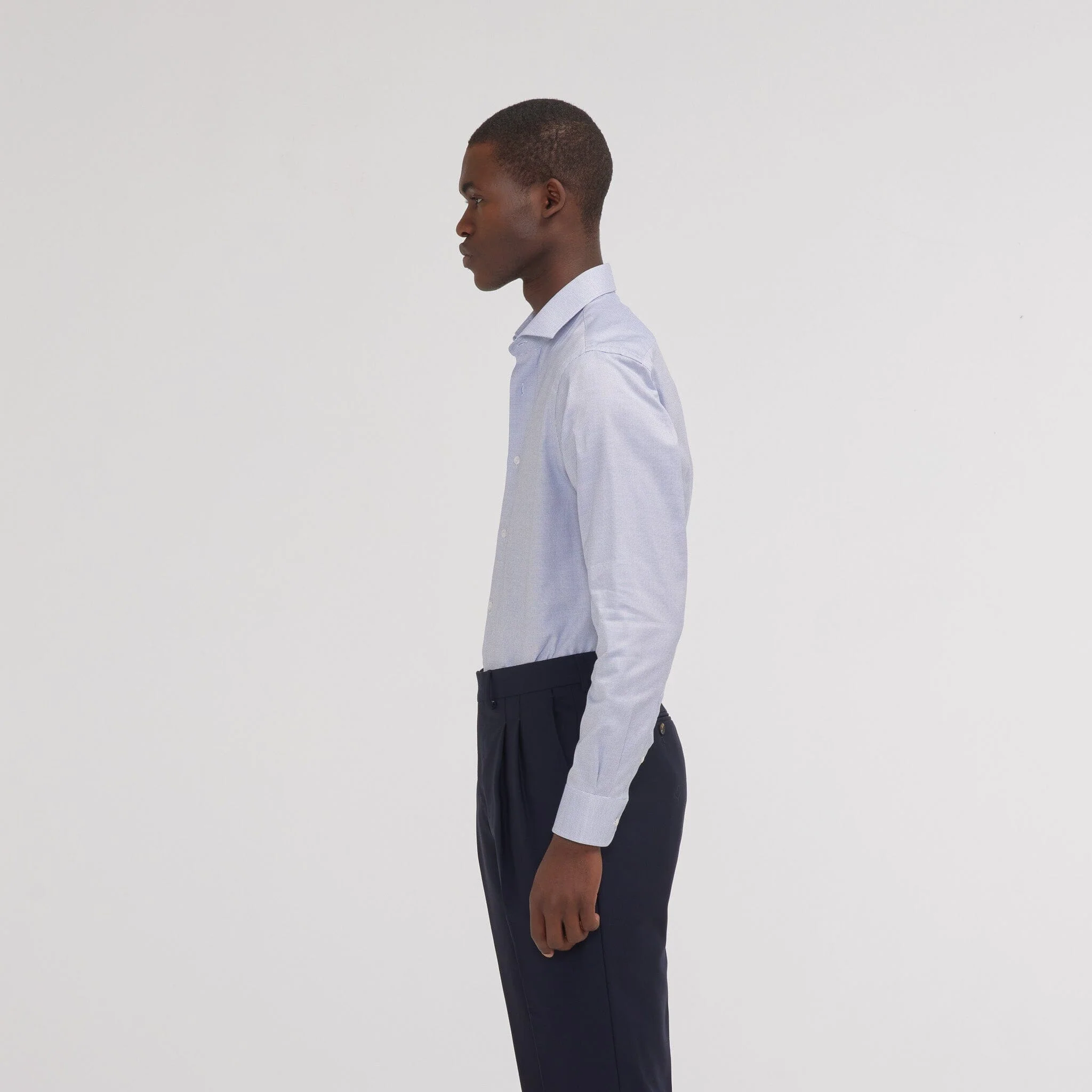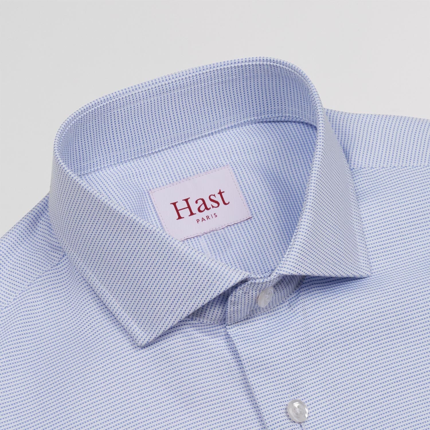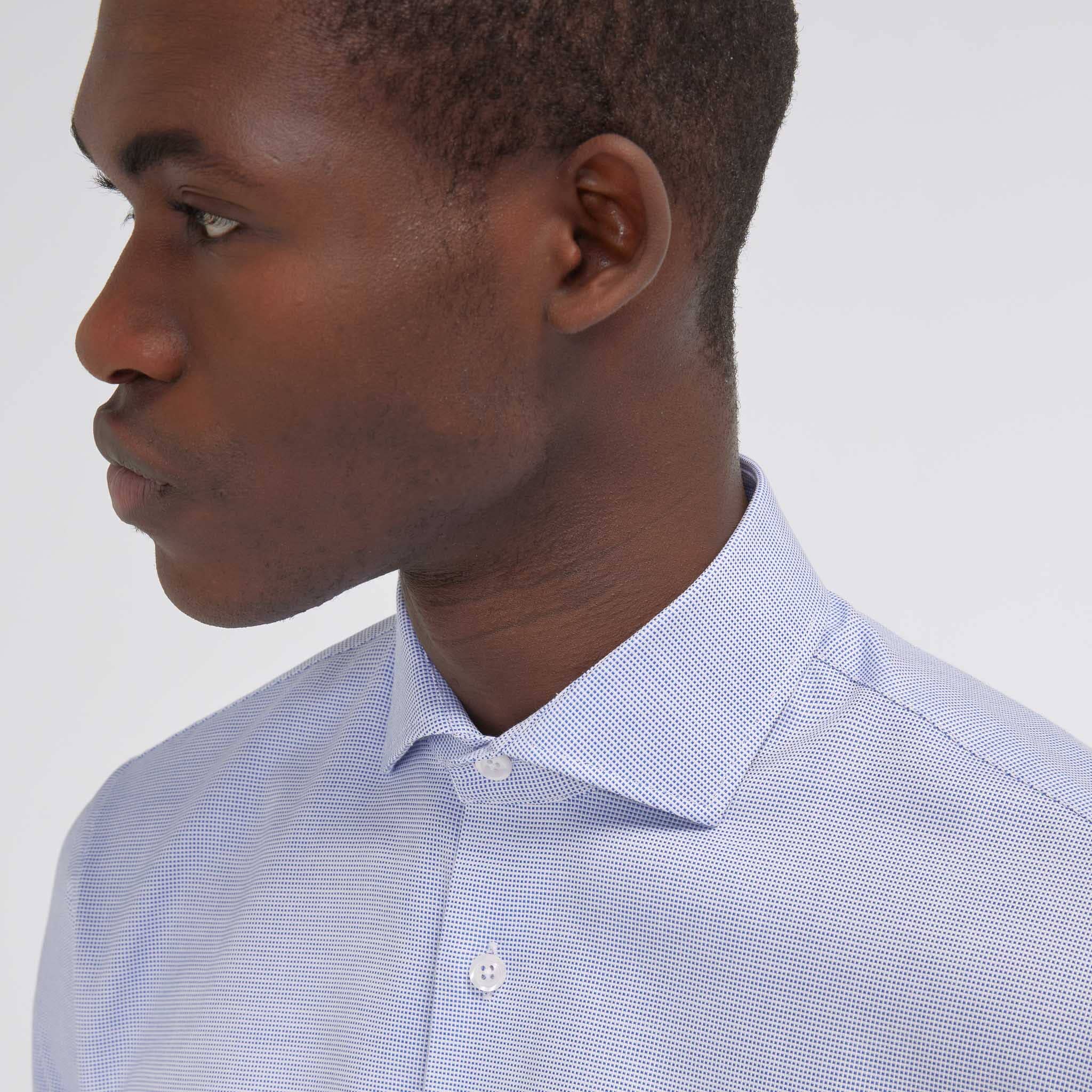Cette chemise en royal oxford 100% coton pied de puce bleue est parfaite lorsque l’on souhaite ajouter du relief à sa tenue de façon subtile. Plus sophistiqué que l’oxford classique, le royal oxford se distingue par un tissage élaboré et légèrement texturé, très confortable.