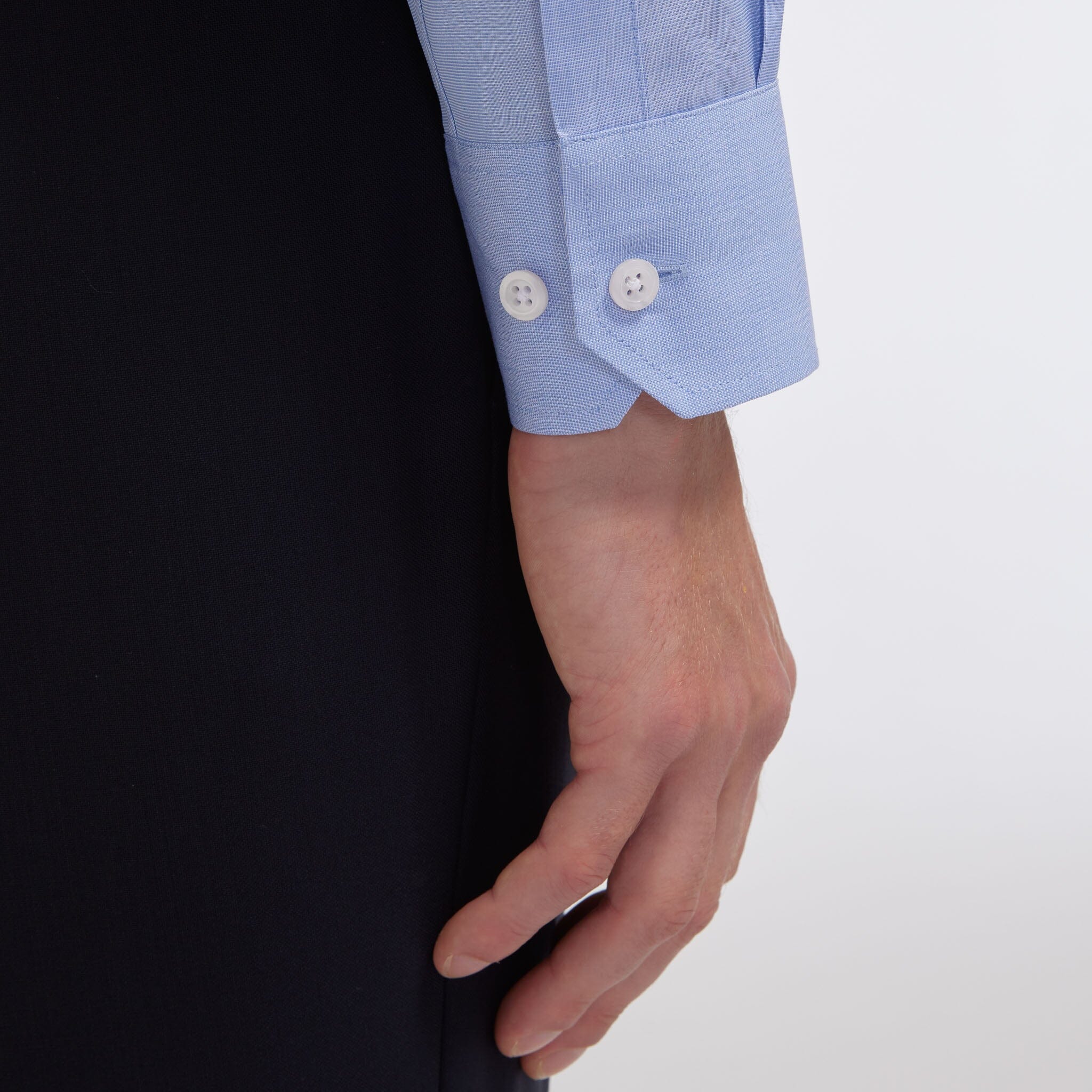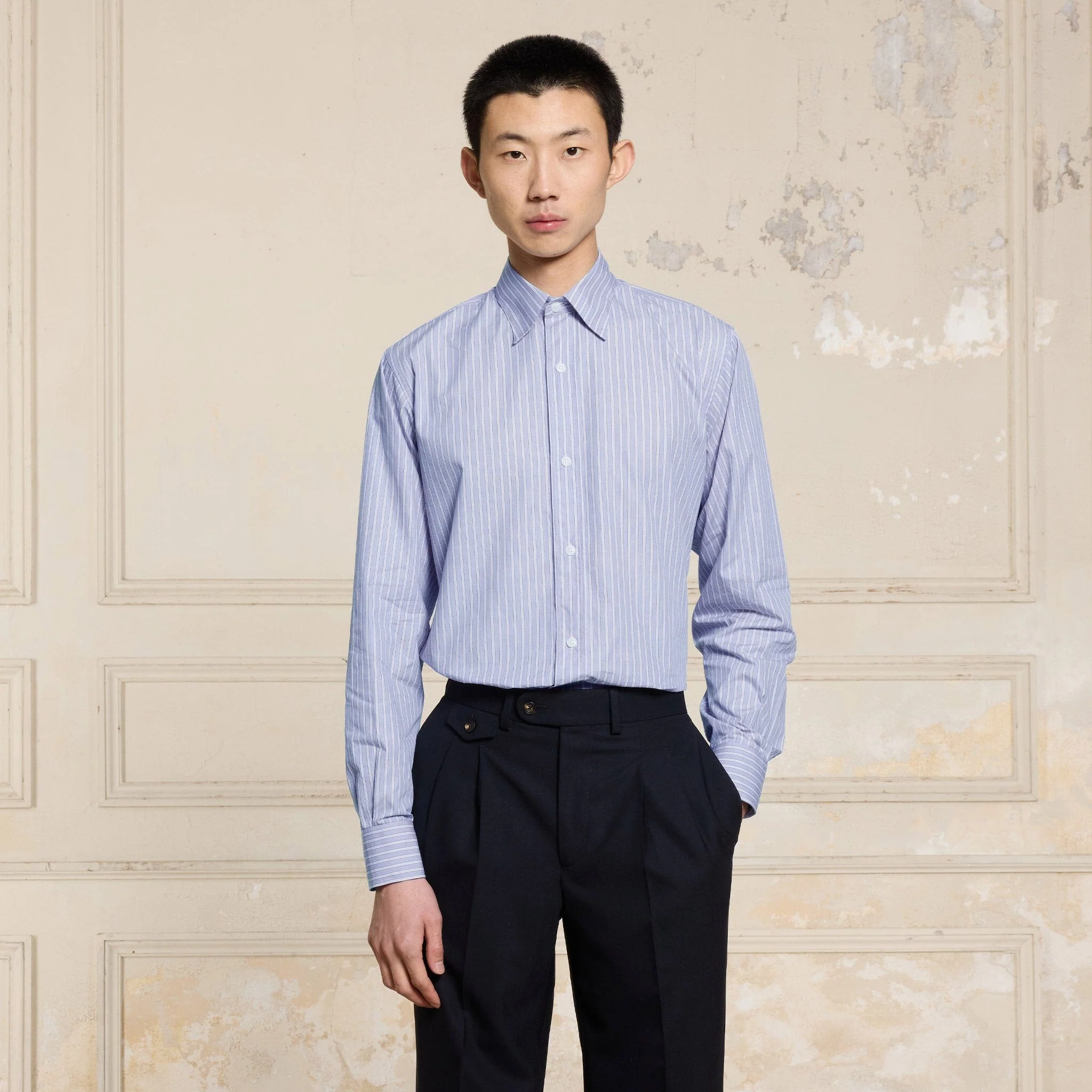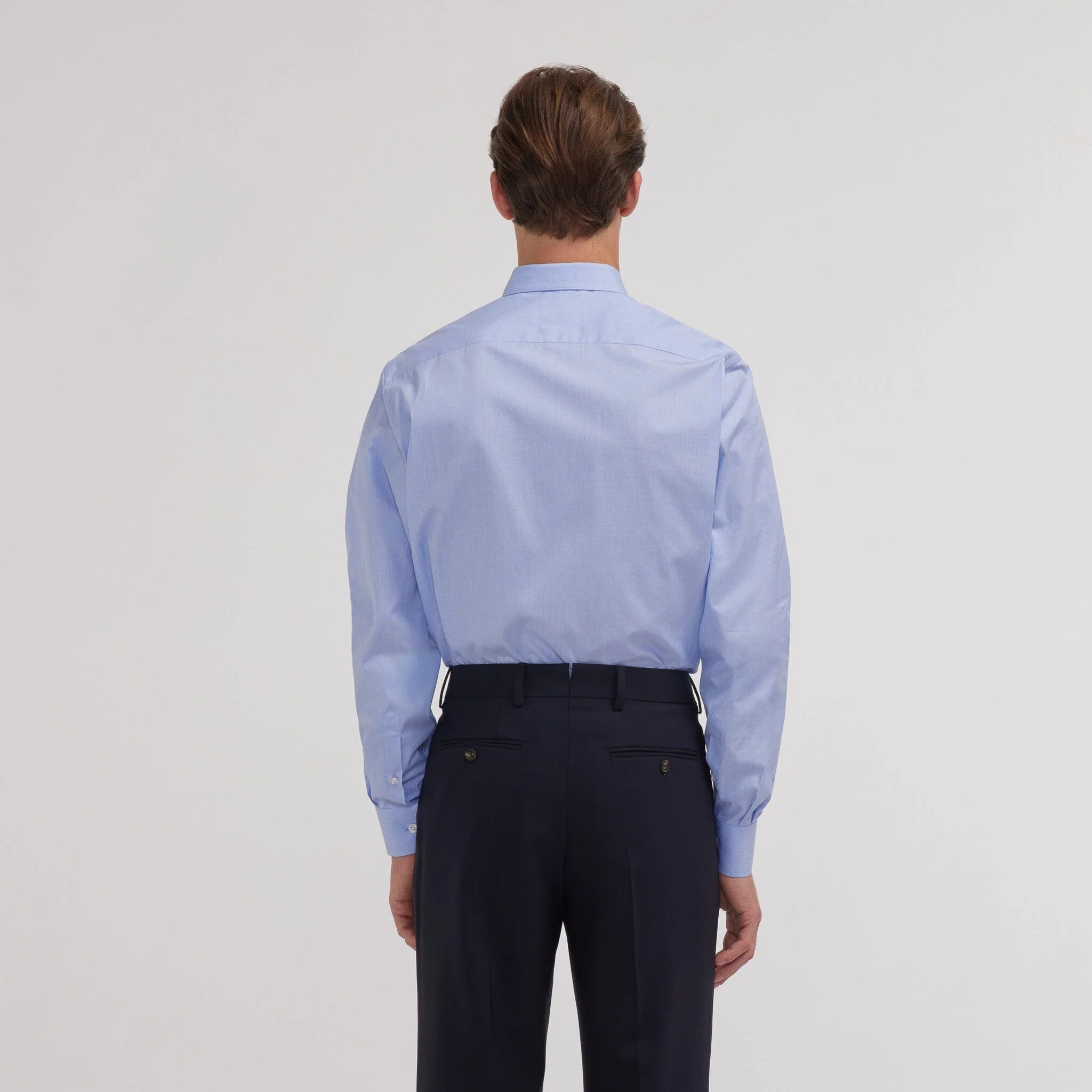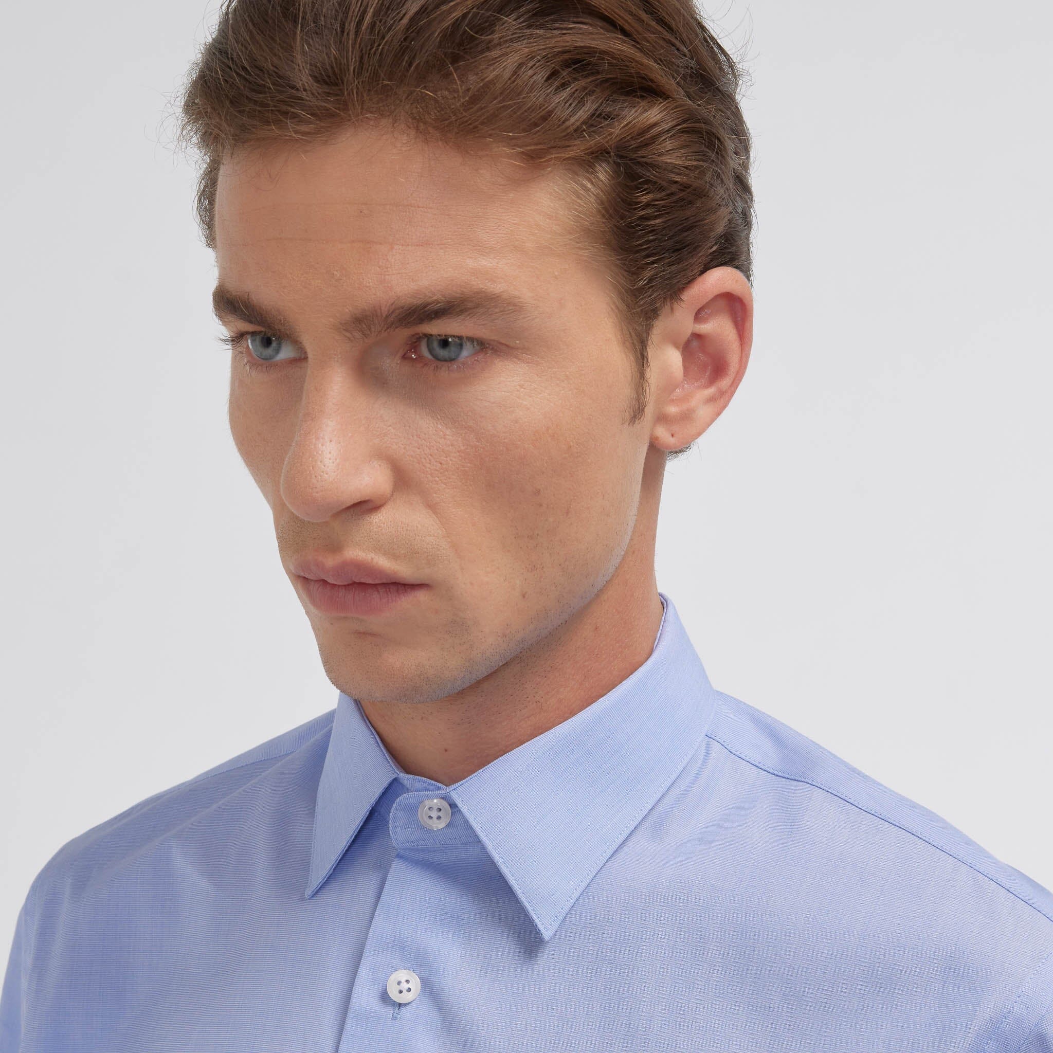 Cette chemise en fil à fil bleue 100 % coton double retors se distingue par l’élégance de son col français et la justesse de sa coupe classique, qui met en valeur la silhouette.