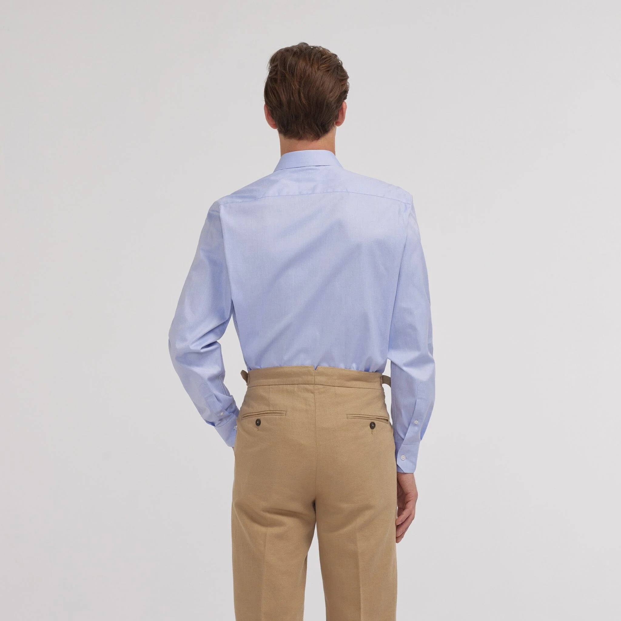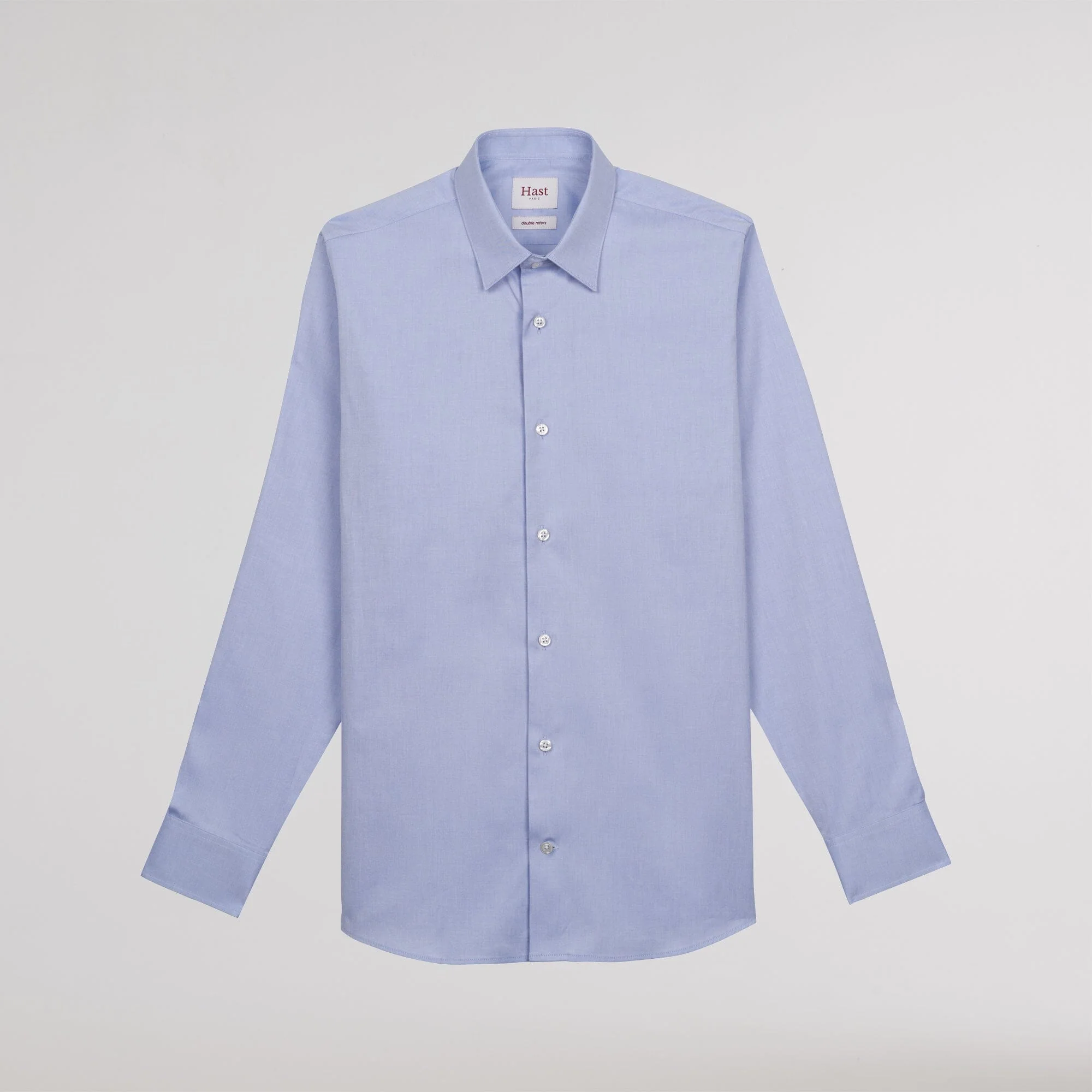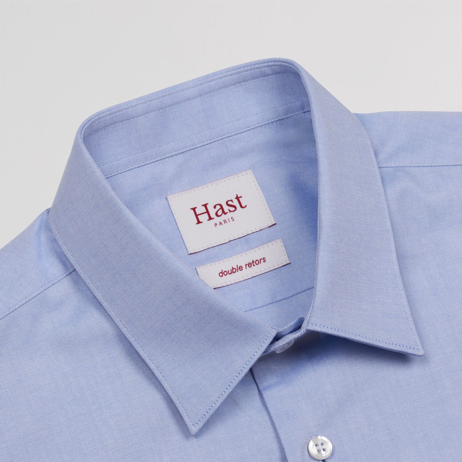 Cette chemise en oxford bleue 100 % coton double retors se distingue par l’élégance de son col français et la justesse de sa coupe classique, qui met en valeur la silhouette.