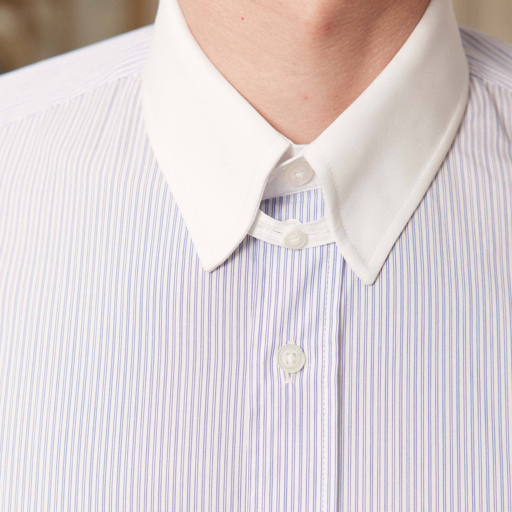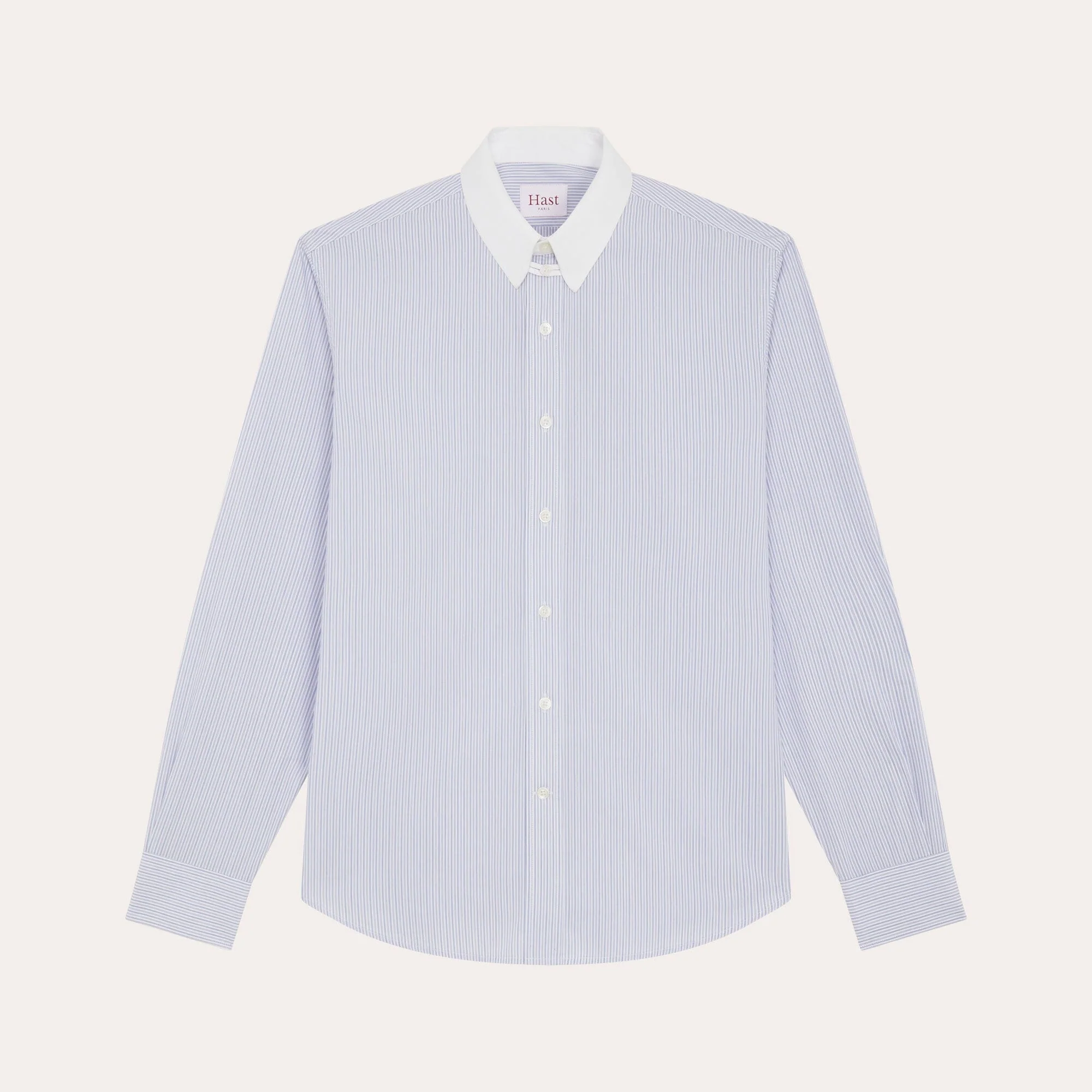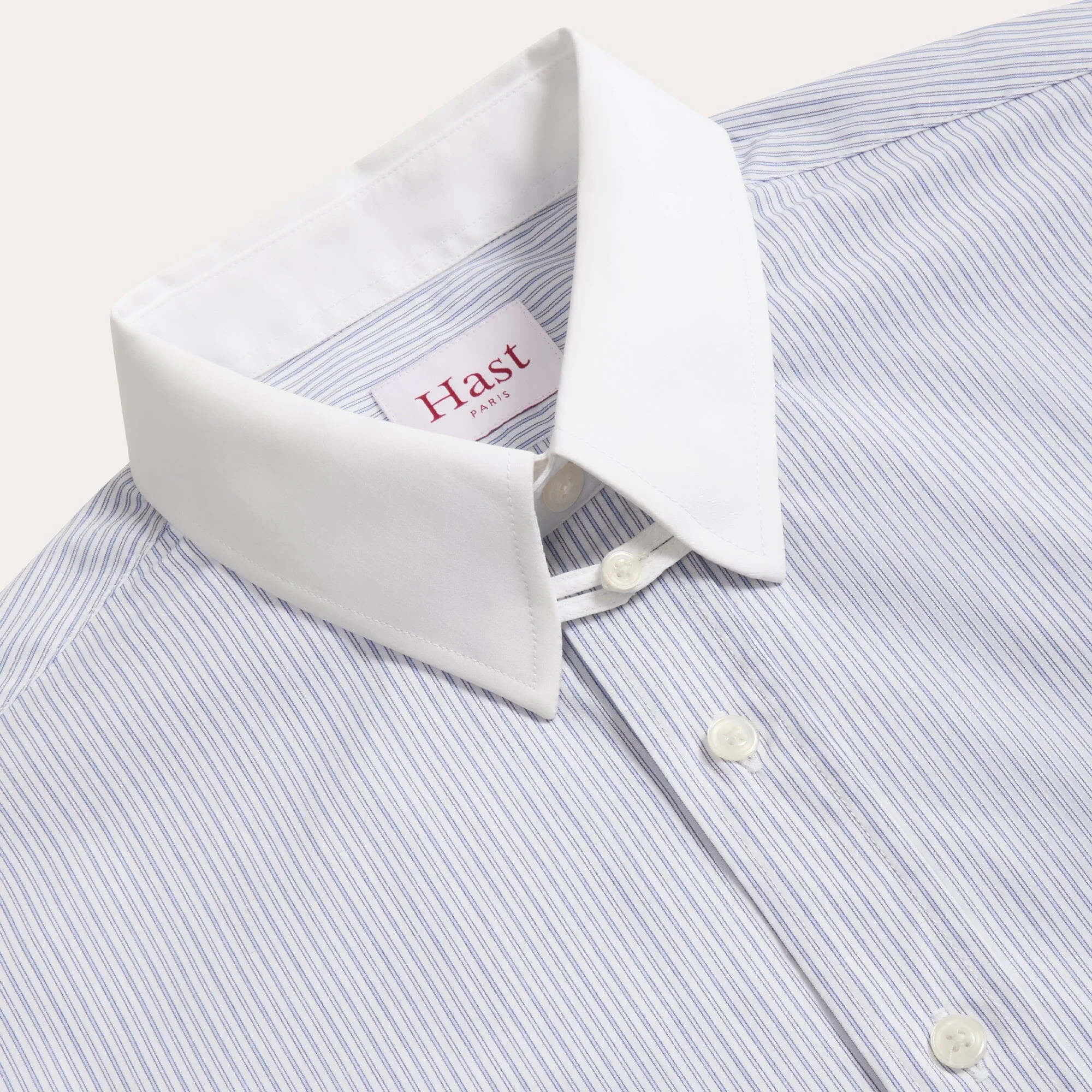 Elégance british pour cette chemise à rayures bleues et blanches avec son col blanc.