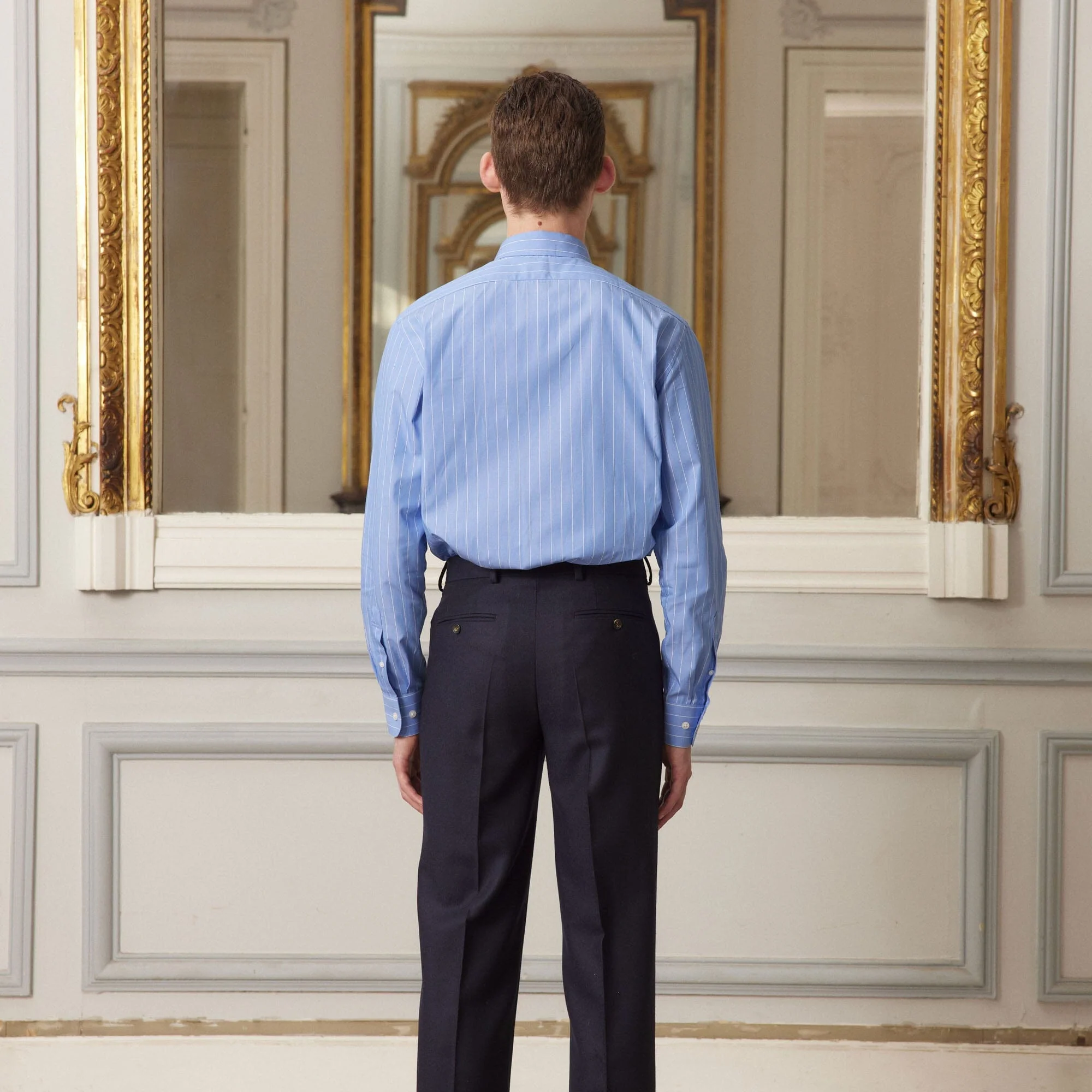 Cette chemise en popeline bleue à rayures bénéficie d’un col monté en une pièce de 9 centimètres, sans pied de col. Rare et complexe, ce montage illustre le savoir-faire exceptionnel de nos fabricants.