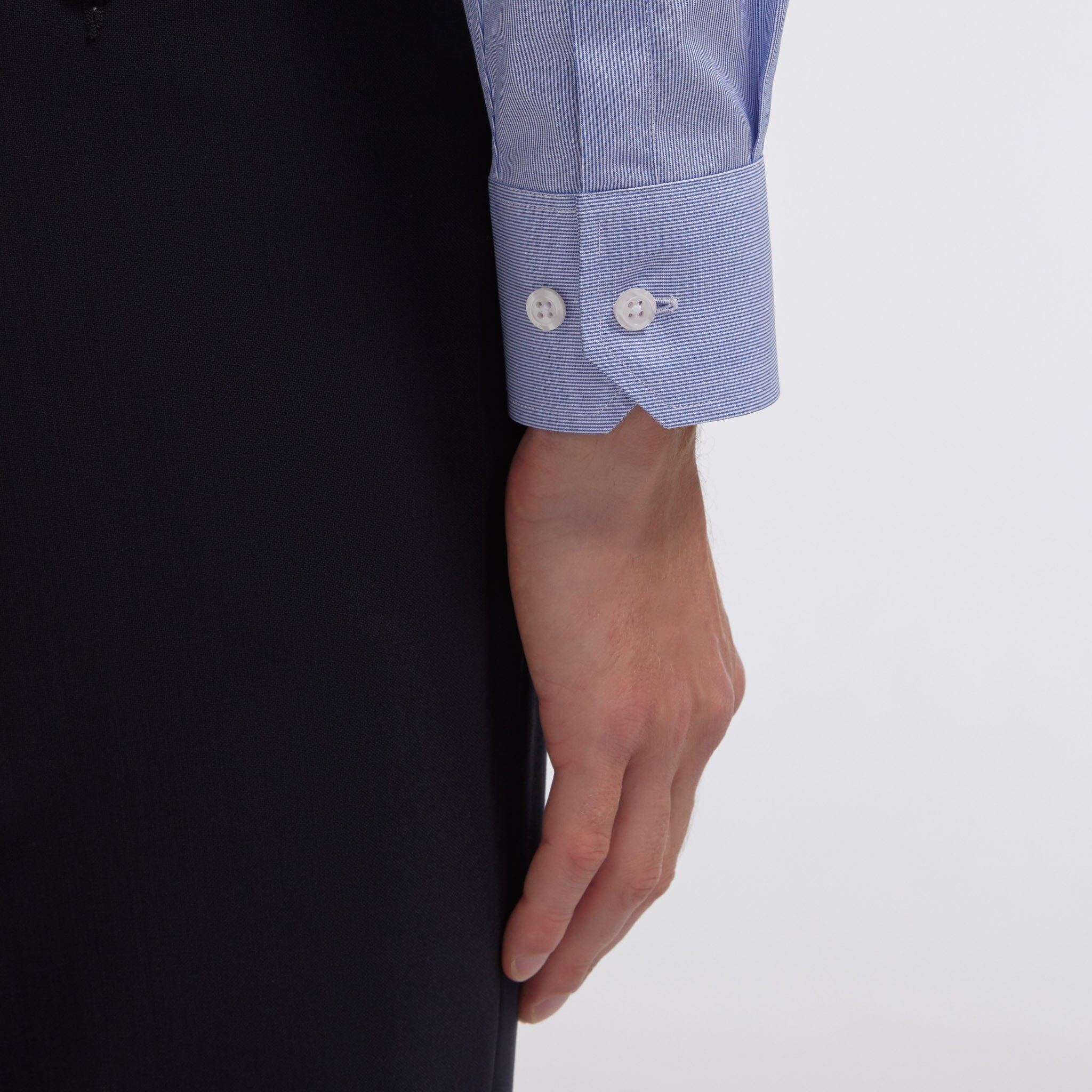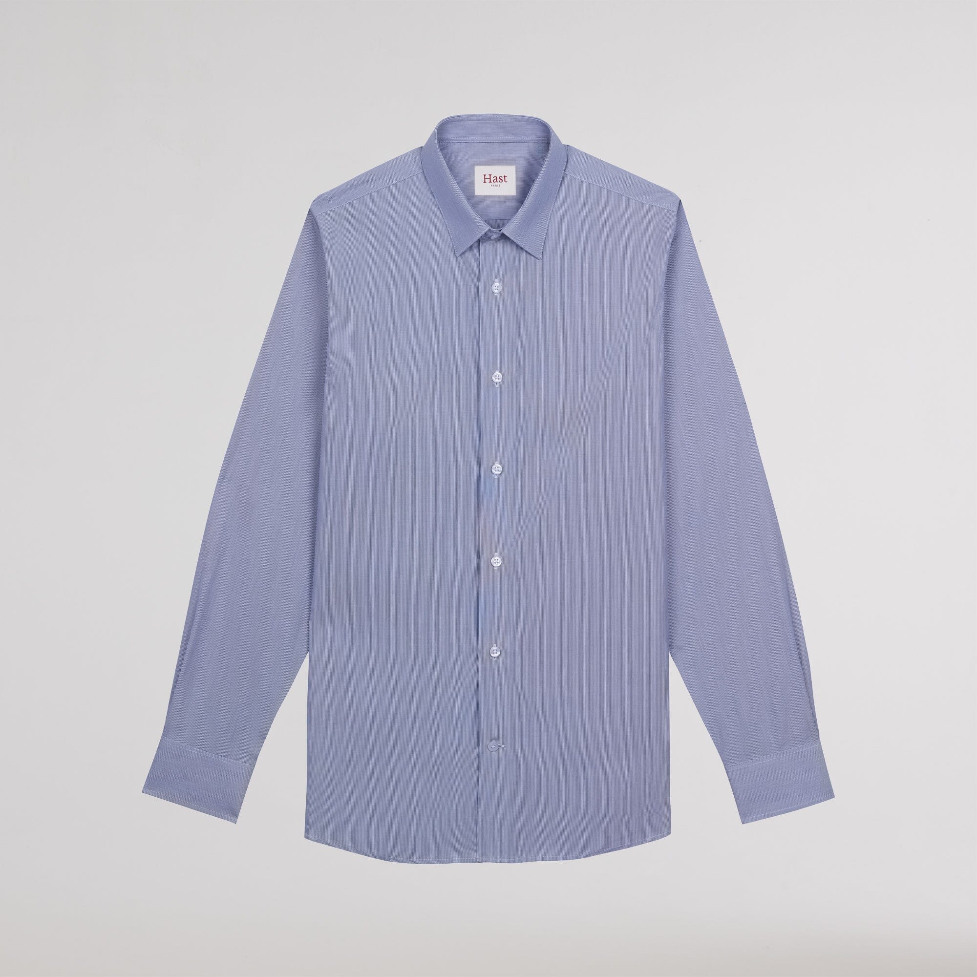 Cette chemise en popeline faux-uni à fines rayures bleues 100% coton se distingue par l’élégance de son col français et la justesse de sa coupe classique, qui met en valeur la silhouette.