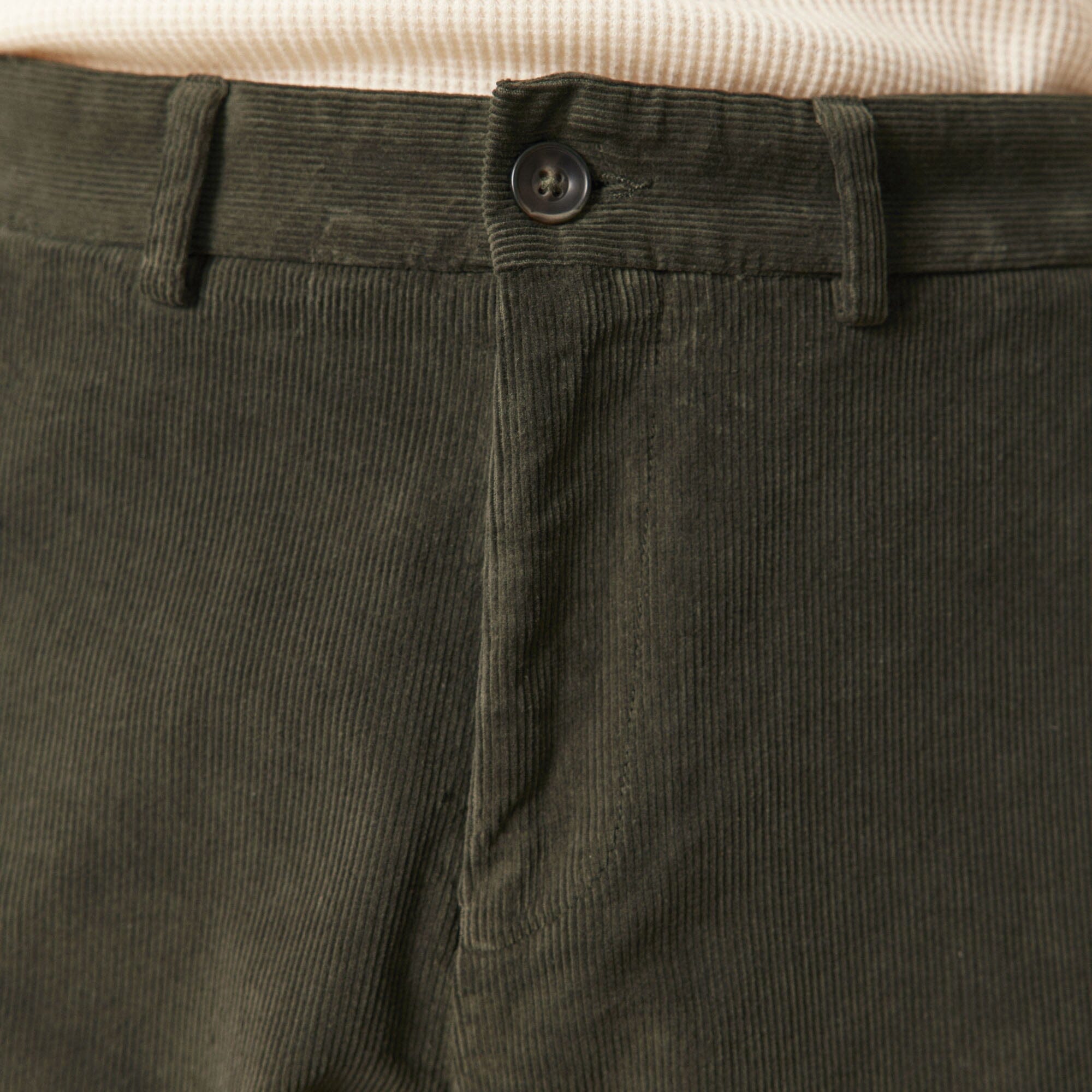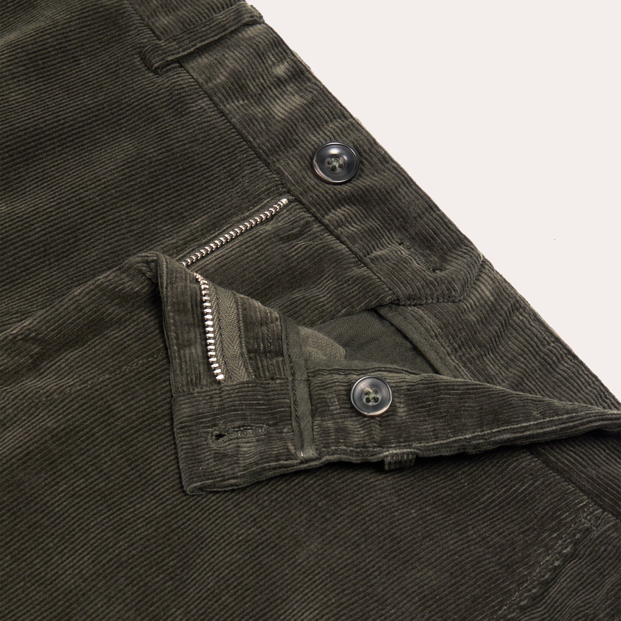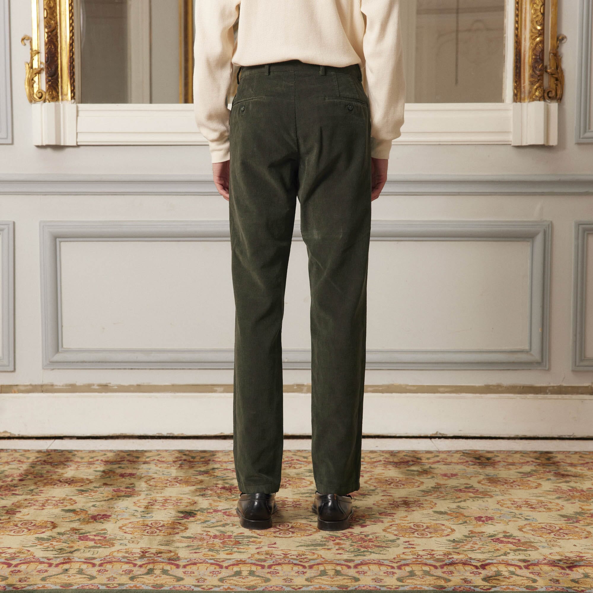 Le chino classique, version hivernale. Notre pantalon fétiche se décline dans un velours côtelé vert tissé en France par Velcorex, maison réputée pour la qualité de ses tissus. Le velours, matière phare de l’hiver, est chaud et confortable, faisant de ce pantalon un incontournable de la saison.