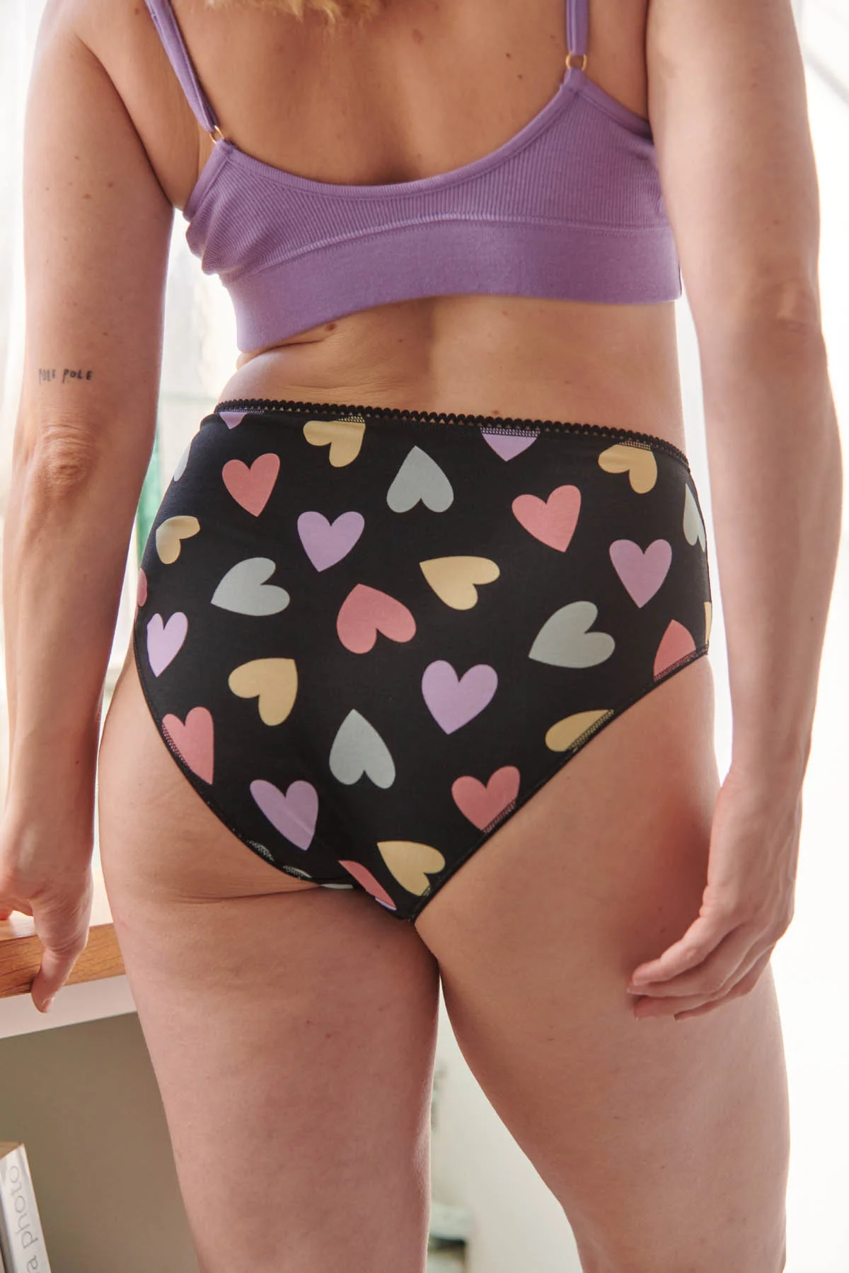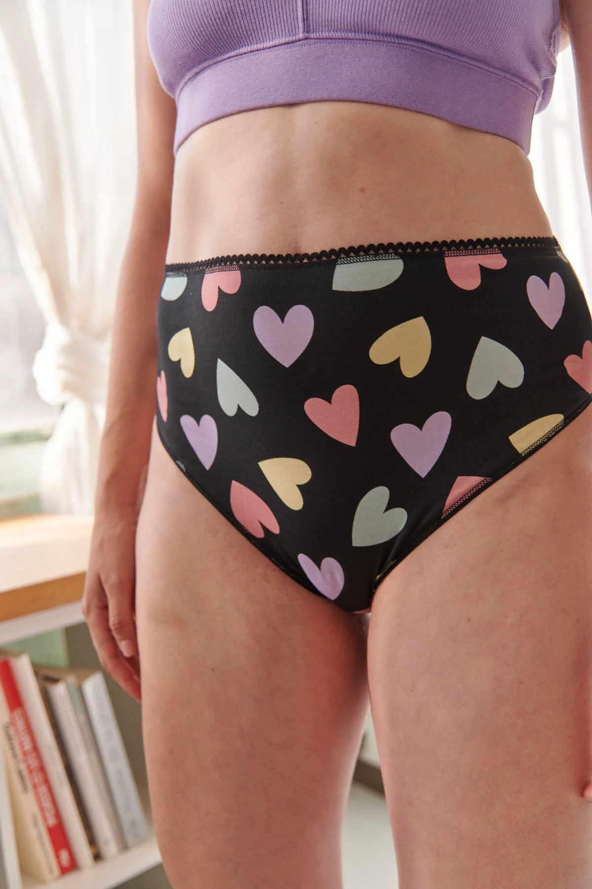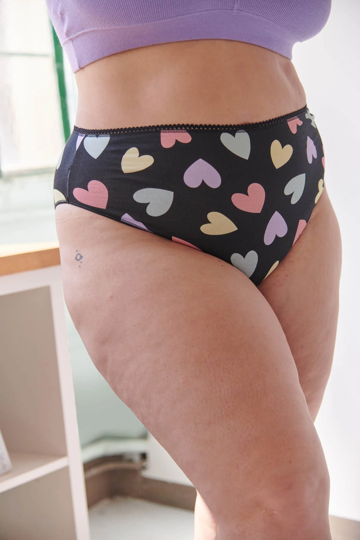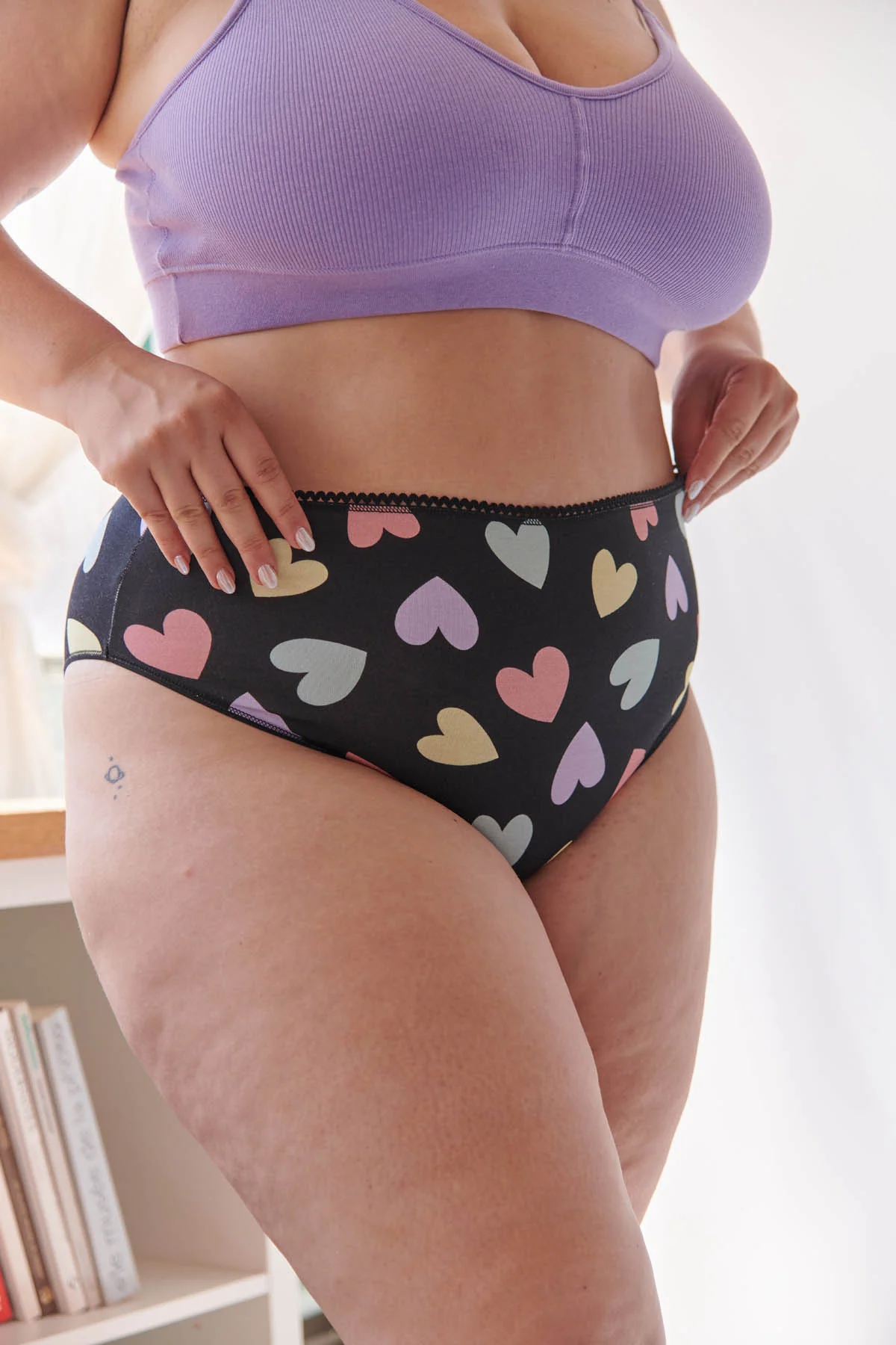 D’ailleurs, cette culotte taille haute en coton bio imprimé cœurs multicolores fait partie de notre collection Flashback, une ode aux années 80 et à leur liberté stylée. On a ressuscité cette énergie dans des pièces modernes, hyper confortables, mais toujours avec ce petit twist rétro.