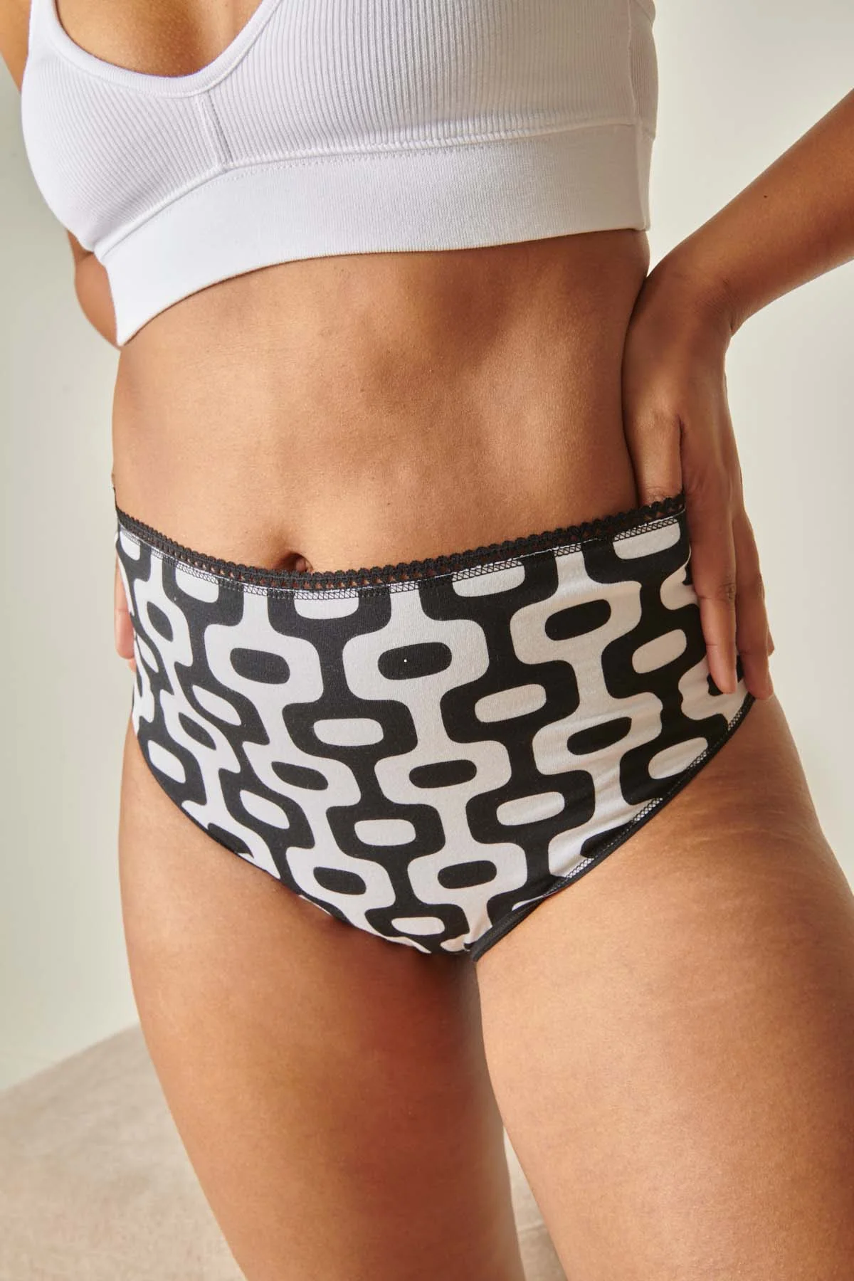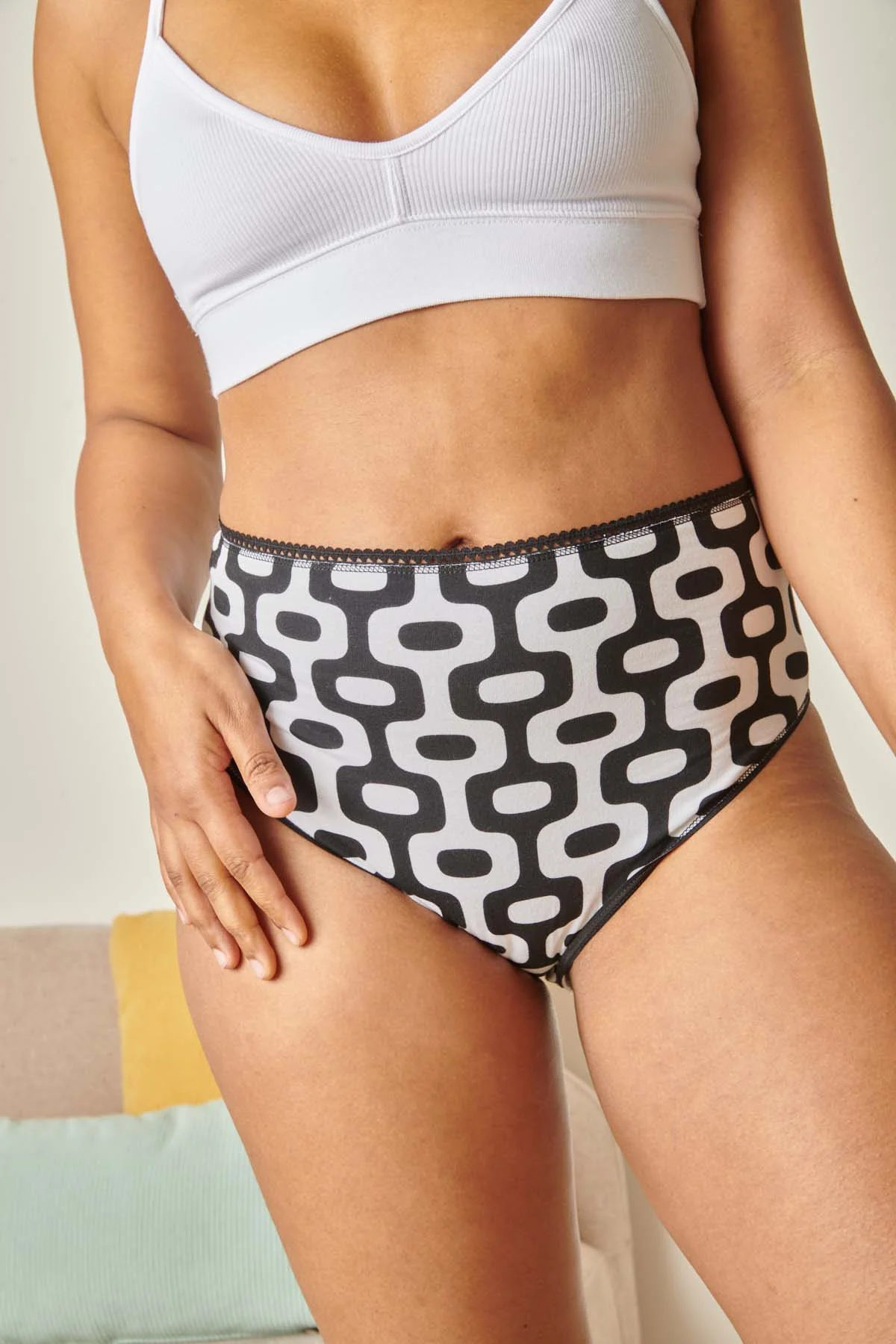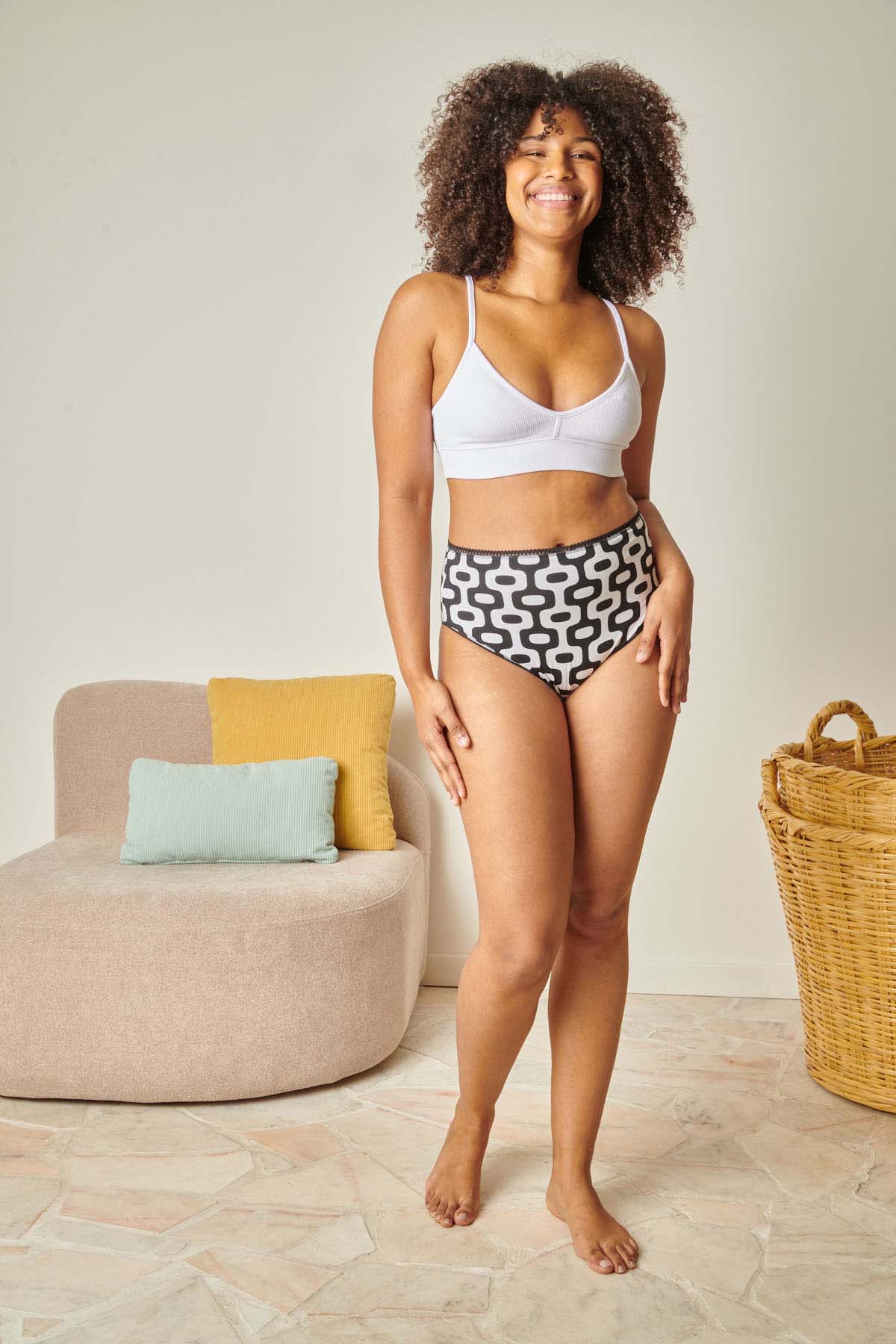 Et cet imprimé géométrique fort avec un noir audacieux, on en parle ? Car cette culotte en coton bio fait partie de notre collection appelée Paraíso, inspirée de l’incroyable ville de Rio. 🌞