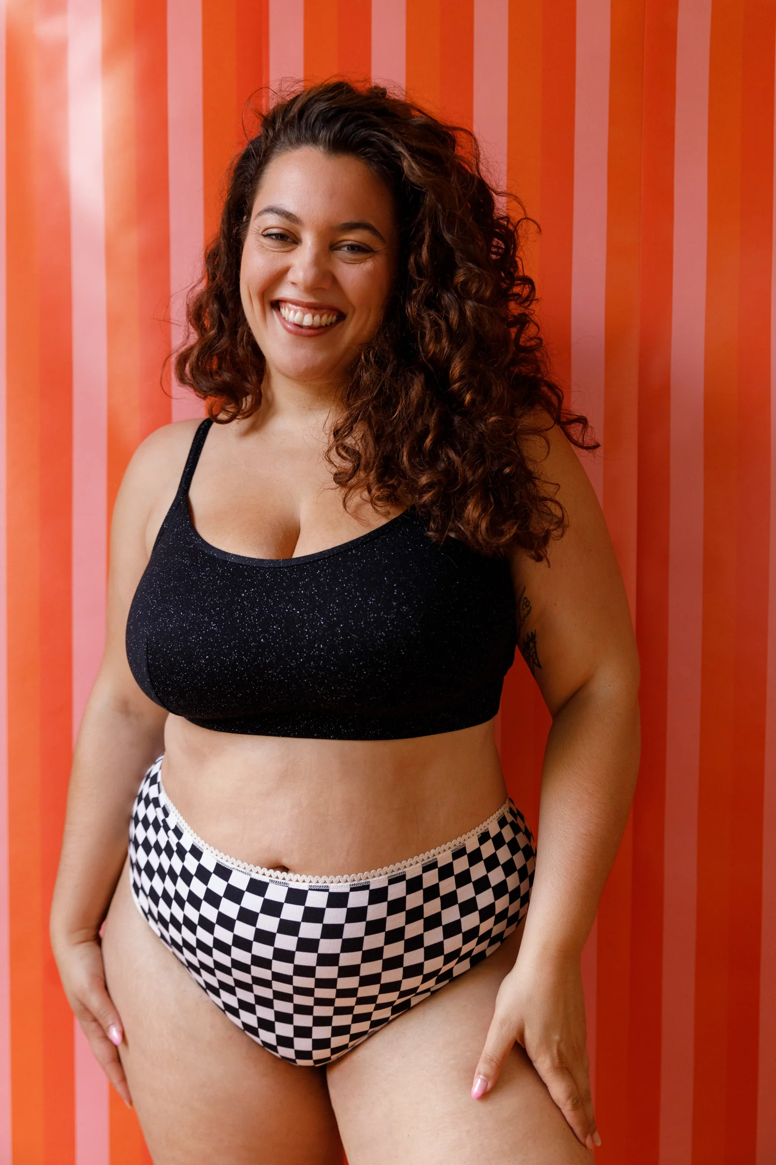Cette culotte Taille Haute à damiers noirs et crèmes fait partie de notre collection Disco Diva, qui célèbre l’énergie flamboyante des années 70 en mettant à l’honneur des motifs et des couleurs à la fois rétros et résolument modernes. 🪩
