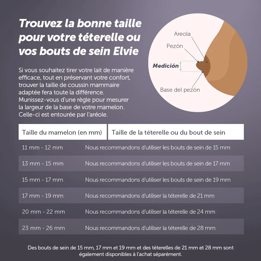 Pour un tirage efficace et confortable, il est essentiel de trouver la taille de téterelle adaptée. Et, justement, Elvie a pensé aux mamans qui ont besoin d’une téterelle de