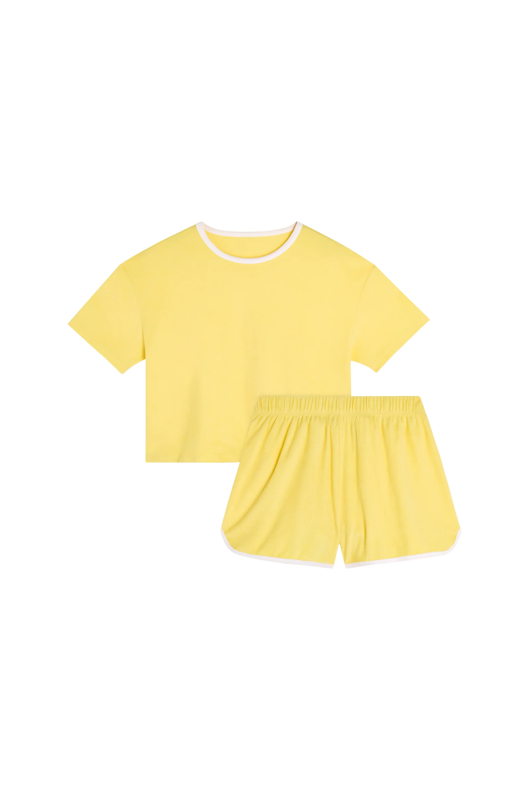 S’il y a bien une pièce à embarquer dans votre valise cet été, c’est cet ensemble en tissu éponge jaune, délicatement bordé de blanc. 🍉