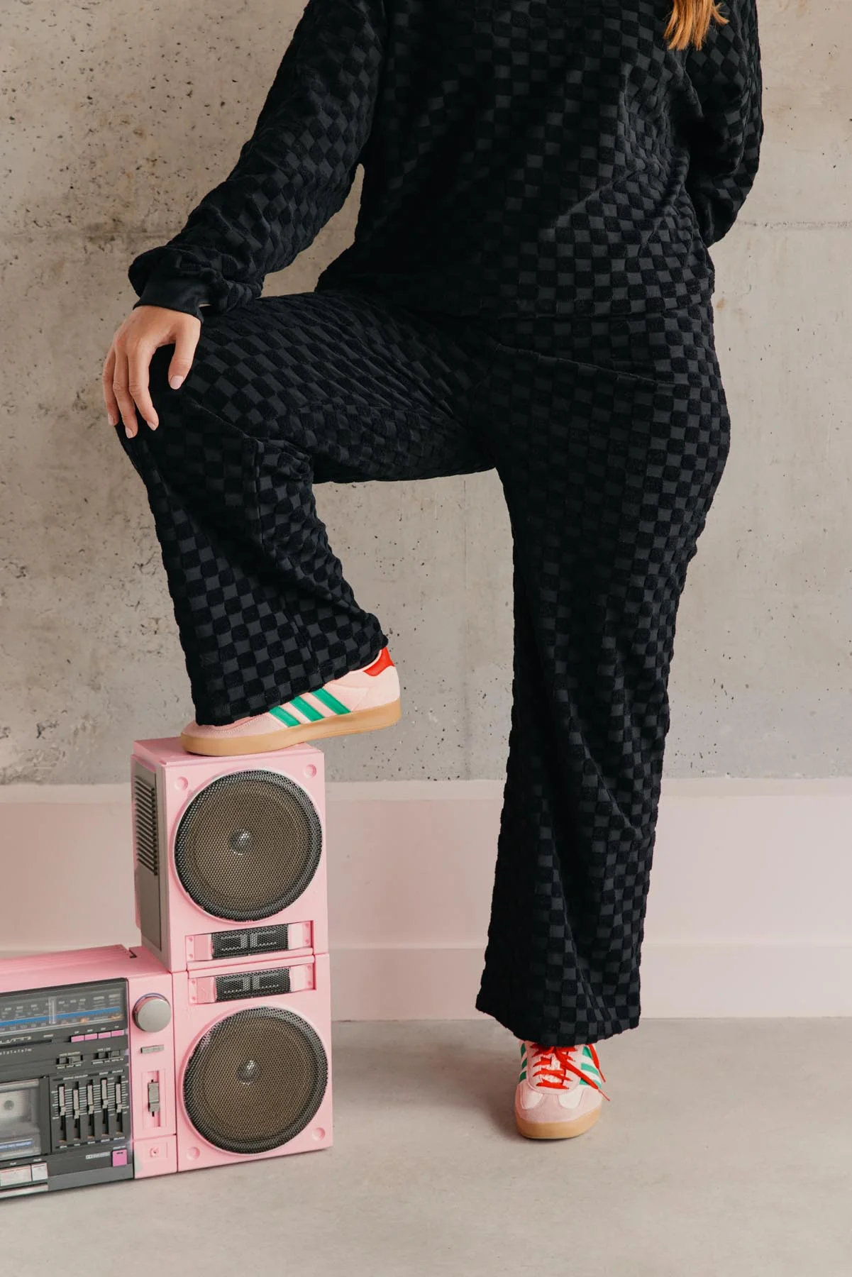 Et voilà le résultat : un sweatshirt et un pantalon avec un damier qui joue sur les textures, et un relief qui lui donne cette vibe vintage uuultra cool.