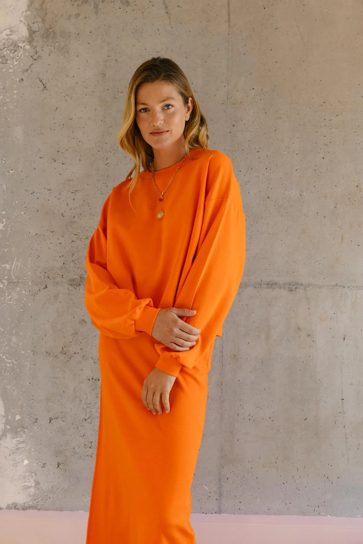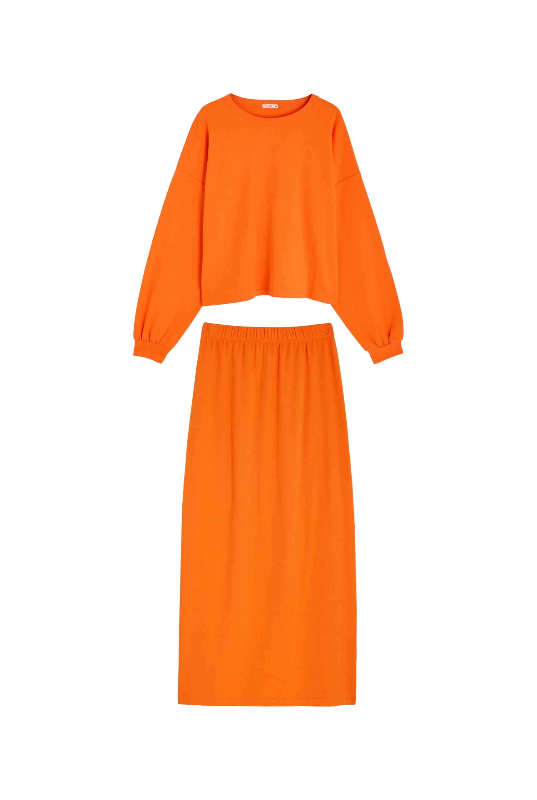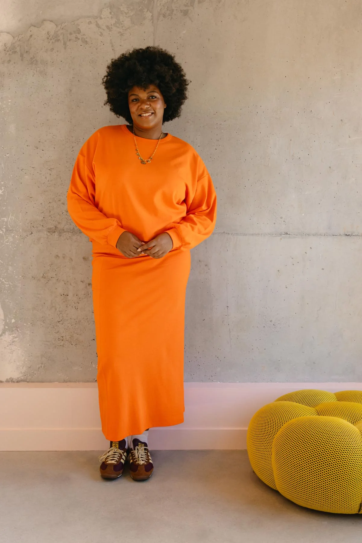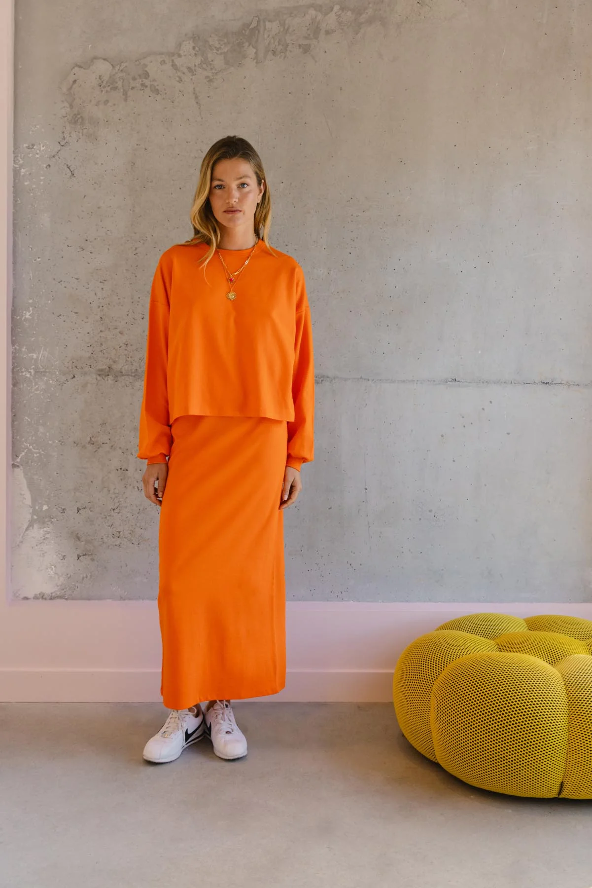 Ce sweat et cette jupe orange font partie de notre collection Flashback, une ode aux années 80 et à leur liberté stylée. On a ressuscité cette énergie dans des pièces modernes, hyper cosy, mais toujours avec ce petit twist rétro.