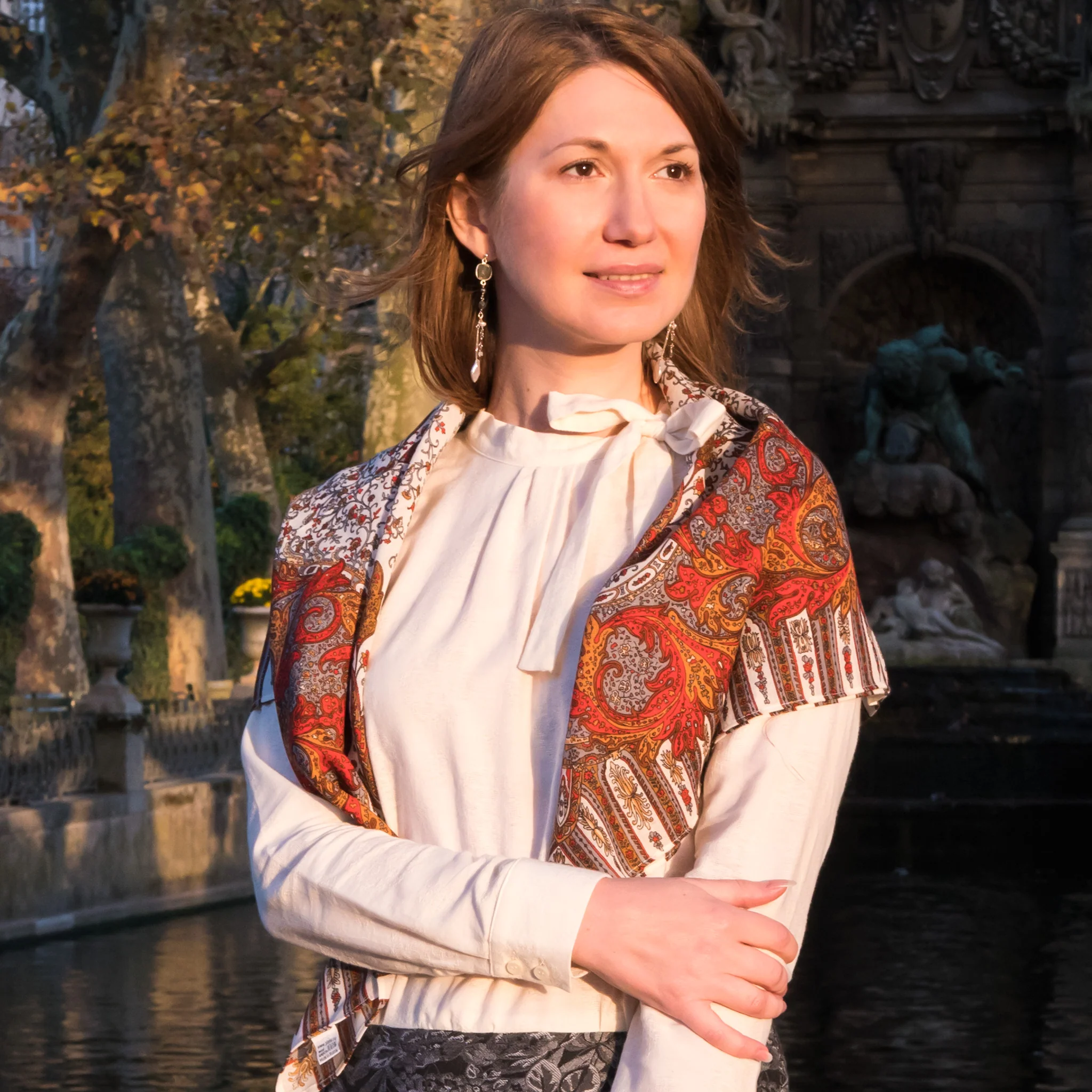 Porté avec une tenue sobre et chic, le foulard russe devient un accessoire sophistiqué et singulier. Pour apporter un côté artisanal avec une touche d’originalité, portez le en hiver avec une veste au motif « prince de Galles » discret ou avec un manteau en drap de laine à une jolie texture.