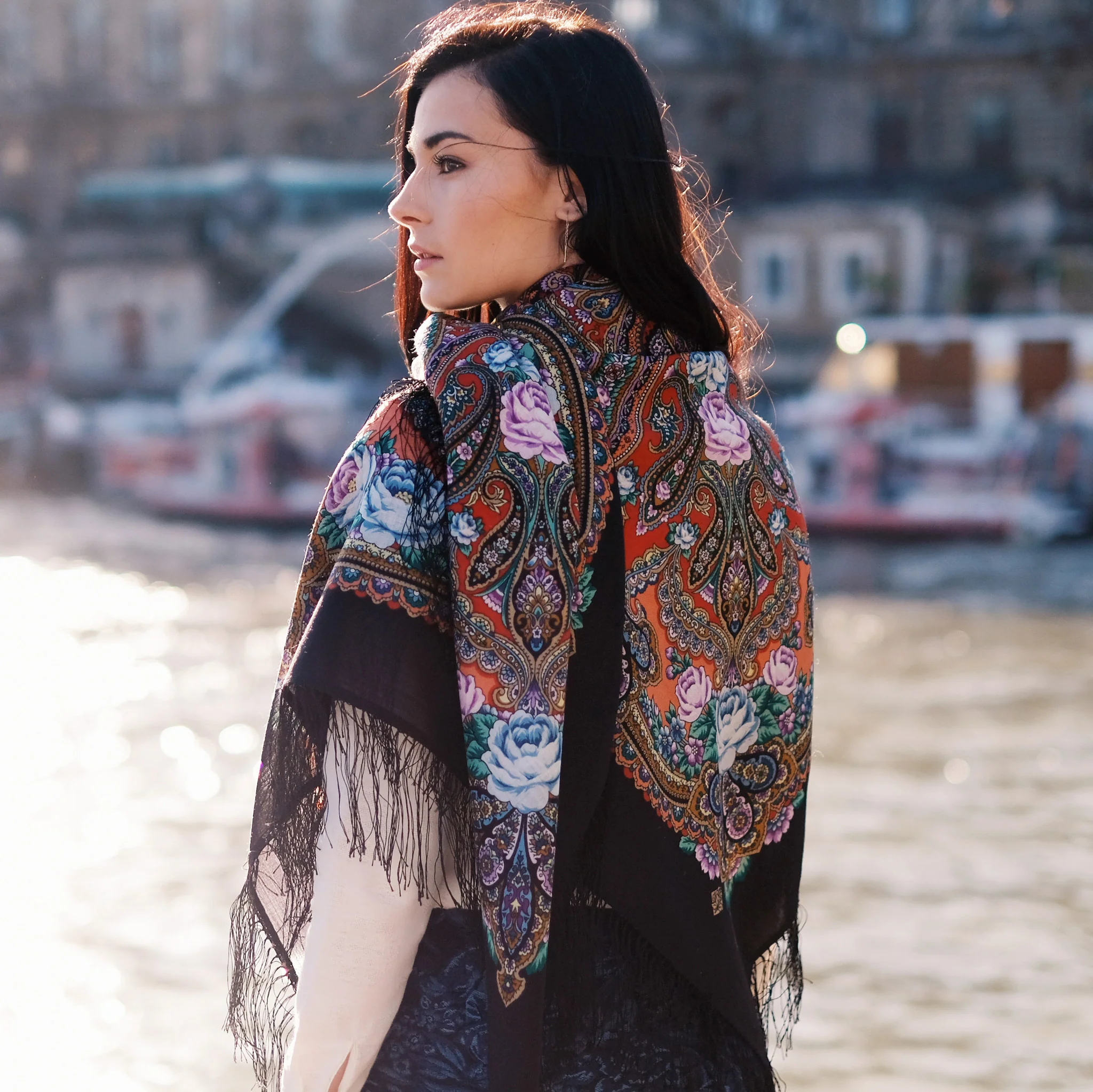 Porté avec une tenue sobre et chic, le foulard russe devient un accessoire sophistiqué et singulier. Pour apporter un côté artisanal avec une touche d’originalité, portez le en hiver avec une veste au motif « prince de Galles » discret ou avec un manteau en drap de laine à une jolie texture.