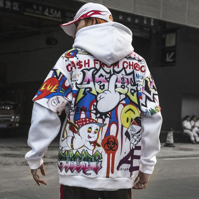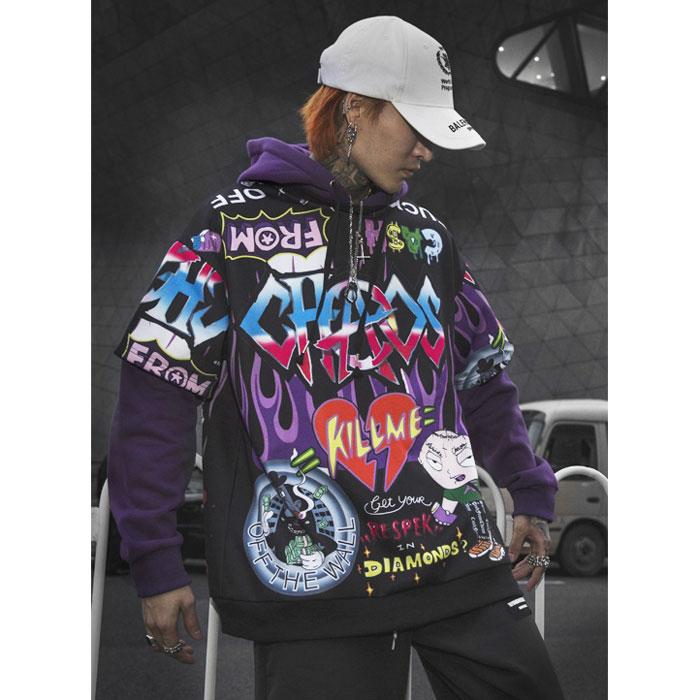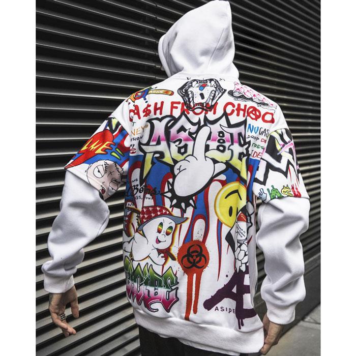 Le Hoodie CHAOS est un sweat-shirt à capuche de style hip hop. Ce sweat à capuche est un vêtement à manches longues et dispose comme son nom l’indique d’une capuche. Il est fabriqué à partir de la combinaison de polyester et de coton. Le Hoodie « Chaos » est un vêtement qui dispose de tas d’illustrations imprimées en mille et une couleur à l’avant et à l’arrière. L’harmonie des couleurs, la forme des caractères et des dessins fait de ce sweat un vêtement charmant. Le vêtement est disponible en deux couleurs, le blanc et le violet. Tu auras donc la possibilité de choisir.