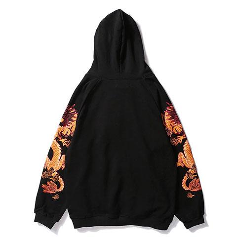 Ce sweat à capuche à la coupe oversize présente deux dragons mythologiques orange sur les manches avec le logo » Unusual » sur la poitrine, parfaitement assorti à la couleur noire du sweatshirt. Comme la plupart des dragons asiatiques, ces créatures ont une forme serpentine telle que représentée dans la culture japonaise, ce qui permet à l’illustration de prendre toute la longueur des manches.