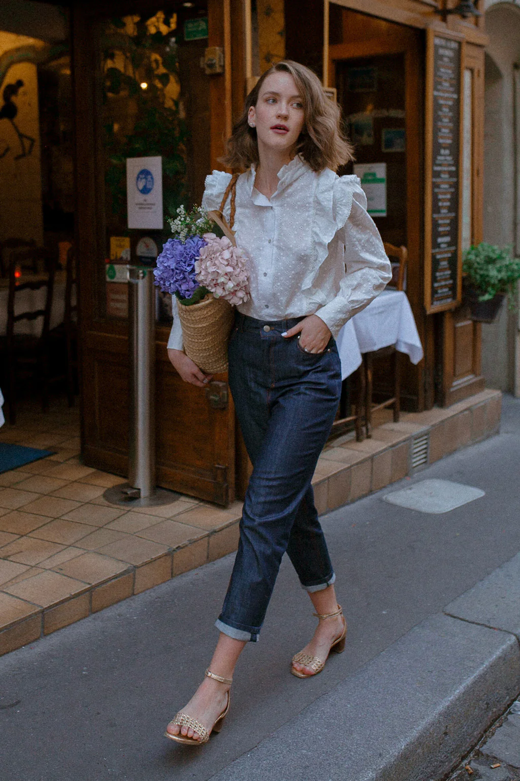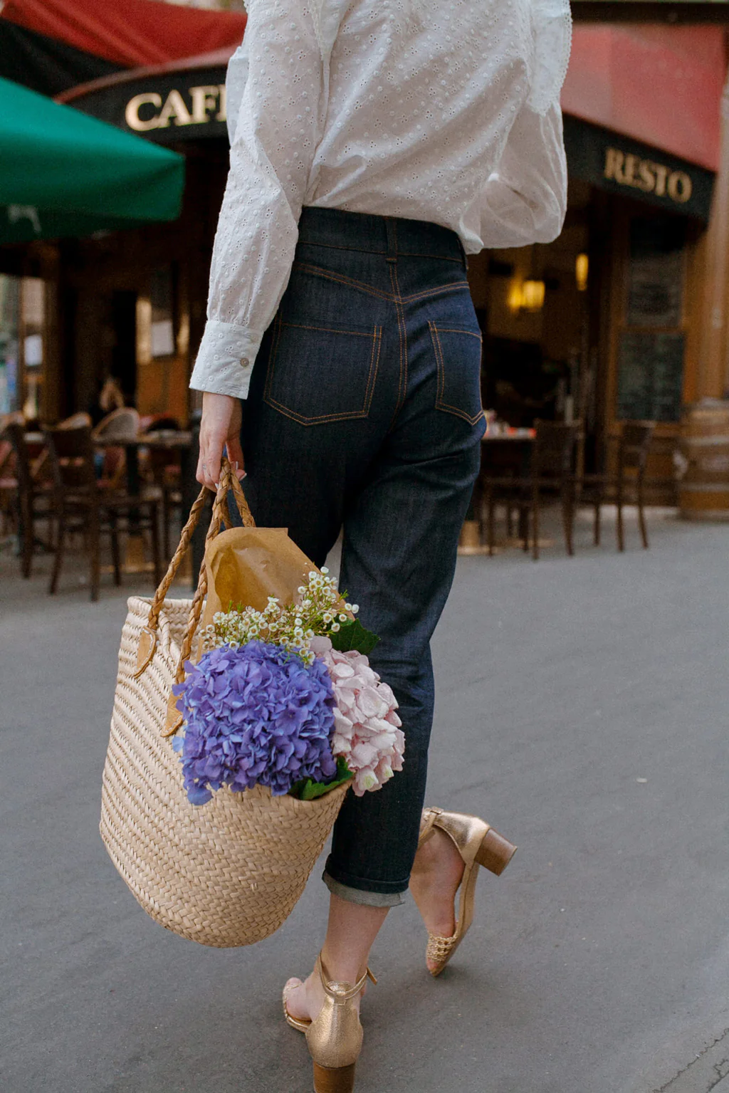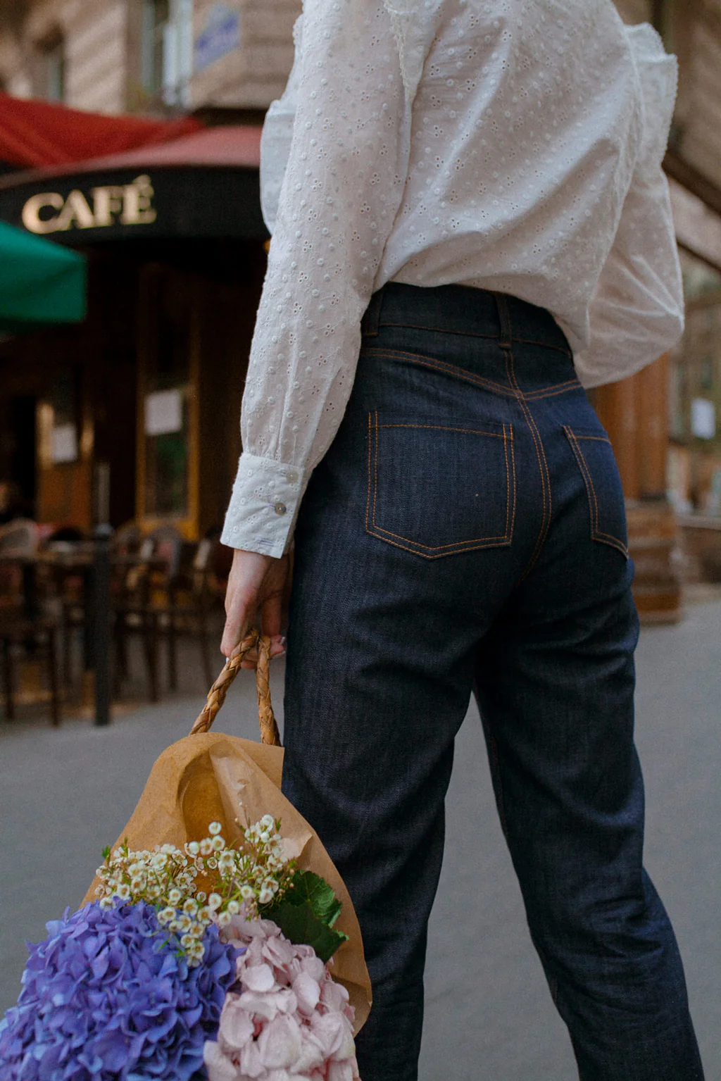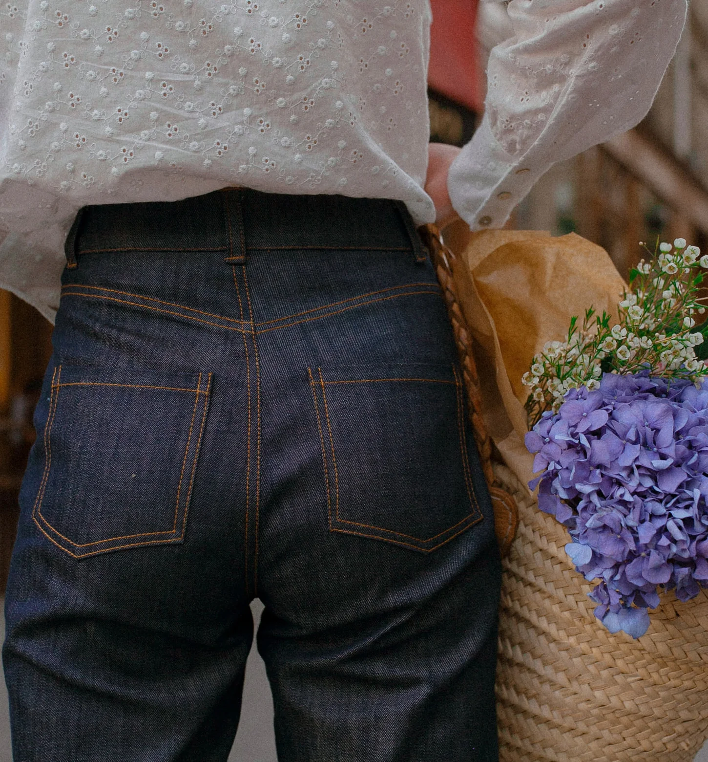 Nous avons surtout travaillé sa coupe qu’on a voulu parfaite (presque ;)) ! Elle souligne vos lignes vous laissant à l’aise. Sa taille haute aplatit le ventre. La longueur 7/8 dévoile les chevilles et allonge. Les poches en arrière ont une forme et une position flatteuse, et apportent une esthétique vintage