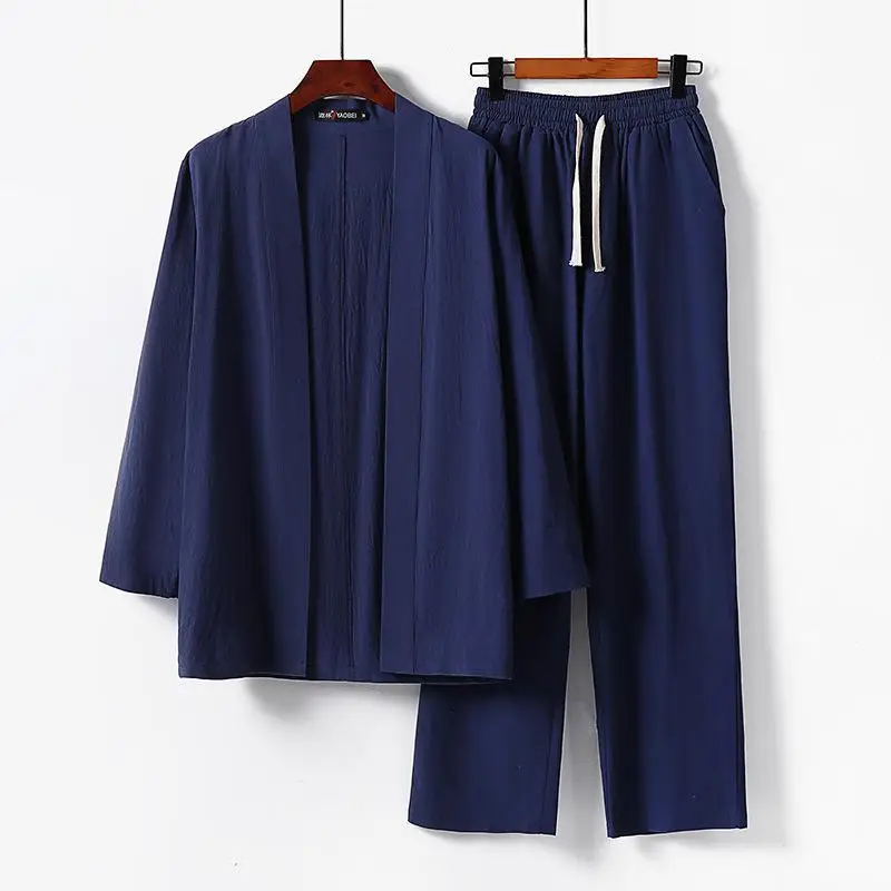 - Adoptez le charme du Jinbei homme léger ouvert, un ensemble japonais traditionnel composé d’un haut croisé et d’un pantalon assorti.