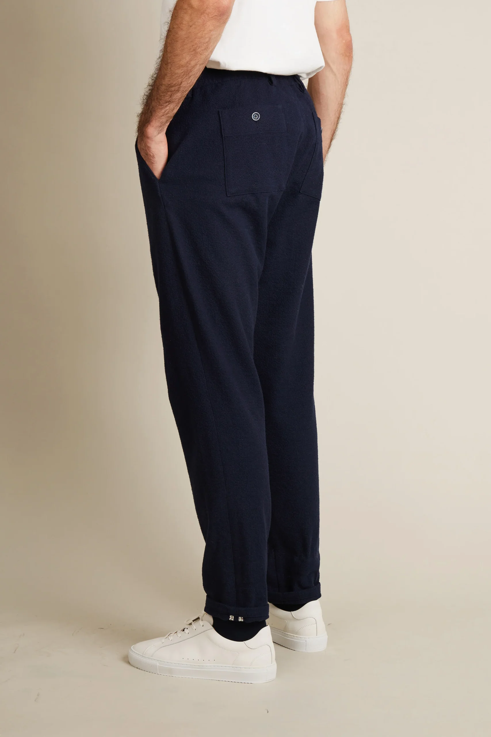 Le Jogpant Seersucker de laine est un pantalon qui bouscule les codes : un mix entre confort sport et l’élégance de la flanelle. Sa toile, développée en Italie par Subalpino, allie le tissage seersucker à un mélange de laine et de coton foulé pour un toucher proche de la flanelle. Le résultat ? Une matière texturée originale, avec la capacité d’allier chaleur et respirabilité. Il incarne parfaitement l’ADN de LePantalon : un essentiel élégant, pratique et durable, pensé pour vous suivre au quotidien.