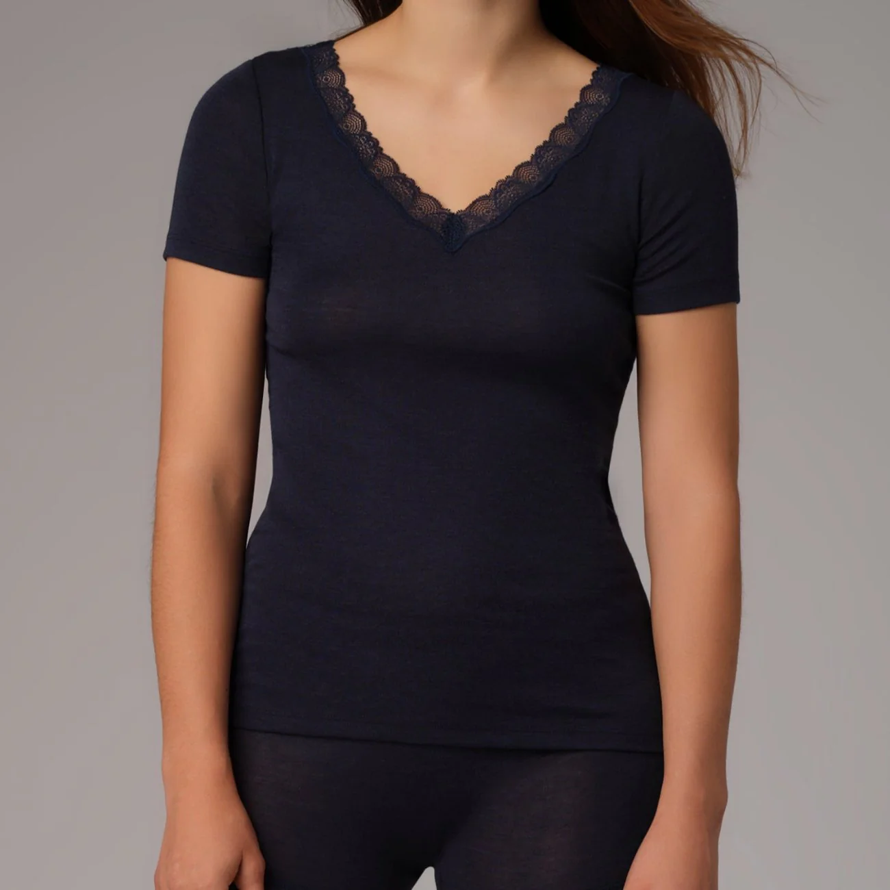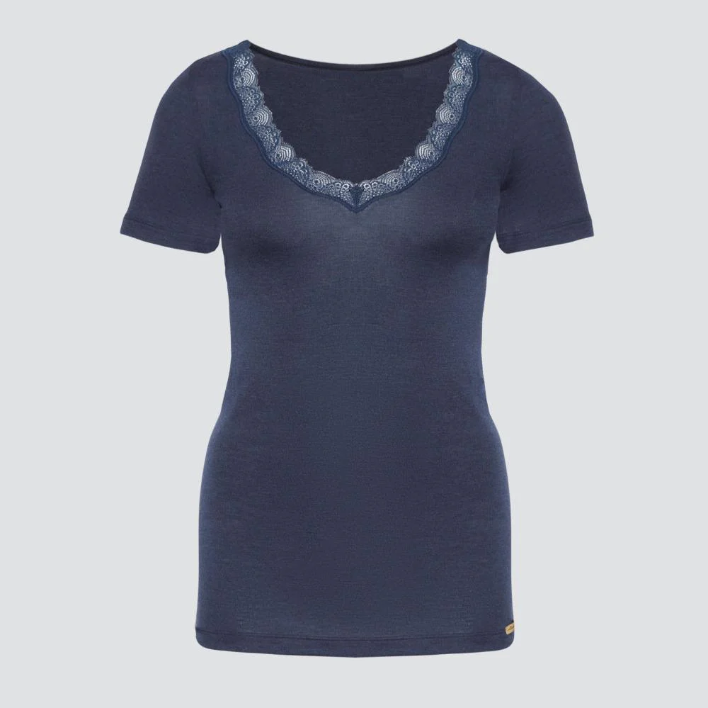 Son col en V délicatement bordé de dentelle ajoute une touche féminine et élégante, tandis que son dos bien couvert et l’absence de coutures latérales garantissent un tombé parfait et un confort optimal, même porté à même la peau.
