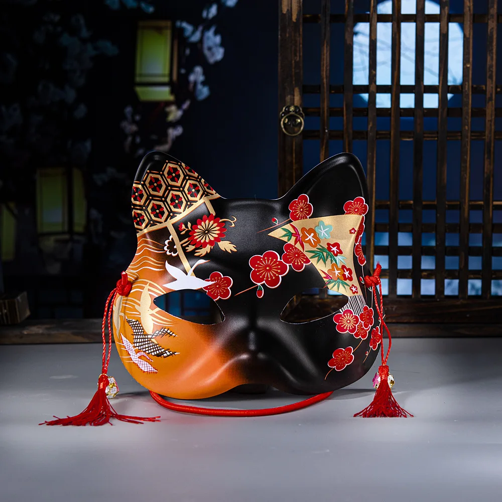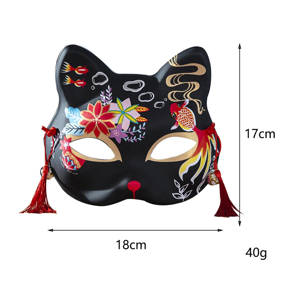 - Ce masque demi-visage incarne à la fois l’esprit du renard mythique (Kitsune) et du chat espiègle , avec des détails dessinés à la main pour un rendu unique.