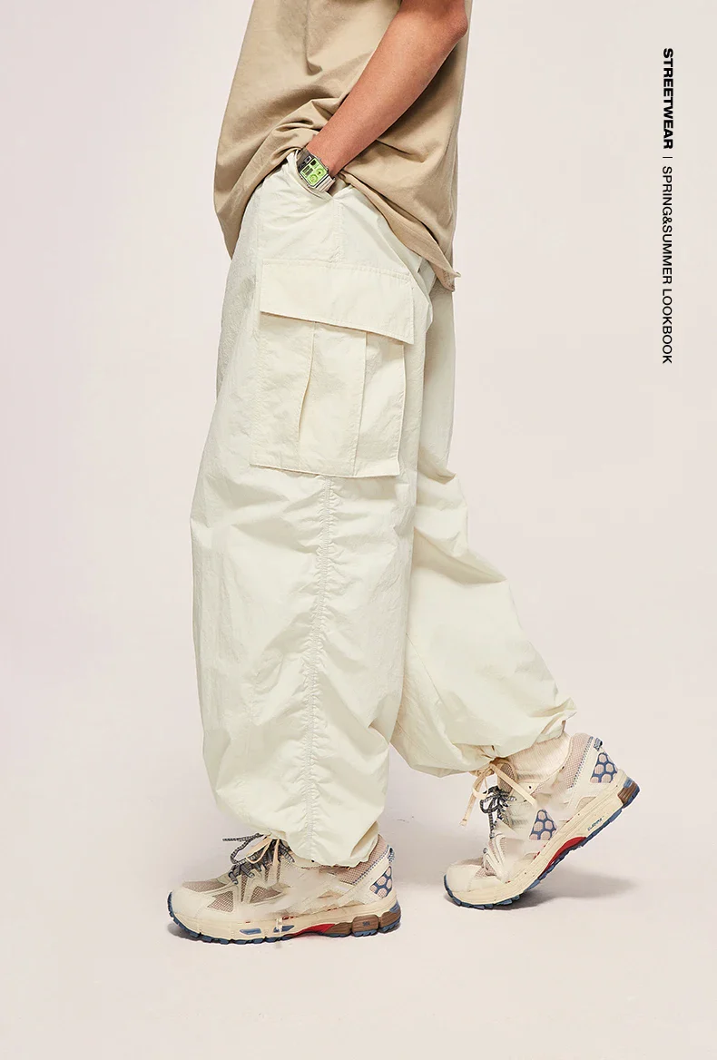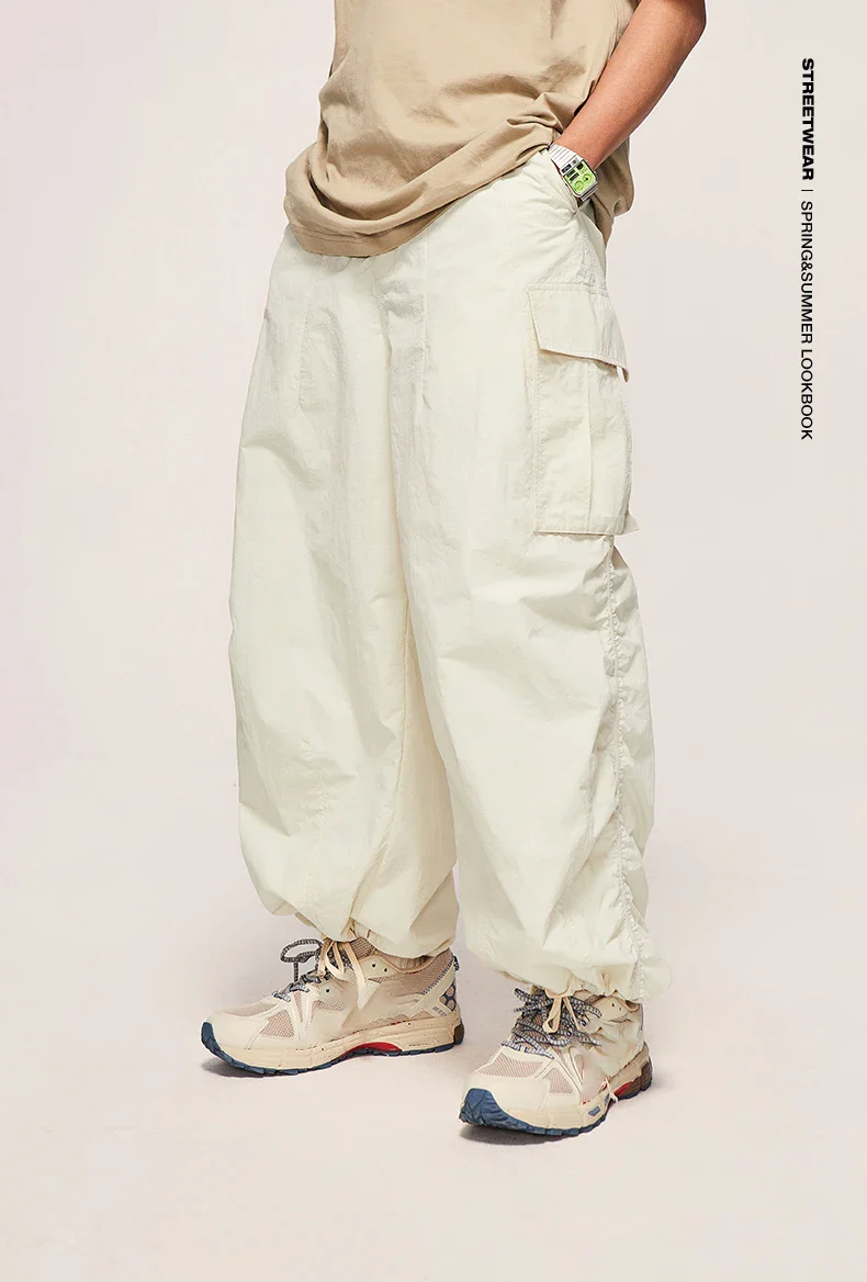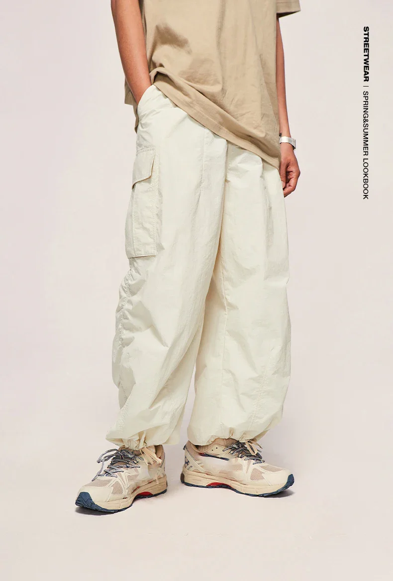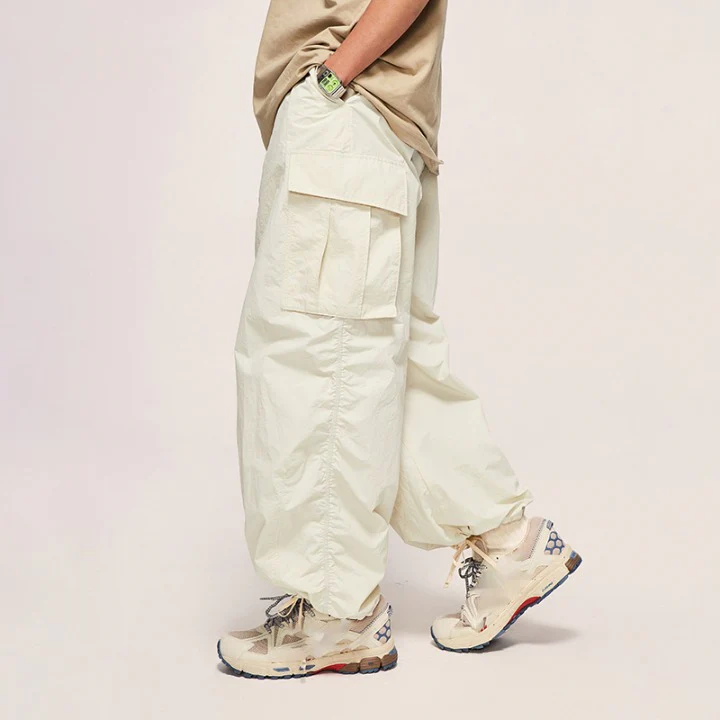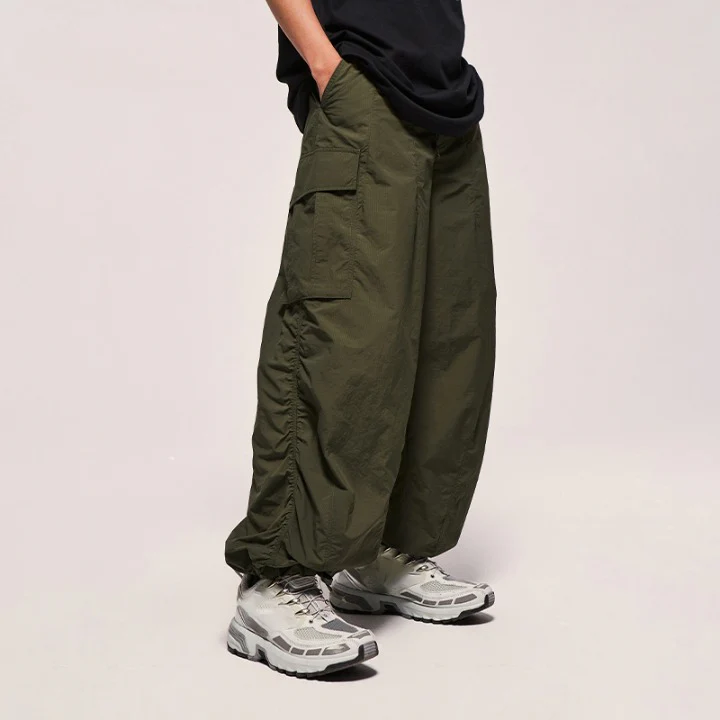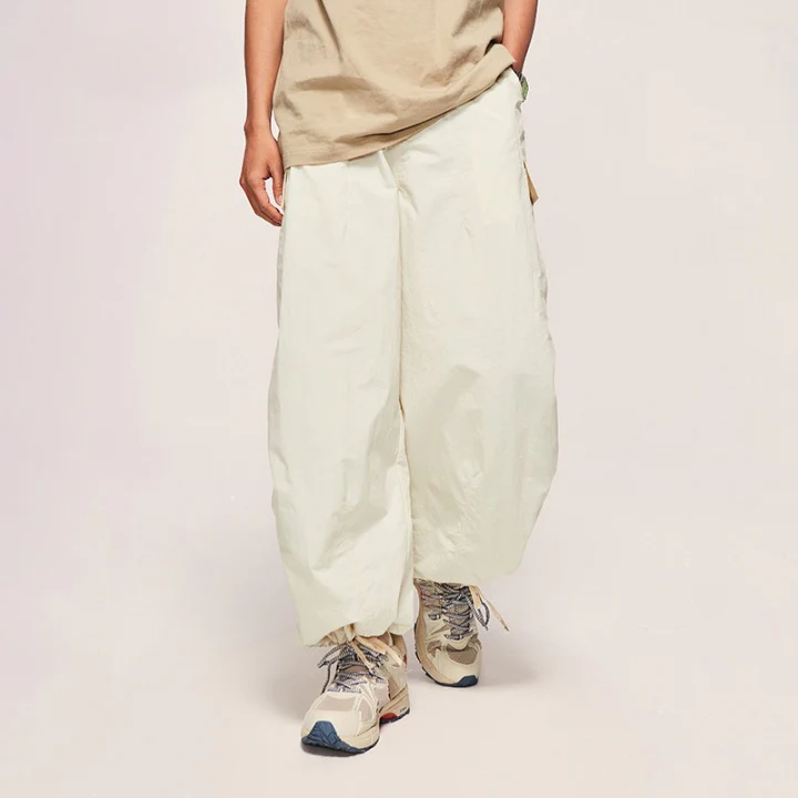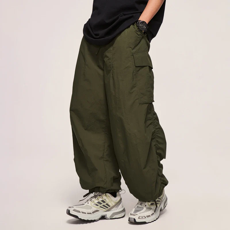 La silhouette très ample en nylon offre une allure urbaine unique. Les poches cargo volumineuses et la taille élastique avec cordon de serrage apportent une dimension fonctionnelle au design, tandis que la coupe parachute assure une silhouette caractéristique.