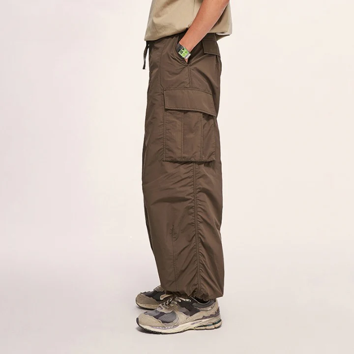 Ce pantalon cargo parachute s’inspire des tenues militaires vintage des années 90, rappelant l’esthétique fonctionnelle des surplus américains. Cette création contemporaine fusionne style utilitaire et confort moderne.
