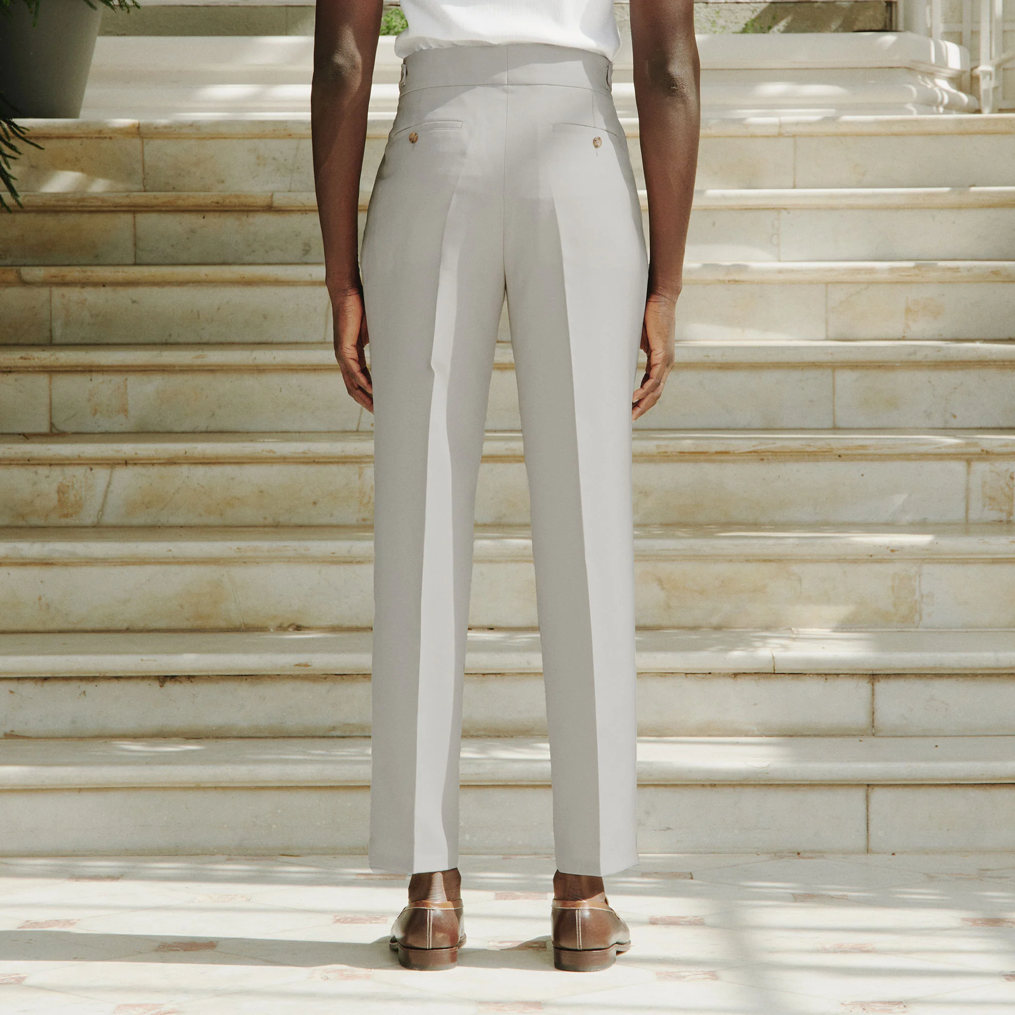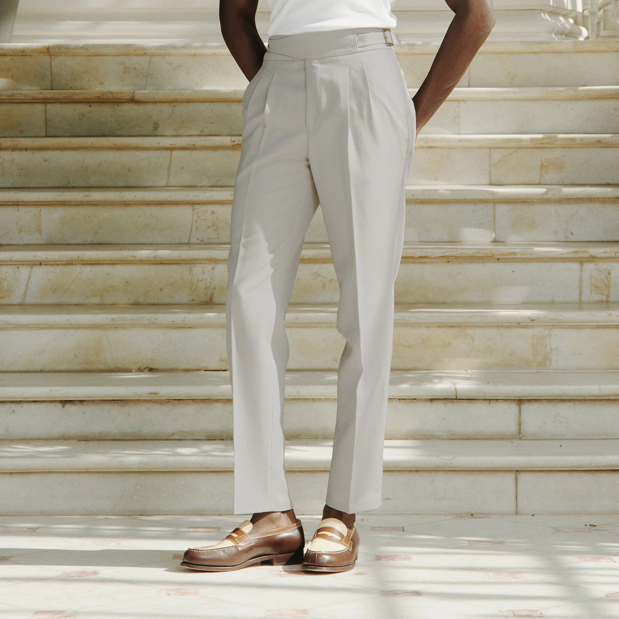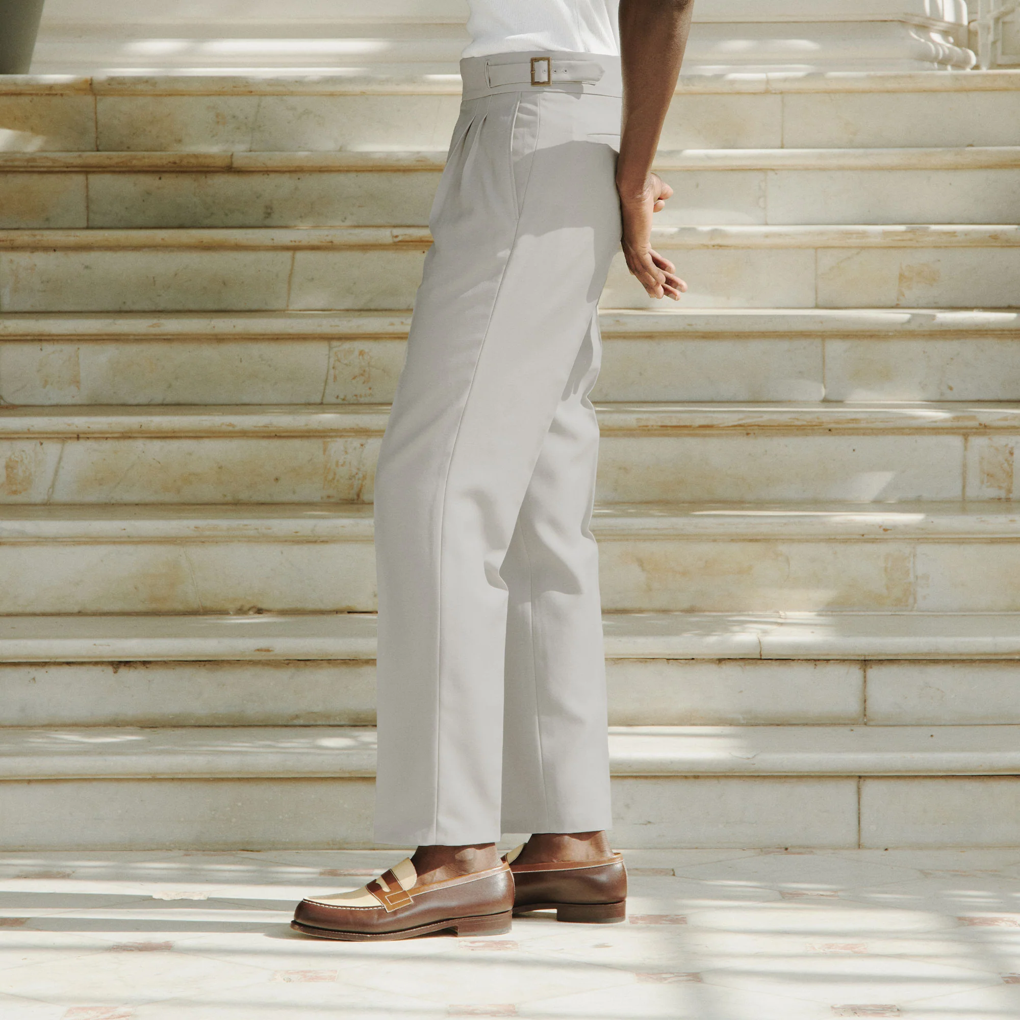 Pour la première fois, nous vous proposons l’iconique pantalon gurkha, si élégant avec sa large ceinture de 6 centimètres et ses deux boucles en métal. Elles permettent d’ajuster parfaitement la taille et d’offrir un confort optimal. Avec deux pinces, ce pantalon est d’une grande élégance et structure la silhouette.