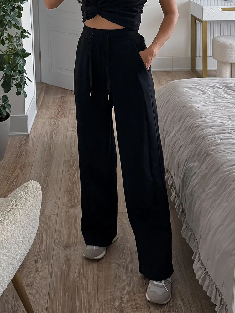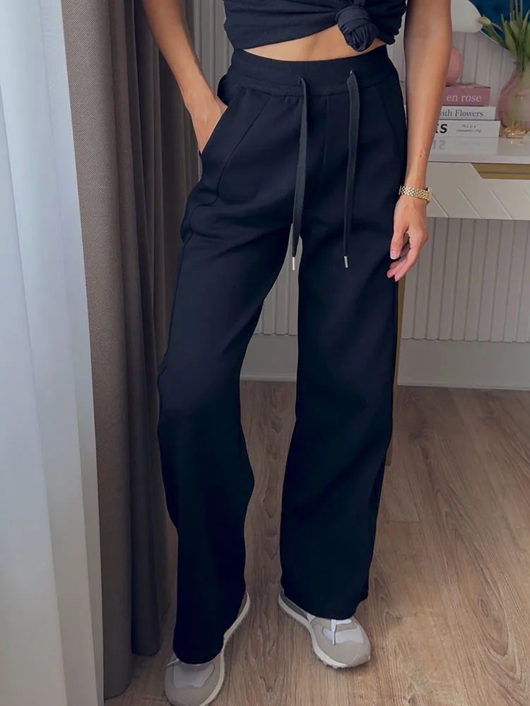 - Taille haute élastique pour un ajustement parfait et confort optimal. Pantalon à jambe droite avec détails de style cravate et couleur tendance.