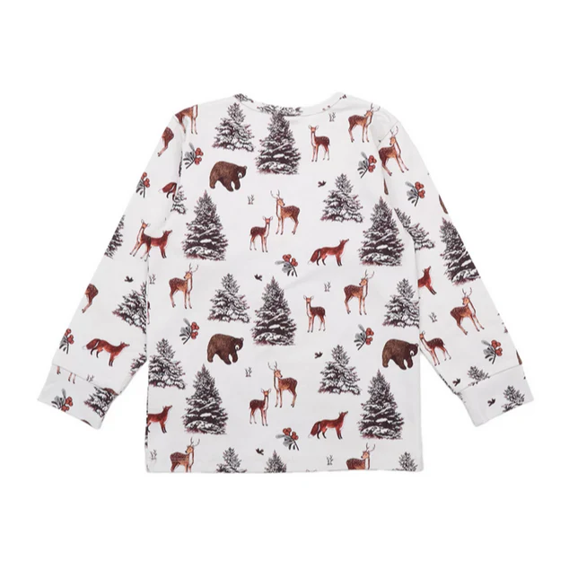- Haut à manches longues imprimé forêt : Ours, cerfs, sapins… un univers poétique pour la nuit.