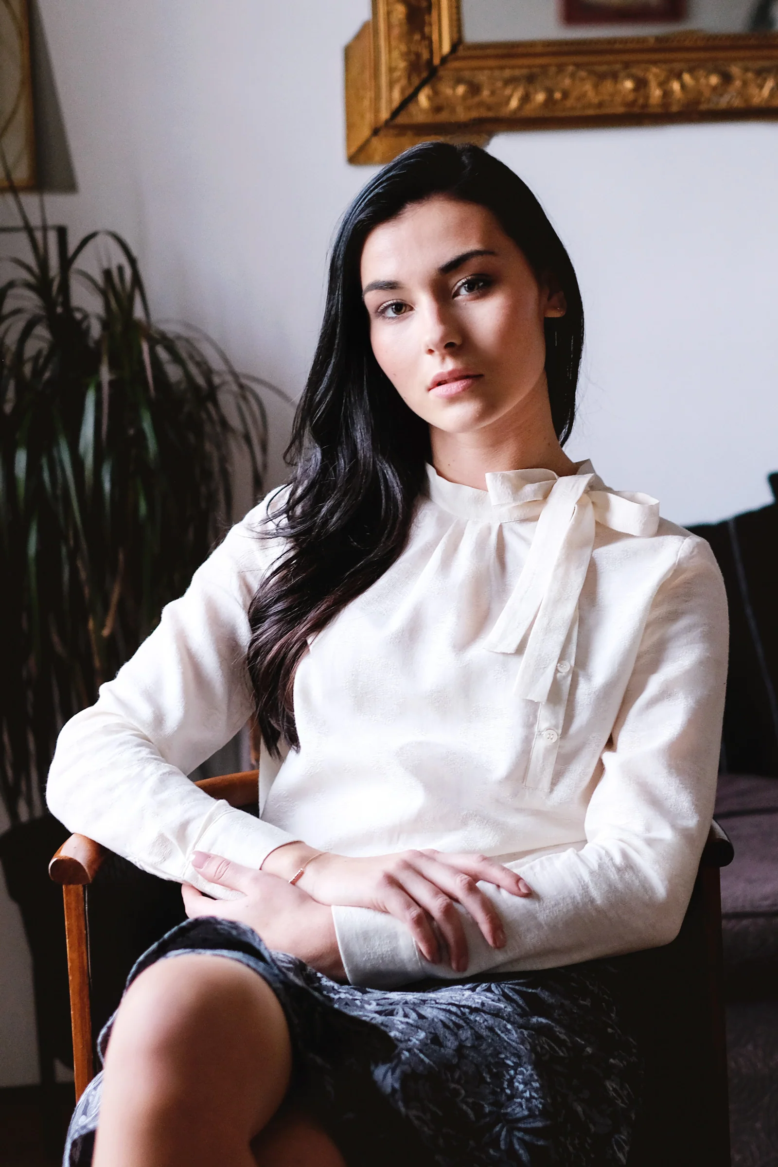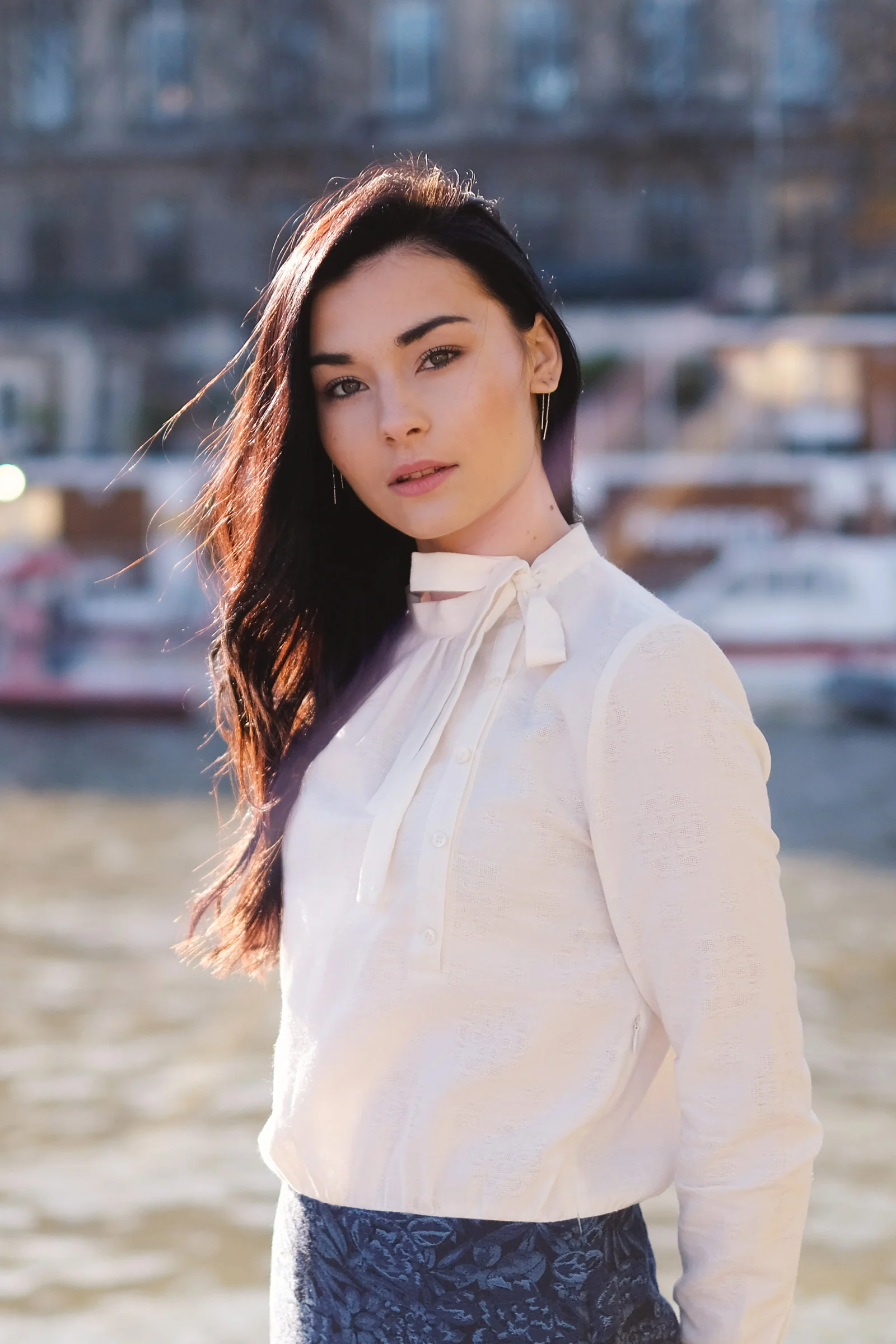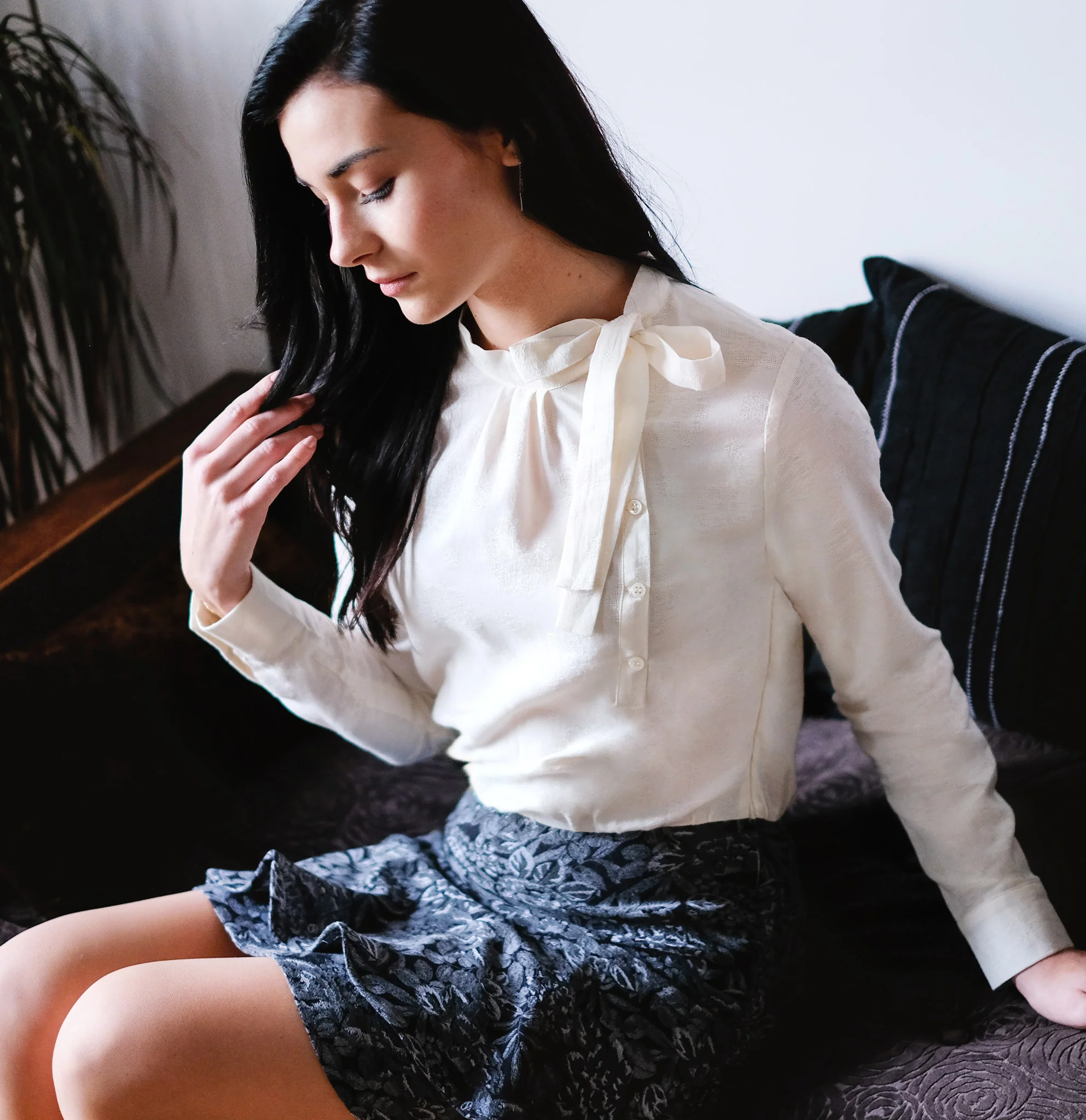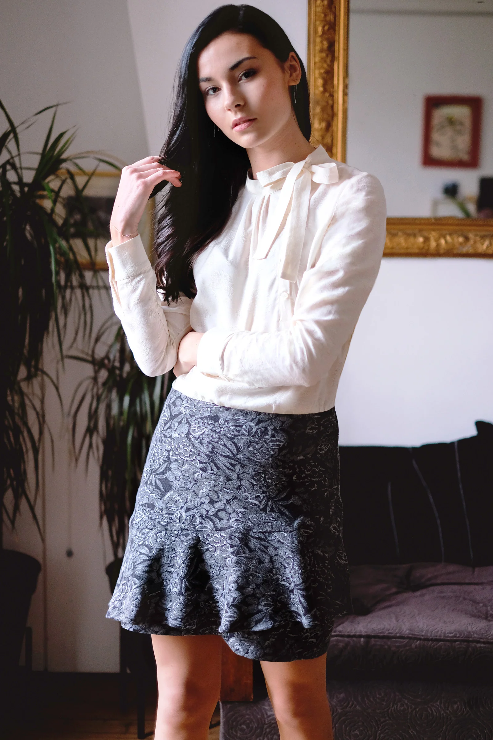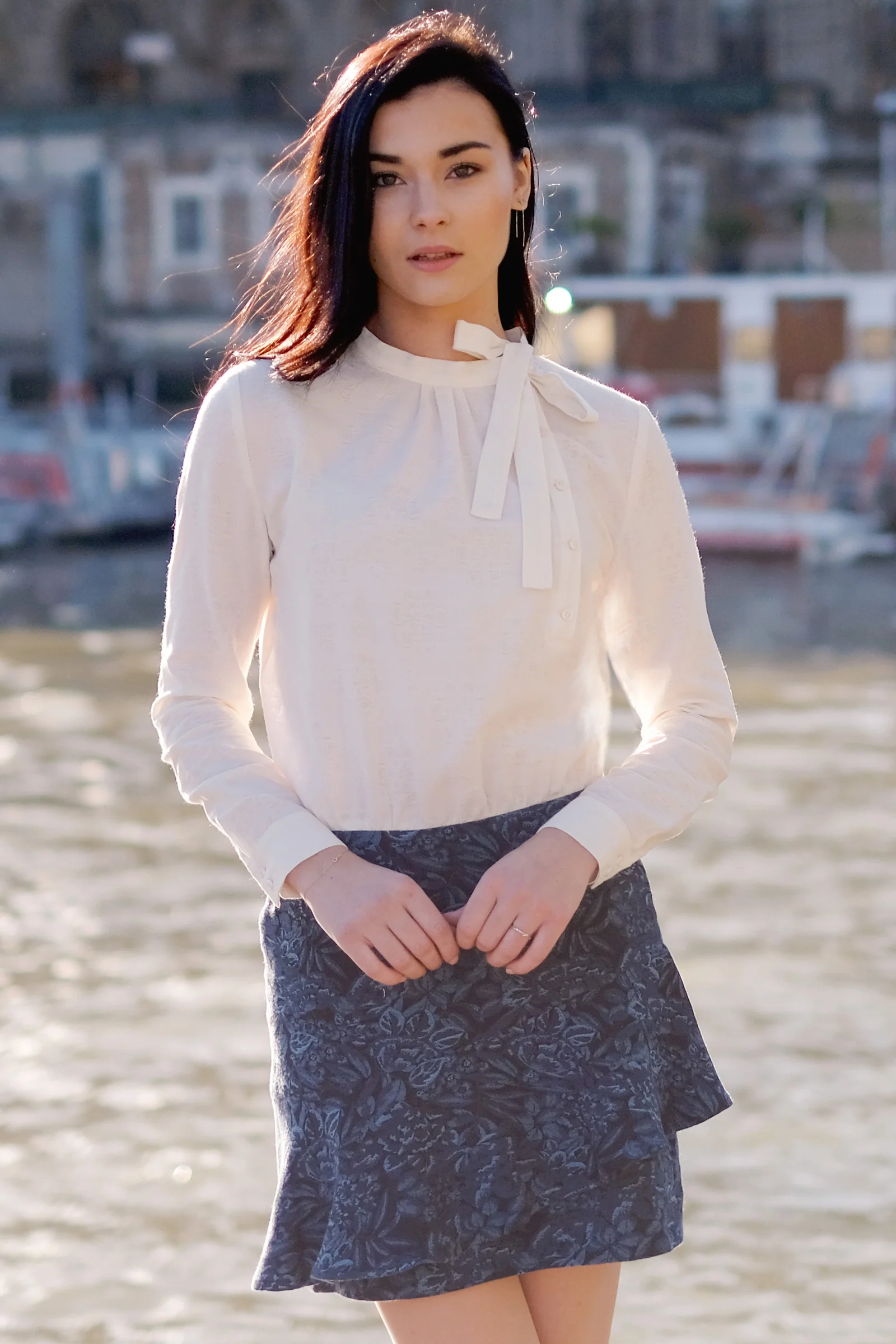 Le volant asymétrique au bas apporte un côté nonchalant mais élégant. Son col cravate se nouant sur le côté, et ses plis évoquent le chic intemporel. La fermeture sur le côté donne un plus original. Les manches longues boutonnées aux poignets, font rappel à une intemporelle robe-chemise.