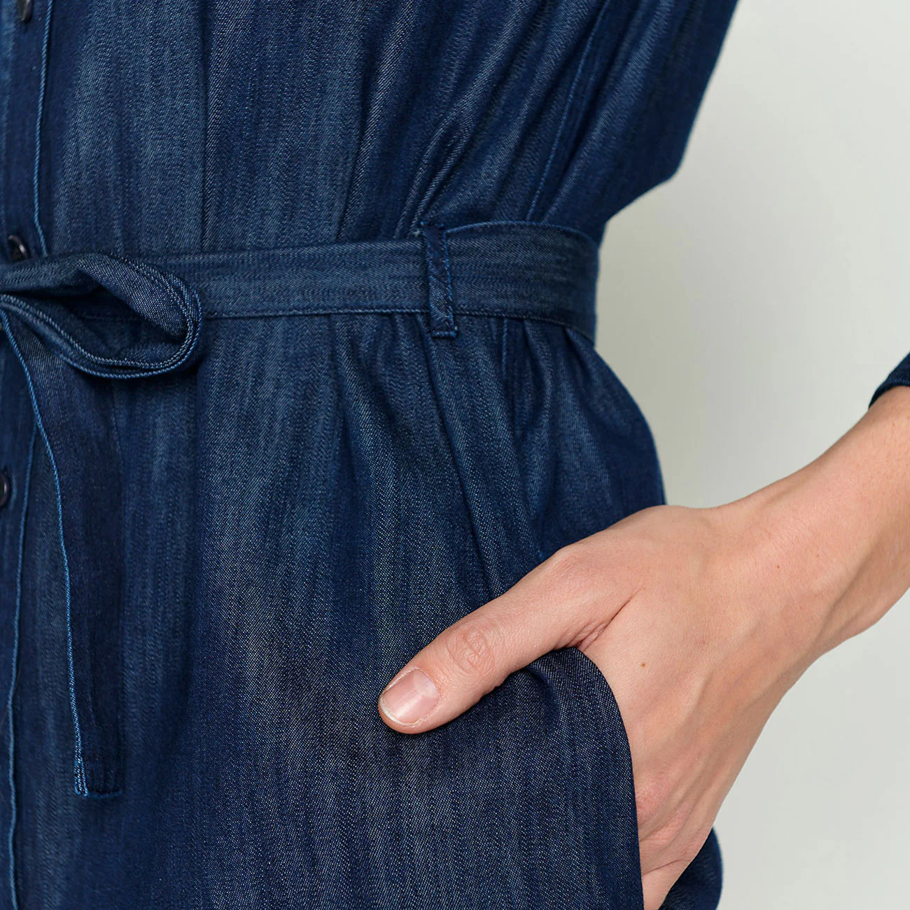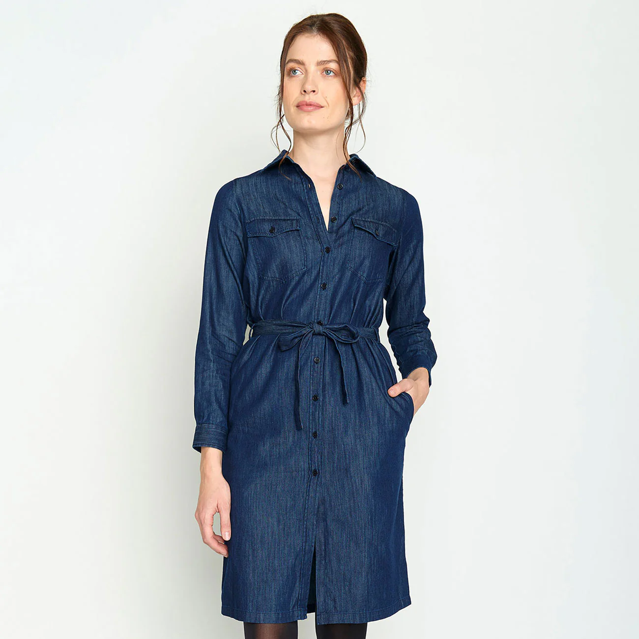 Adoptez un look casual et intemporel avec cette robe chemise en jean. Confectionnée en 100 % coton biologique certifié GOTS, elle allie confort, légèreté et engagement écoresponsable.