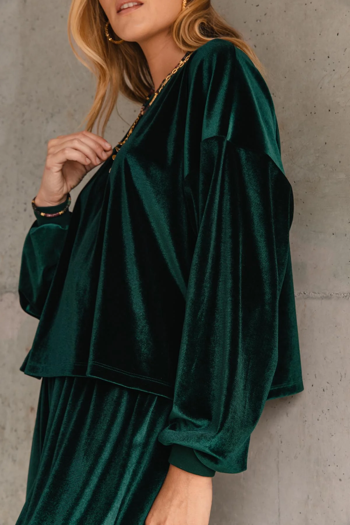 « Effortless chic », c’est l’art d’avoir l’air stylée… sans lever le petit doigt. Et ce sweat en velours vert foncé, c’est exactement ça.