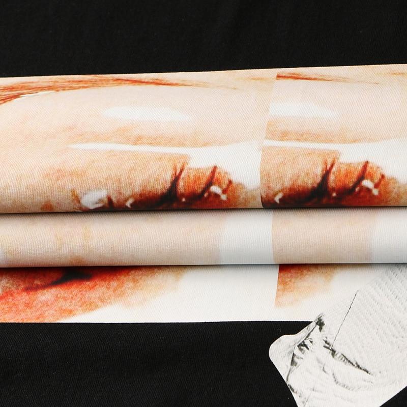 Le T-shirt « Tuchi » est un vêtement streetwear imprimée unisexe, conçu pour être porté par les hommes. Ce T-shirt fabriqué à 100 % à base de coton, c’est un vêtement de la collection printemps. Il s’agit d’un vêtement surdimensionné, disponible seulement en blanc et en noir. Le T-shirt « Tuchi », comme indiqué plus haut, est imprimé sur la quasi-totalité de sa face avant. Le graphique montre une partie du visage rougi d’une femme. On peut voir un œil, son nez ainsi que sa bouche. On peut aussi voir des lettres imprimées sur le vêtement. Aucune impression n’est réalisée à l’arrière de la chemise.