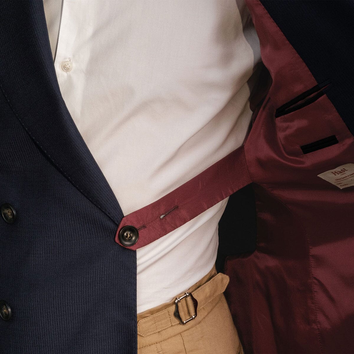 Notre veste croisée est unique à plus d’un titre. Travaillé en 100% laine vierge super 110’s de chez Marzotto, son tissu affiche un grain singulier qui prend magnifiquement la lumière. Au toucher et à l’oeil, vous profiterez de sa texture comparable à une maille ou à un natté. À l’intérieur, vous trouverez un détail rarissime, emprunté à une veste bespoke vintage confectionnée au Japon : une sangle cousue dans un pan permettant de boutonner l’autre. Cette veste croisée incarne dans notre collection capsule le nec plus ultra de l’élégance grâce à son design, son tissu et sa confection.