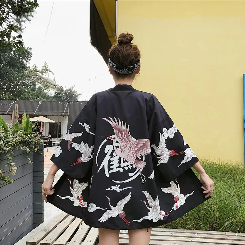 Apportez une touche d’originalité à votre garde-robe avec notre veste style kimono pour femme grues, légère et ornée de gros motifs traditionnels qui font toute la différence !