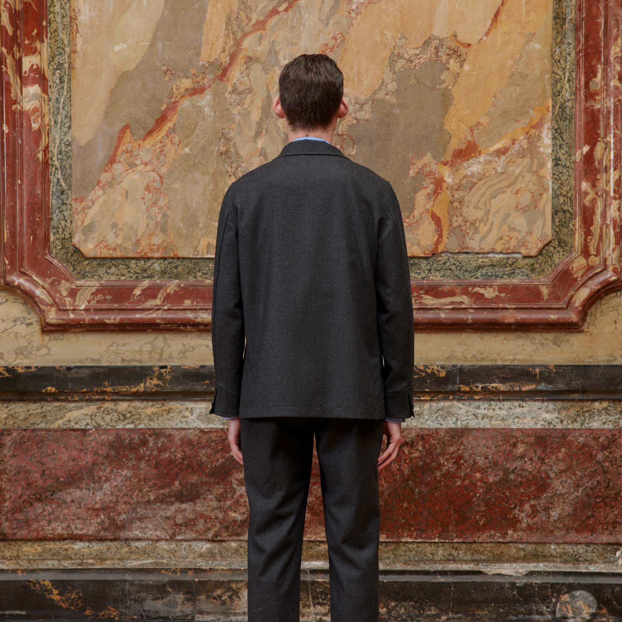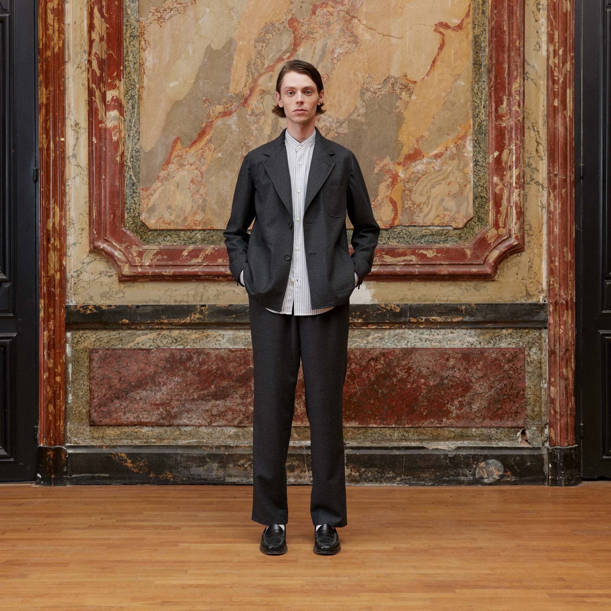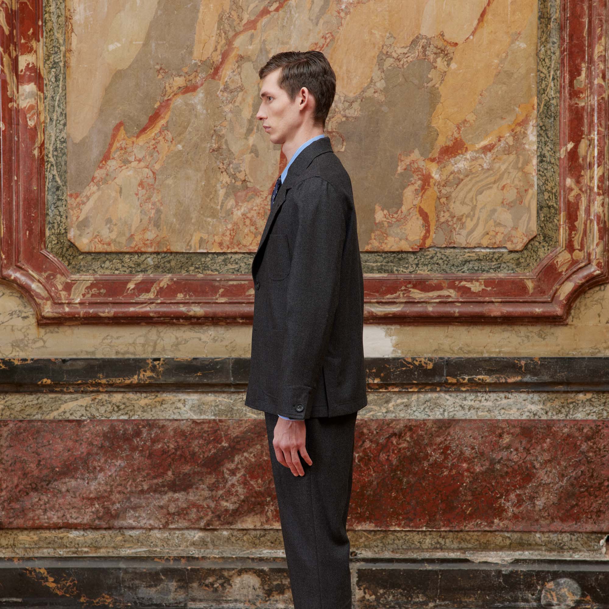 Nous avons retravaillé le col de notre veste déstructurée dans un esprit tailleur. Confectionnée dans une belle flanelle de laine de chez Marzotto, elle est souple et très agréable à porter. Elle peut se porter avec le pantalon associé à taille élastiquée pour un ensemble moderne et élégant.